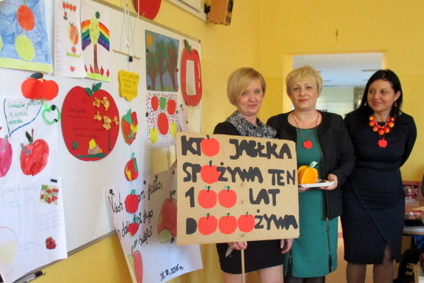 i ich przetworów jako źródła witamin. Swoją obecnością zaszczycili nas zaproszeni goście z Powiatowej Stacji Sanitarno – Epidemiologicznej w Kaliszu, Elżbieta Wojtyła - kierownik Sekcji Oświaty Zdrowotnej i Promocji Zdrowia oraz Agnieszka Stępniak - asystent Sekcji Oświaty Zdrowotnej i Promocji Zdrowia. Tego dnia sale lekcyjne, korytarze zdobiły wspaniałe dekoracje przygotowane przez uczniów i nauczycieli, których głównym motywem było jabłko. W całej szkole unosił się zapach jabłek i cynamonu. Uczniowie uczestniczyli m.in. w warsztatach literackich, plastycznych, muzycznych, matematycznych, przyrodniczych. Układali hasła dotyczące spożywania jabłek, rymowanki, redagowali opis jabłka, opowiadanie, wykonali jabłkowe przywieszki oraz mandale. Oglądali prezentację multimedialną, dowiedzieli się m.in. jakie korzyści dla zdrowia wynikają ze spożywania jabłek. Zdobyte wiadomości mieli okazję zaprezentować podczas rozwiązywania Quizu. Degustowali jabłka pod różnymi postaciami m.in. jabłka pieczone, jabłka suszone, szarlotki, soki z jabłek. W przygotowanie poczęstunku bardzo aktywnie włączyli się rodzice. Dzień minął w „smakowitej” atmosferze i dostarczył uczniom miłych wrażeń oraz witamin ukrytych w jabłkach. Dziękujemy uczniom, rodzicom i nauczycielom za zaangażowanie w realizację projektu.