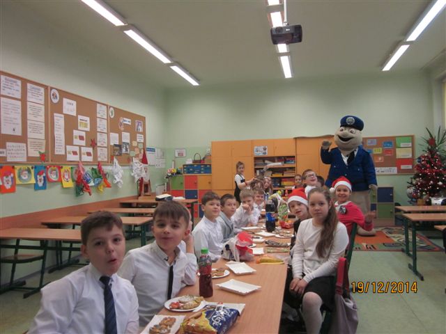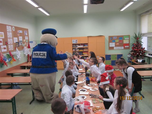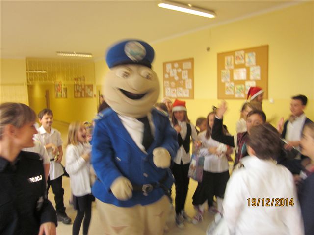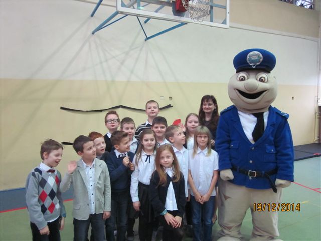19 grudnia 2014 r. uczniów kl.1-3 i oddział przedszkolny odwiedził sierżant Pyrek - maskotka wielkopolskiej Policji wraz z funkcjonariuszami Zespołu ds. Nieletnich i Patologii oraz Wydziału Ruchu Drogowego KMP w Kaliszu. Podczas spotkania funkcjonariusze m.in. przypomnieli dzieciom podstawowe zasady poruszania się po drogach. Zwrócili uwagę na zachowanie bezpieczeństwa podczas zbliżającej się przerwy świątecznej.