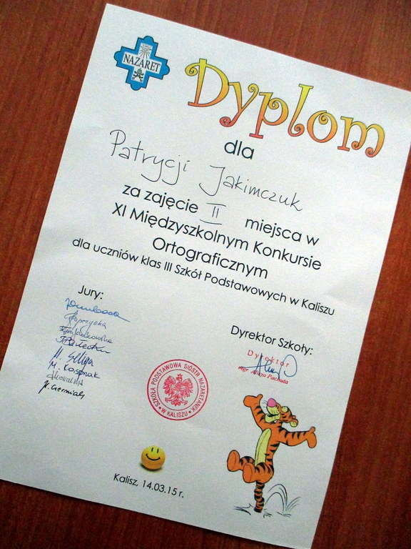 14 marca 2015 r. Patrycja Jakimczuk uczennica klasy 3b zajęła II miejsce w XI Międzyszkolnym Konkursie Ortograficznym. Organizatorem imprezy była Szkoła Podstawowa Sióstr Nazaretanek w Kaliszu. Podczas wykonywania zadań konkursowych Patrycja wykazała się świetną znajomością zasad ortograficznych. Gratulujemy! Życzymy dalszych sukcesów.