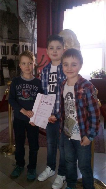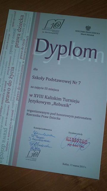 13 marca 2015 r. reprezentanci naszej szkoły (Filip Wierzbicki z kl. 3c, Mikołaj Wanat z kl. 2a i Tymon Kołpak z kl. 1b) wzięli udział w XVIII Kaliskim Turnieju Językowym "Rebusik" zorganizowanym przez Szkołę Podstawową nr 10 w Kaliszu pod honorowym patronatem Rzecznika Praw Dziecka. Zadania konkursowe dotyczyły tematyki związanej z prawami dziecka. W kategorii drużynowej nasza szkoła zajęła 3 miejsce. Serdecznie gratulujemy!