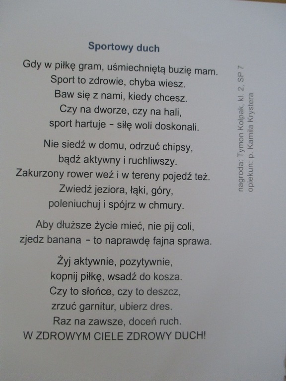 20 maja 2016 r. odbyło się uroczyste wręczenie dyplomów laureatom X Miejskiego Konkursu Poezji Dziecięcej im. Marii Konopnickiej. Organizatorem konkursu była Szkoła Podstawowa nr 10 w Kaliszu. Spośród 111 wierszy nadesłanych z różnych kaliskich szkół podstawowych nagrodzono wiersz pt. „Sportowy duch”, który napisał Tymon Kołpak z klasy 2b. Serdecznie gratulujemy laureatowi!