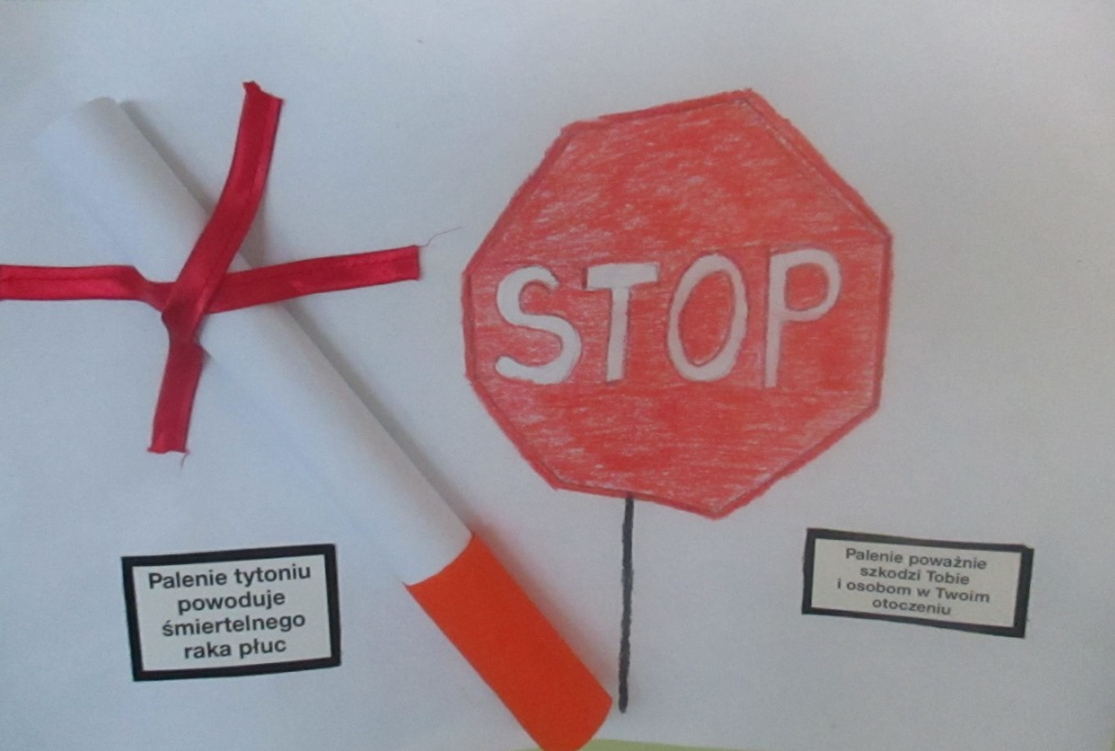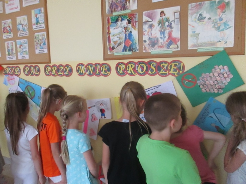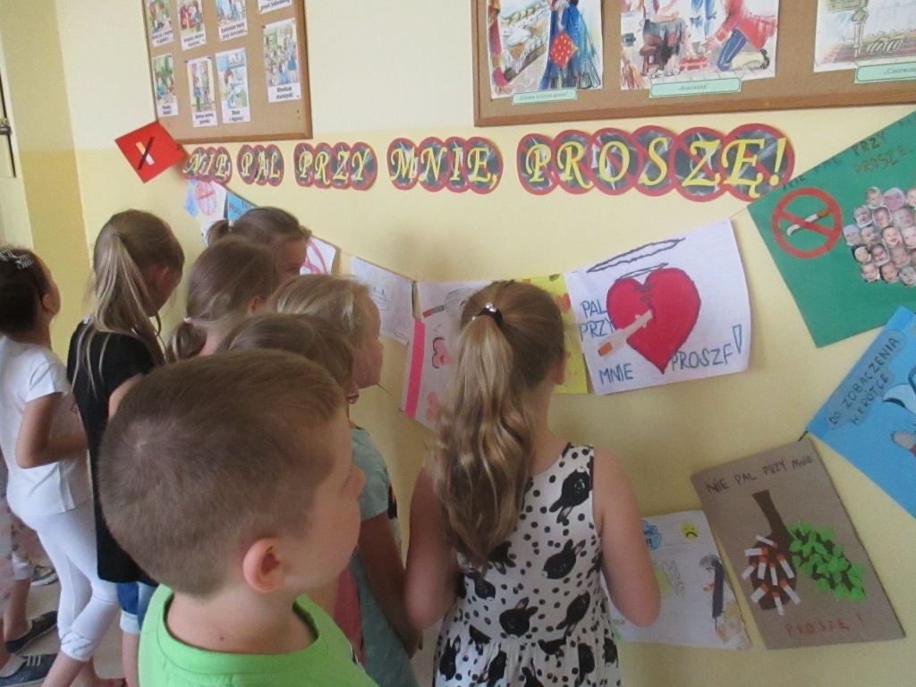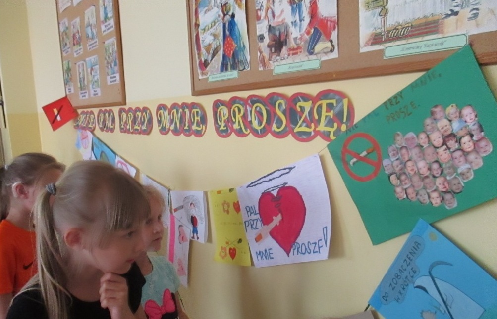 W ramach obchodów Światowego Dnia Bez Tytoniu w szkole przygotowano wystawę prac plastycznych uczniów pod hasłem „Nie pal przy mnie, proszę”.