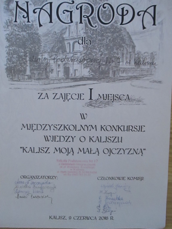 9 czerwca 2016 r. drużyna z naszej szkoły: Alicja Pyrek (kl.2b), Mikołaj Wanat (kl.3a) i Szymon Piaskowski (kl.3a) zajęła I miejsce w Międzyszkolnym Konkursie Wiedzy o Kaliszu „Kalisz moją małą Ojczyzną”. Podczas wykonywania zadań konkursowych dzieci wykazały się wiedzą na temat historii miasta i jego zabytków oraz znajomością legend o Kaliszu. Potrafiły wymienić sławnych ludzi związanych z Kaliszem. BRAWO MALI KALISZANIE!