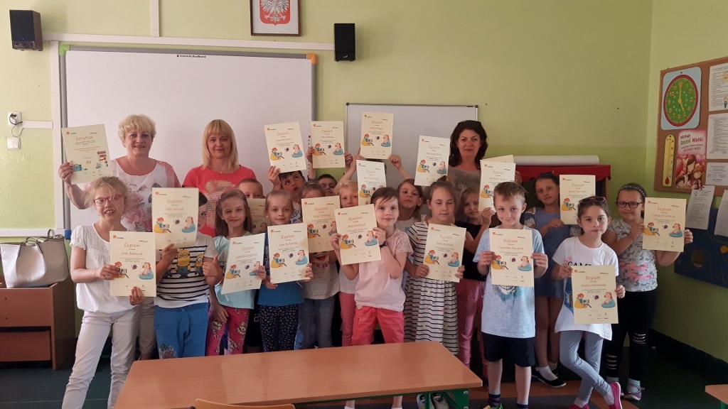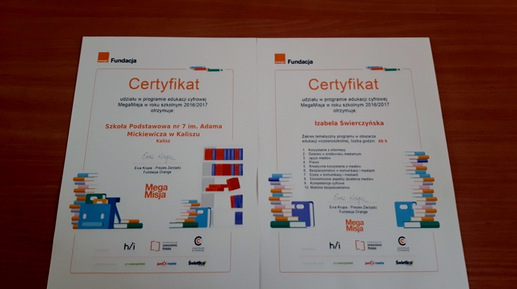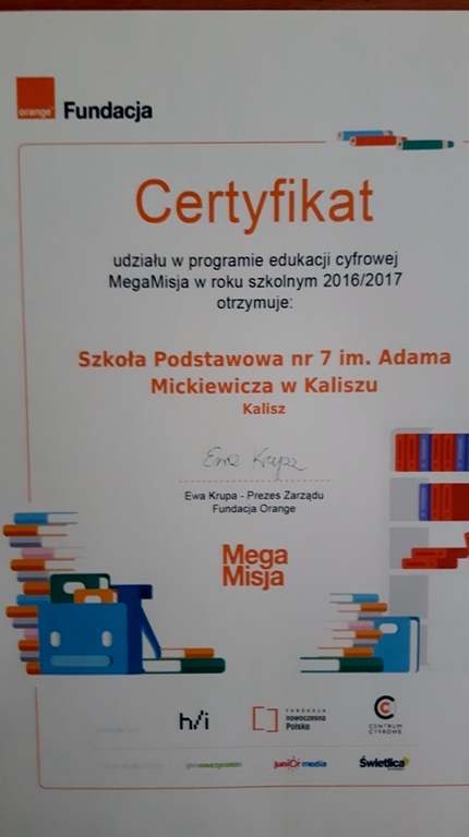 5 czerwca 2017 r. w świetlicy szkolnej odbyło się uroczyste zakończenie realizacji programu edukacji cyfrowej MegaMisja. W ciągu całego roku szkolnego dzieci pod kierunkiem pani Izabeli Świerczyńskiej i pani Renaty Larnet uczyły się bezpiecznego korzystania z mediów, kreatywności i etyki. Zajęcia odbywały się dwa razy w tygodniu. Poprzez zabawę zdobywały wiedzę nt. właściwego zachowania w środowisku medialnym. Dzięki zaangażowaniu i pracy zdobyły wiele cennych nagród (dwa tablety, książki, gry edukacyjne, audiobooki, przybory papiernicze). Uczestnicy programu byli bardzo dumni, kiedy otrzymali z rąk dyrektor szkoły Violetty Urban wspaniałe dyplomy i gratulacje od wicedyrektor Jadwigi Wojtyś. Udział w zajęciach dla wszystkich był wspaniałą przygodą.