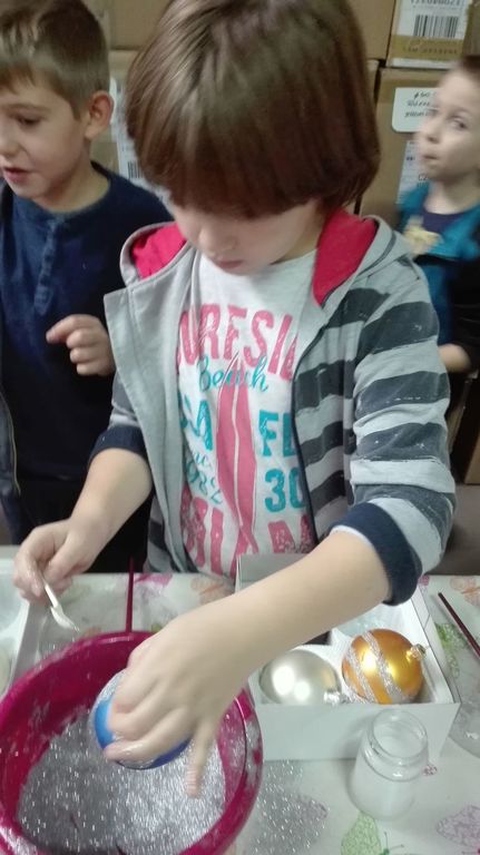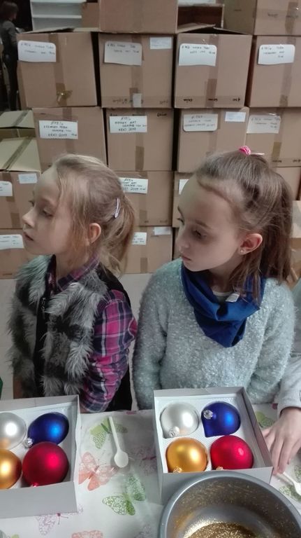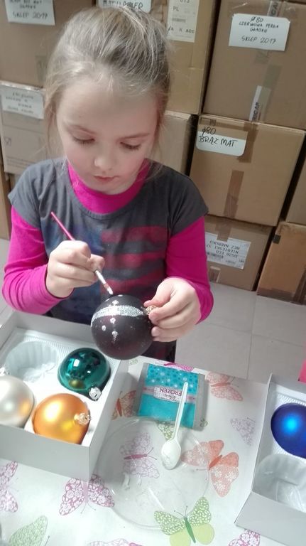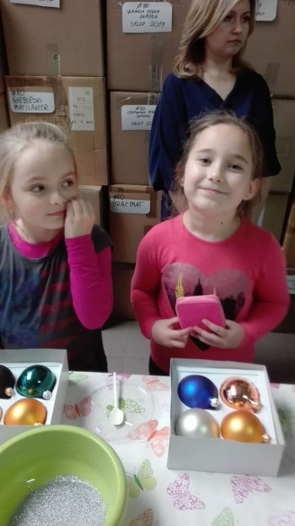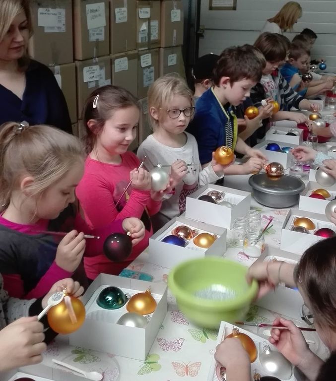 Dzieci miały okazję obejrzeć proces formowania baniek i ozdabiania gotowych bombek. To była szybka lekcja chemii z reakcjami Trommera i Tollensa pokazująca próbę lustra srebrowego. Uczestniczyły również w warsztatach dekoracji. Wszyscy wrócili zadowoleni z bombkami własnej produkcji.