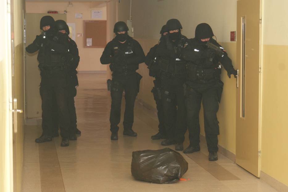 Do budynku naszej szkoły wtargnęli niebezpieczni bandyci. Nauczyciele i pracownicy szkoły schronili się w klasach, ale niestety część została wzięta jako zakładnicy. Napastnika obezwładnili policjanci z grupy realizacyjnej Komendy Miejskiej Policji w Kaliszu.