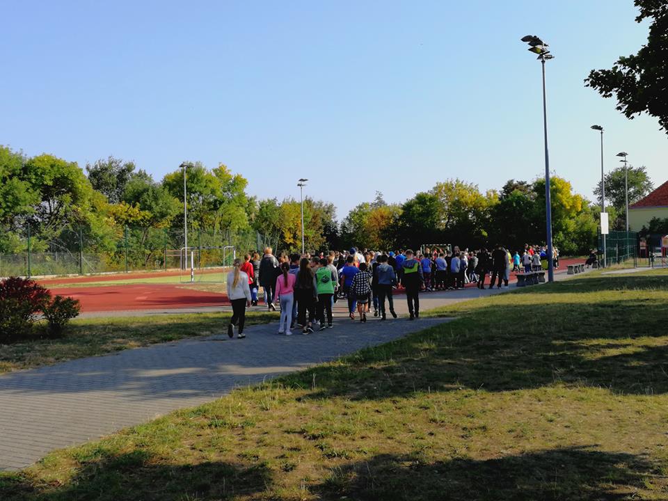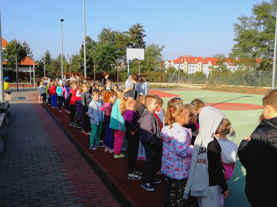 Po krótkich trzech dzwonkach uczniowie pod opieką nauczycieli, a także pracownicy szkoły opuścili budynek i udali się na boiska przy szkole. Tam od nauczycieli raporty odebrały Małgorzata Waszczyńska i Jadwiga Wojtyś.