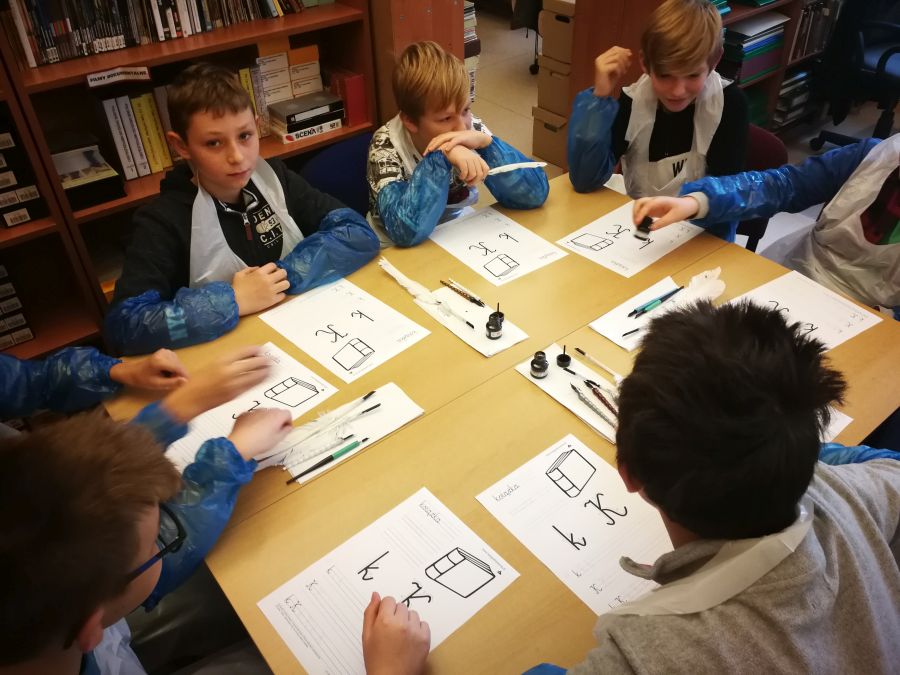 Pracownik biblioteki pokazał uczniom różne ex librisy, opowiedział historię ich powstania, także wspomniał o kaliskich autorach tej grafiki, m.in. o Władysławie Kościelniaku. Młodzież podczas spotkania uczestniczyła także w lekcji kaligrafii, obejrzała wystawę dawnych sprzętów szkolnych.