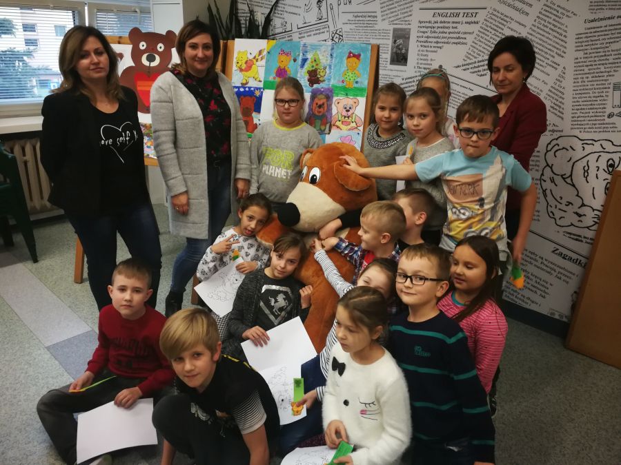 Najmłodsi uczniowie uczestniczyli w lekcjach, podczas których nauczyciele bibliotekarze przekazali historię pojawienia się pluszowego misia. Starszy kolega – Wiktor Wiertelak, przebrany za polarnego misia opowiedział skąd się wzięła pluszowa zabawka, rozdał też misiowe karty pracy. Kolorowanki były podstawą do stworzenia barwnej wystawy w czytelni.