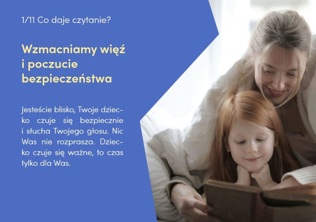 Wspólne czytanie jest też naturalnym sposobem komunikacji i budowania rodzinnych więzi. To czas, w którym dziecko jest blisko rodzica, czuje się bezpieczne, ważne i naprawdę Państwa słucha. Świat, który znamy, nasze zasady i poglądy, powstały m.in. w naszych domach, gdy rodzice lub dziadkowie czytali dzieciom bajki i legendy lub opowiadali historie.