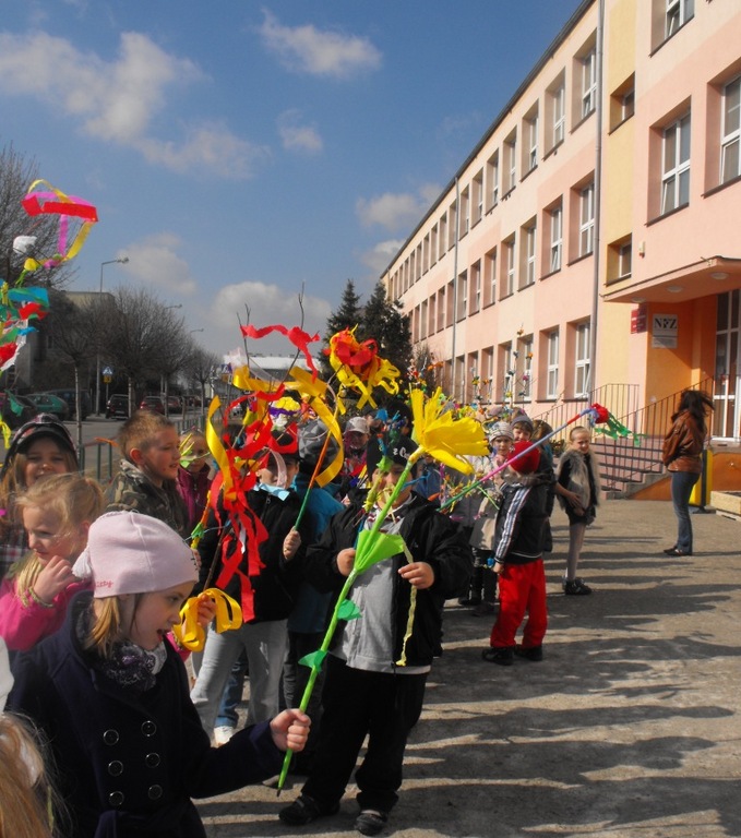 Nasza szkoła postanowiła przywitać wiosnę wesoło i kolorowo. Uczniowie klas I-III i dzieci z oddziałów przedszkolnych wyszły na przywitanie wiosny w barwnym wiosennym korowodzie. Trzymając wykonane przez siebie gaiki przeszły wokół szkoły witając wiosnę gromkimi okrzykami: ,,WITAJ WIOSNO, WITAJ WIOSNO’’. Zimę żegnały: ,,ŻEGNAJ ZIMO, WRÓĆ ZA ROK’’. Na powitanie nowej pory roku śpiewały wiosenne piosenki. Dzieci szukały pierwszych zwiastunów wiosny. Zobaczyły pąki na drzewach i krzewach, wsłuchiwały się w śpiew ptaków, patrzyły na świecące słonko i czuły jego promyki na swoich twarzach. Z uśmiechami na buziach wróciły do klas, gdzie z nauczycielami kontynuowały rozmowy o wiośnie, malowały barwne obrazki, dekorowały klasy kwiatami. Pierwszy dzień wiosny wprawił wszystkich w miły nastrój.