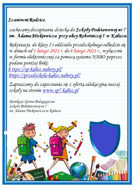 Trwa elektroniczna uzupełniająca rekrutacja do klasy I i oddziału przedszkolnego w Szkole Podstawowej nr 7 im. Adama Mickiewicza przy ulicy Robotniczej 5 w Kaliszu. Nabór będzie odbywał się wyłącznie w formie elektronicznej za pomocą systemu NABO poprzez podane poniżej linki: