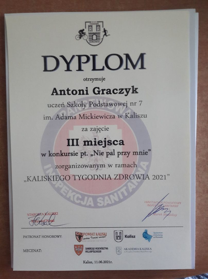 Wśród laureatów konkursu plastycznego znalazł się uczeń klasy 2c, Antoni Graczyk. Wykonał on pracę pt. „Nie pal przy mnie, proszę”, która zajęła pierwsze miejsce w zorganizowanym przez Jadwigę Wojtyś i Annę Malinowską-Leki szkolnym konkursie plastycznym o tym samym tytule oraz III miejsce w konkursie „Nie pal przy mnie, proszę” zorganizowanym w ramach „Kaliskiego Tygodnia Zdrowia”.