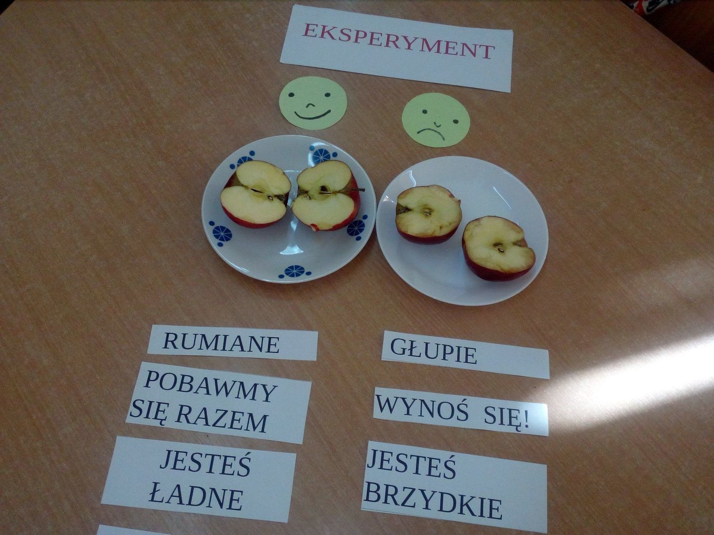 Święto jabłka stało się również doskonałą okazją do wyjaśnienia takich zagadnień jak przemoc fizyczna, psychiczna czy empatia. Dzieci wzięły udział w jabłkowym eksperymencie, który pomógł im zrozumieć, że słowa też mogą ranić. Przedszkolaki były niesamowicie zaskoczone efektem końcowym eksperymentu, który sprowokował je do dzielenia się własnymi doświadczeniami.