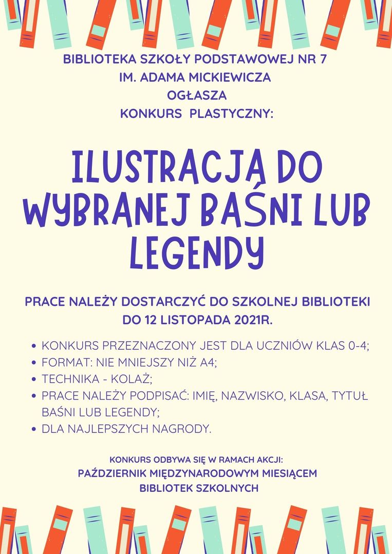 W ramach akcji zorganizowany został konkurs na ilustrację do wybranej baśni lub legendy. Szczegóły znajdują się na plakacie, w załączniku. Prace można przynosić do szkolnej biblioteki do 12 listopada.