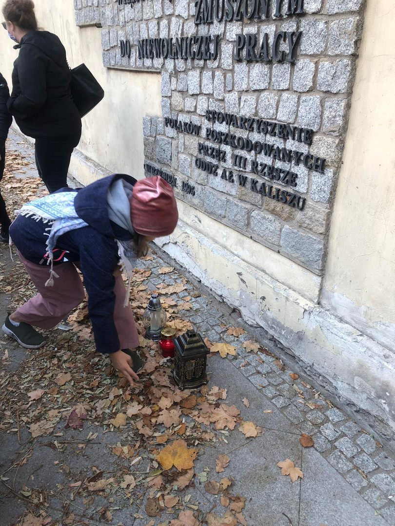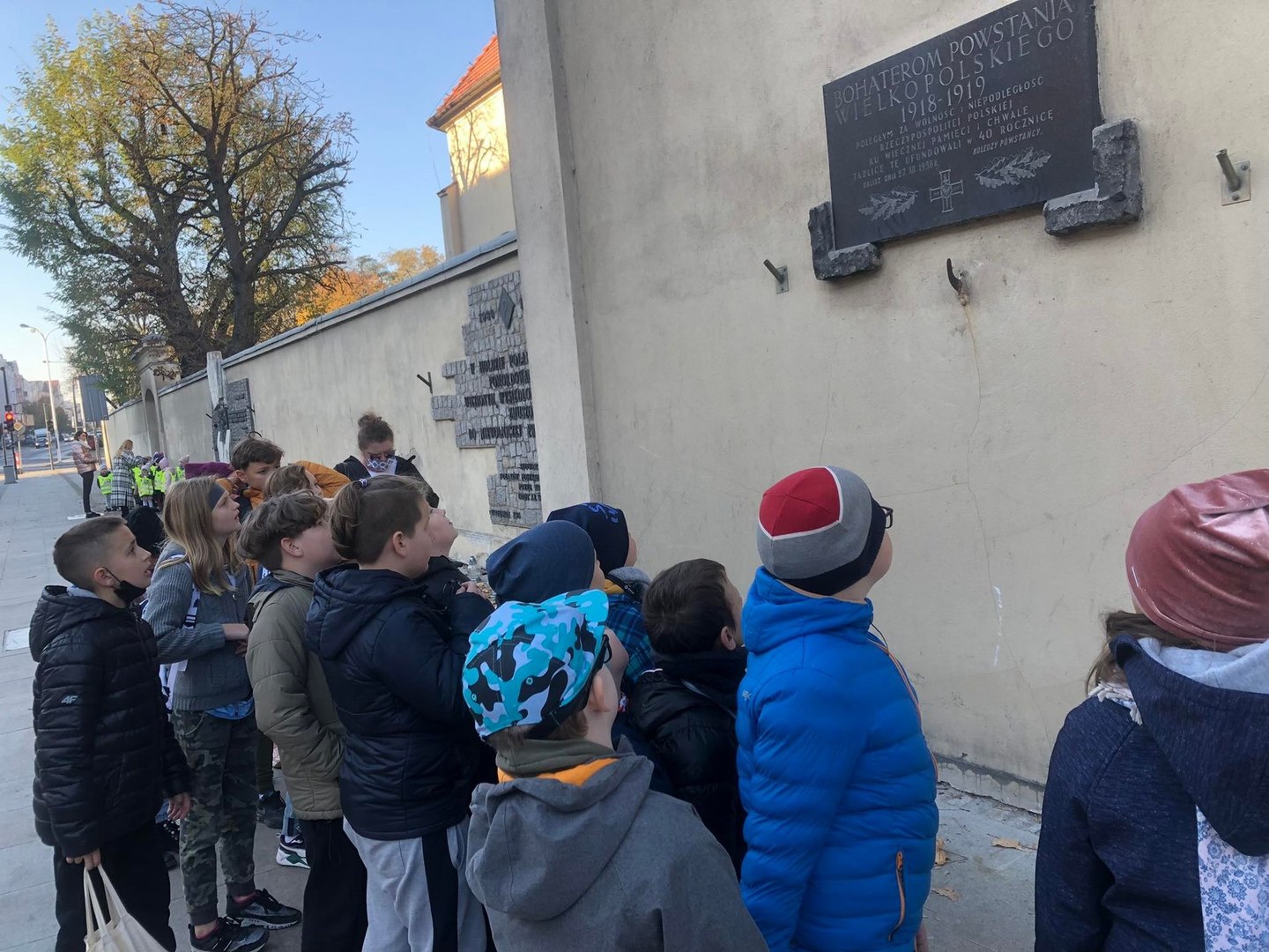 Pierwszym punktem wycieczki patriotycznej była tablica pamiątkowa, poświecona bohaterom powstania wielkopolskiego 1918-1919. Następnie uczniowie złożyli kwiaty i zapalili znicze pod tablicą powstałą w hołdzie Polakom pomordowanym, więzionym, wysiedlonym i zmuszanym do niewolniczej pracy w czasie II wojny światowej.
