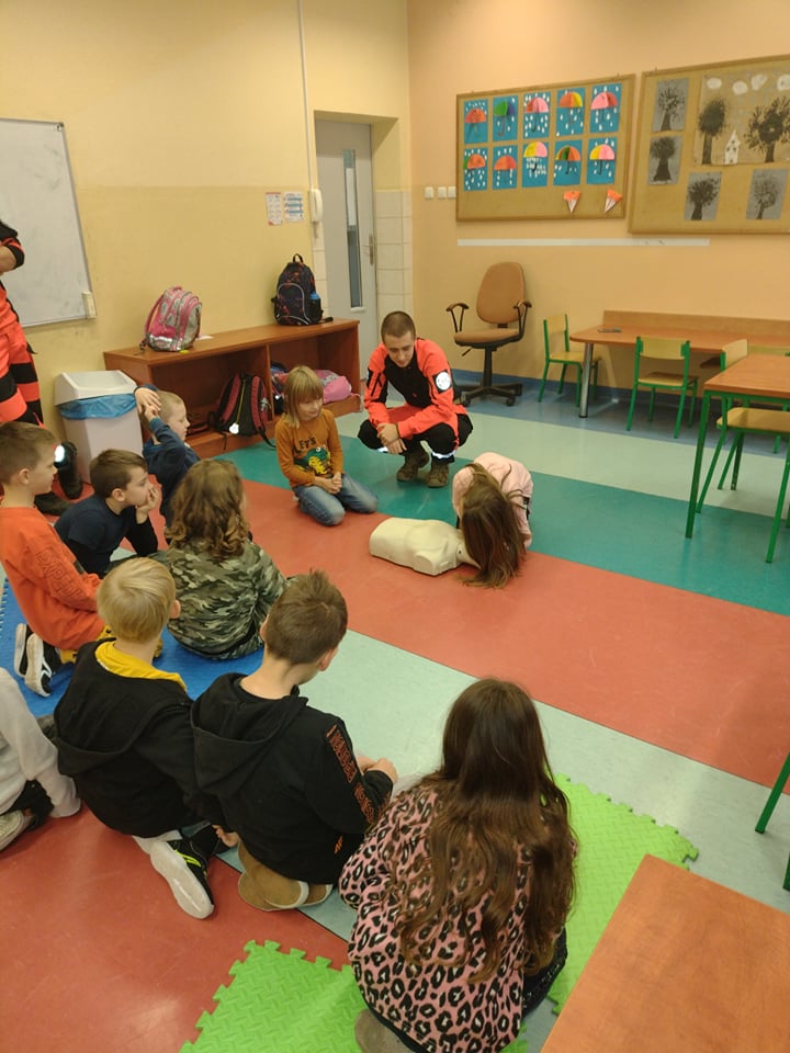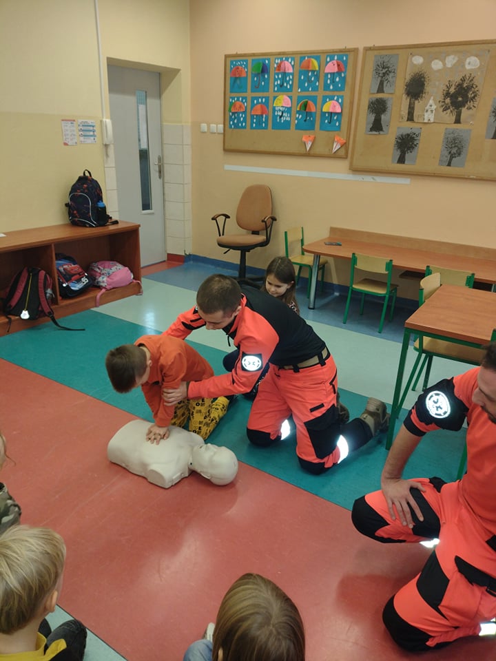 Pod profesjonalnym okiem ratowników medycznych dzieci uczyły się oceny sytuacji, wzywania pomocy i oceny prawidłowych parametrów życiowych. Ćwiczyły także technikę odwracania w pozycję boczną, układania rąk do resustytacji krążeniowo - oddechowej (RKO)oraz próbowały ucisków RKO.