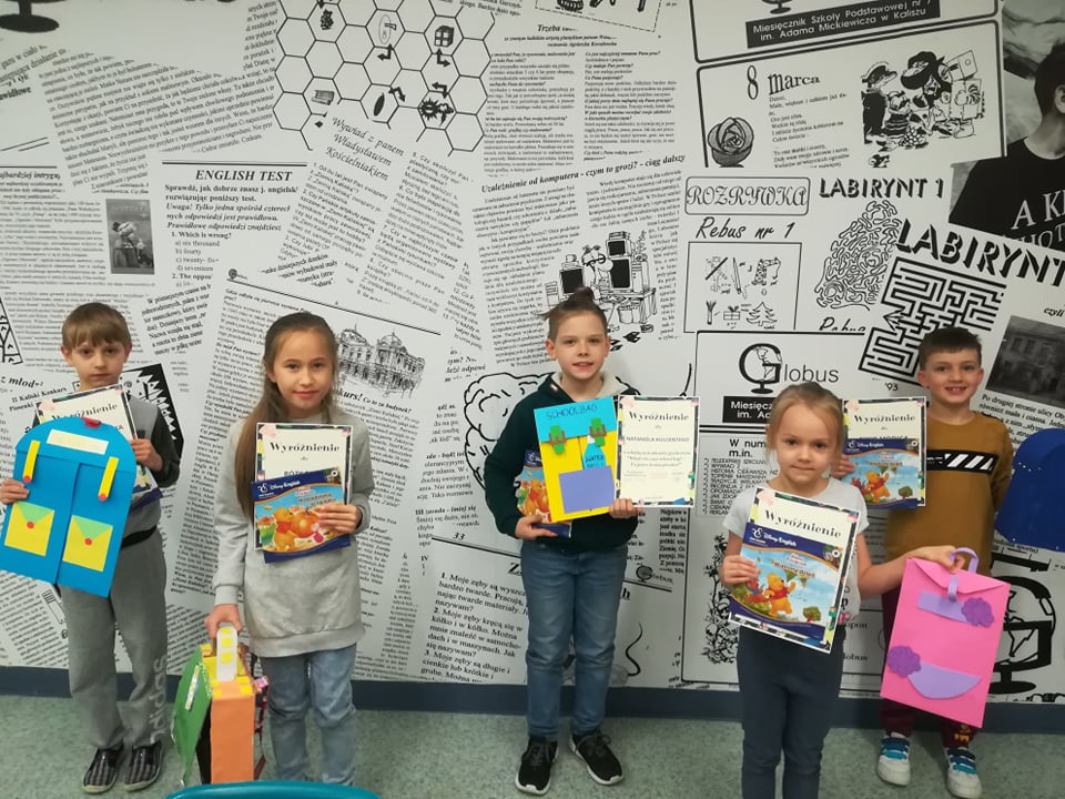 26 listopada 2021 roku został rozstrzygnięty szkolny konkurs językowy dla uczniów klas I-III „What’s in your school bag? – Co jest w Twoim plecaku?”. Zadaniem uczestników konkursu było wykonanie pracy plastycznej przedstawiającej szkolny plecak i jego zawartość. Wszystkie elementy musiały być podpisane w języku angielskim.