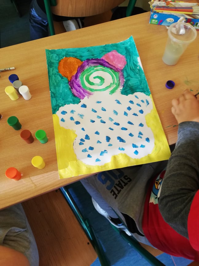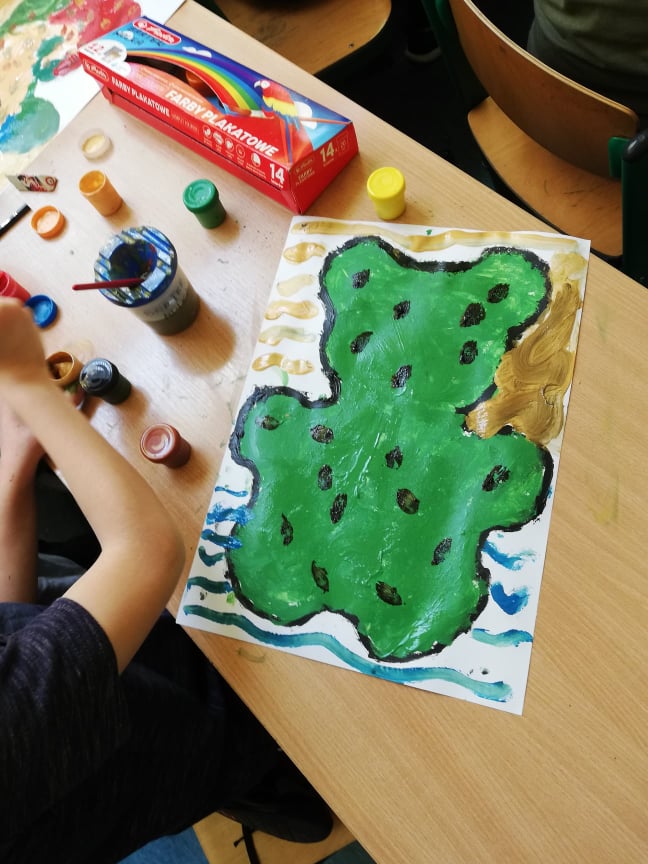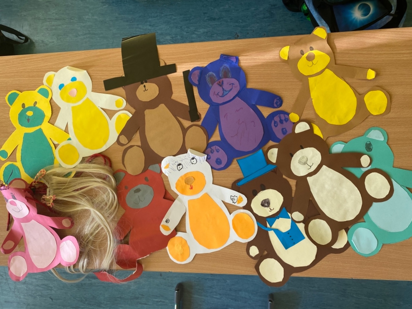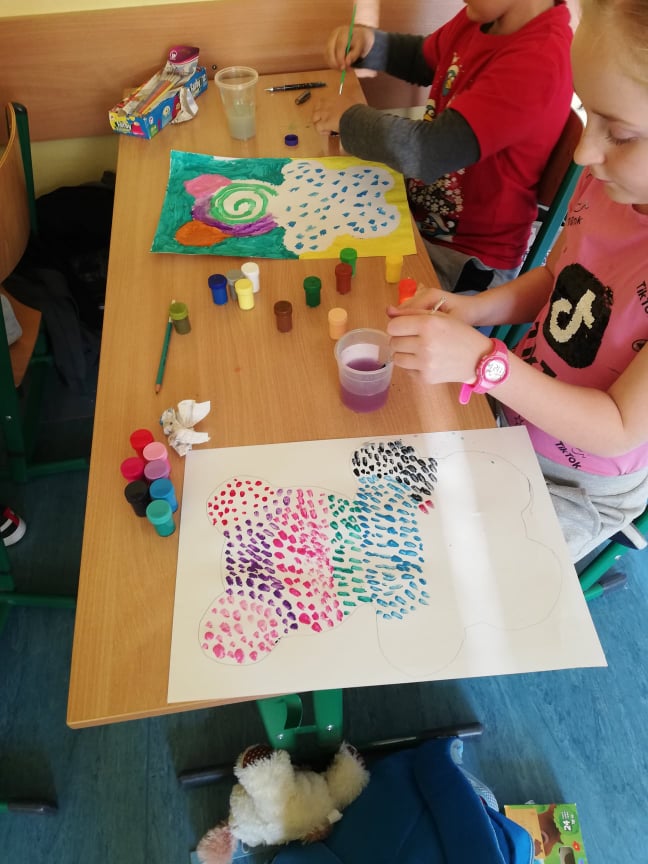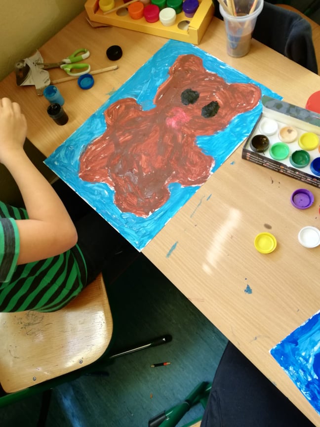 Klasa 2 c pod czujnym okiem bibliotekarki Iwony Skoniecznej – Wrubińskiej wykonała misiowe portrety, które później tworzyły kilka większych. Każdy mógł się wykazać plastyczną fantazją.
