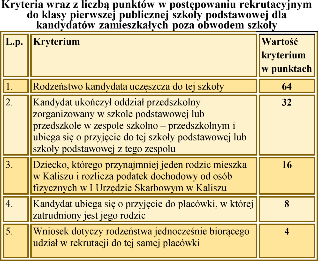 Kryteria wraz z liczbą punktów w postępowaniu rekrutacyjnym do klasy pierwszej szkoły podstawowej dla kandydatów zamieszkałych poza obwodem szkoły: