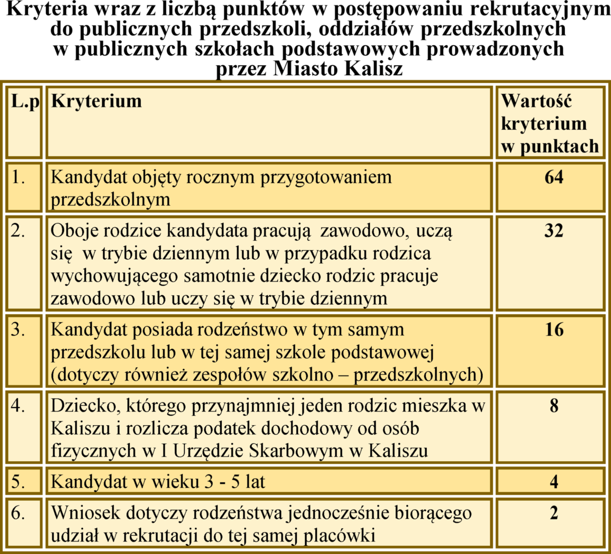 3. Dziecko, którego przynajmniej jeden rodzic mieszka w Kaliszu i rozlicza podatek dochodowy od osób fizycznych w I Urzędzie Skarbowym w Kaliszu (16 punkty).