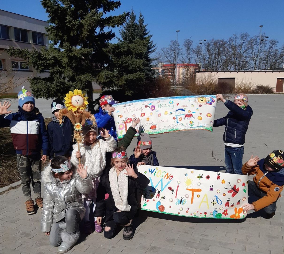 Poniedziałkowy poranek przyniósł uczniom klas młodszych wspaniałą słoneczną pogodę. Taką właśnie w sam raz na powitanie najpiękniejszej z pór roku – wiosny. Było ją widać, czuć i słuchać z każdej strony.