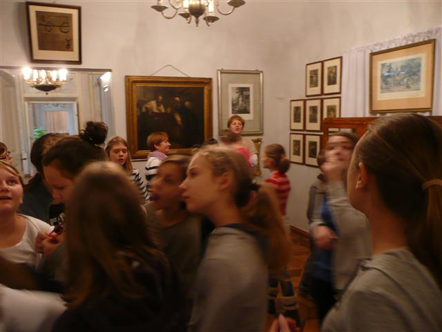 Zwiedzanie rozpoczęliśmy od przyjrzenia się architekturze tego pięknego klasycystycznego budynku na planie podkowy ze wspaniałym czterokolumnowym portykiem. Zwiedziliśmy sale poświęcone życiu poety, jego podróżom i utworom, sale, gdzie zgromadzono pamiątki po wieszczu, jego utwory w różnych językach, obrazy i rysunki, będące ilustracjami jego utworów. Byliśmy w pokoju, w którym mieszkał poeta w czasie swego pobytu w Śmiełowie. Podziwialiśmy zdjęcia i kopie jego pomników na całym świecie. Dzięki naszej przewodniczce, poznaliśmy bohaterów naszej narodowej epopei i nauczyliśmy się ich rozpoznawać na rysunkach i obrazach w muzeum. Zobaczyliśmy wielkopolskie cymbały i róg oraz charakterystyczne meble z naszego regionu z oparciami w kształcie trzylistnej koniczyny. Każdy z uczniów miał okazję rozwiązać zadania i zagadki zadawane przez miłą przewodniczkę. Na końcu wędrówki pani, która nas oprowadzała, sprawdziła naszą wiedzę, zadając pytania dotyczące rzeczy znajdujących się w muzeum i życiorysu Adama Mickiewicza oraz zaprosiła nas na lekcje muzealne organizowane w Śmiełowie.
