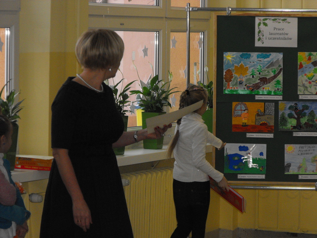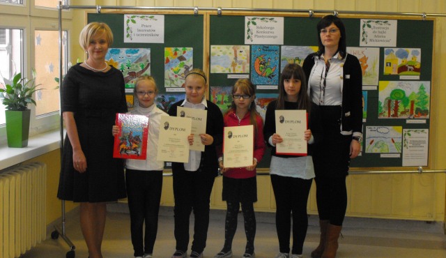 04.12.2012 r. odbyło się uroczyste wręczenie nagród i dyplomów laureatom Szkolnego Konkursu Plastycznego „Ilustracja do bajki Adama Mickiewicza”. Konkurs został zorganizowany przez p. Annę Malinowską – Leki i p. Jadwigę Wojtyś. Głównymi celami konkursu było: pogłębianie wiedzy na temat twórczości Patrona Szkoły, pielęgnowanie tradycji i zwyczajów szkoły; rozwijanie czytelnictwa wśród uczniów; prezentacja umiejętności plastycznych uczniów; rozwijanie inwencji twórczej i kreatywności uczniów. Konkurs przeznaczony był dla uczniów klas II-III. Na korytarzu szkolnym organizatorzy przygotowali wystawę pokonkursową prac laureatów i uczestników. Nagrody dla laureatów konkursu zostały ufundowane przez Radę Rodziców.