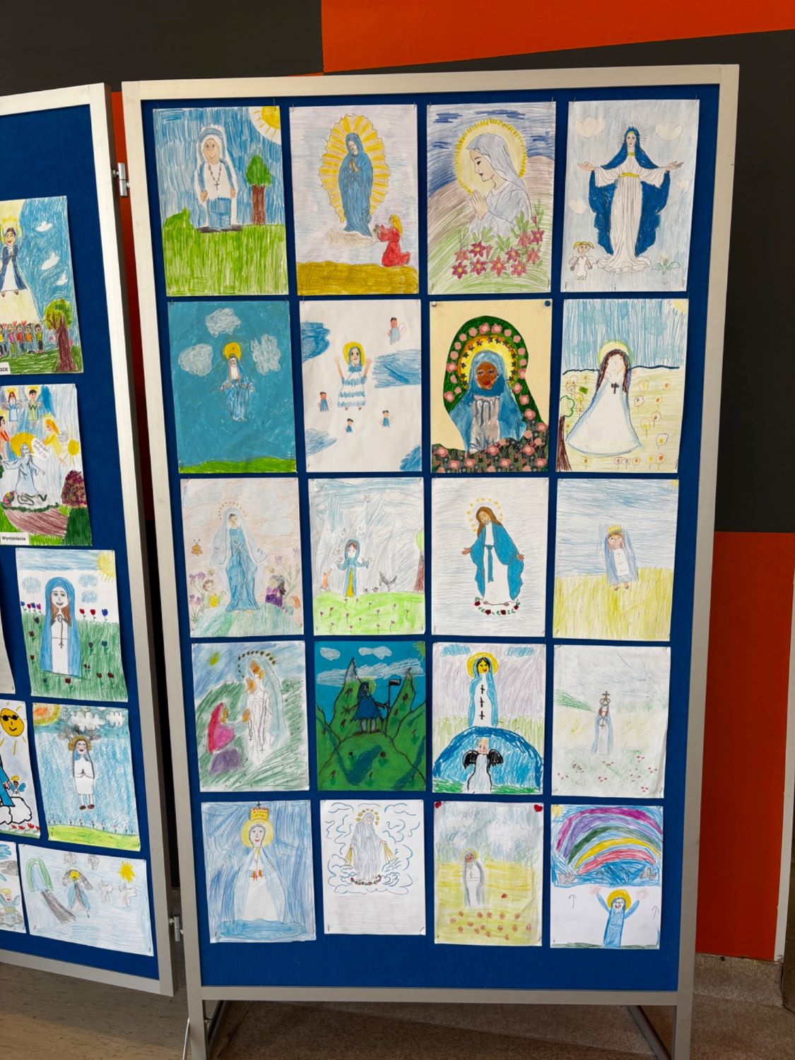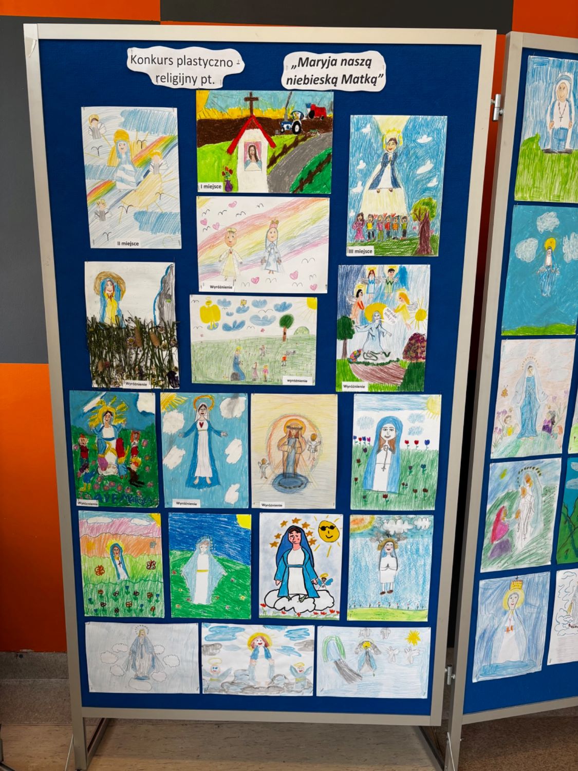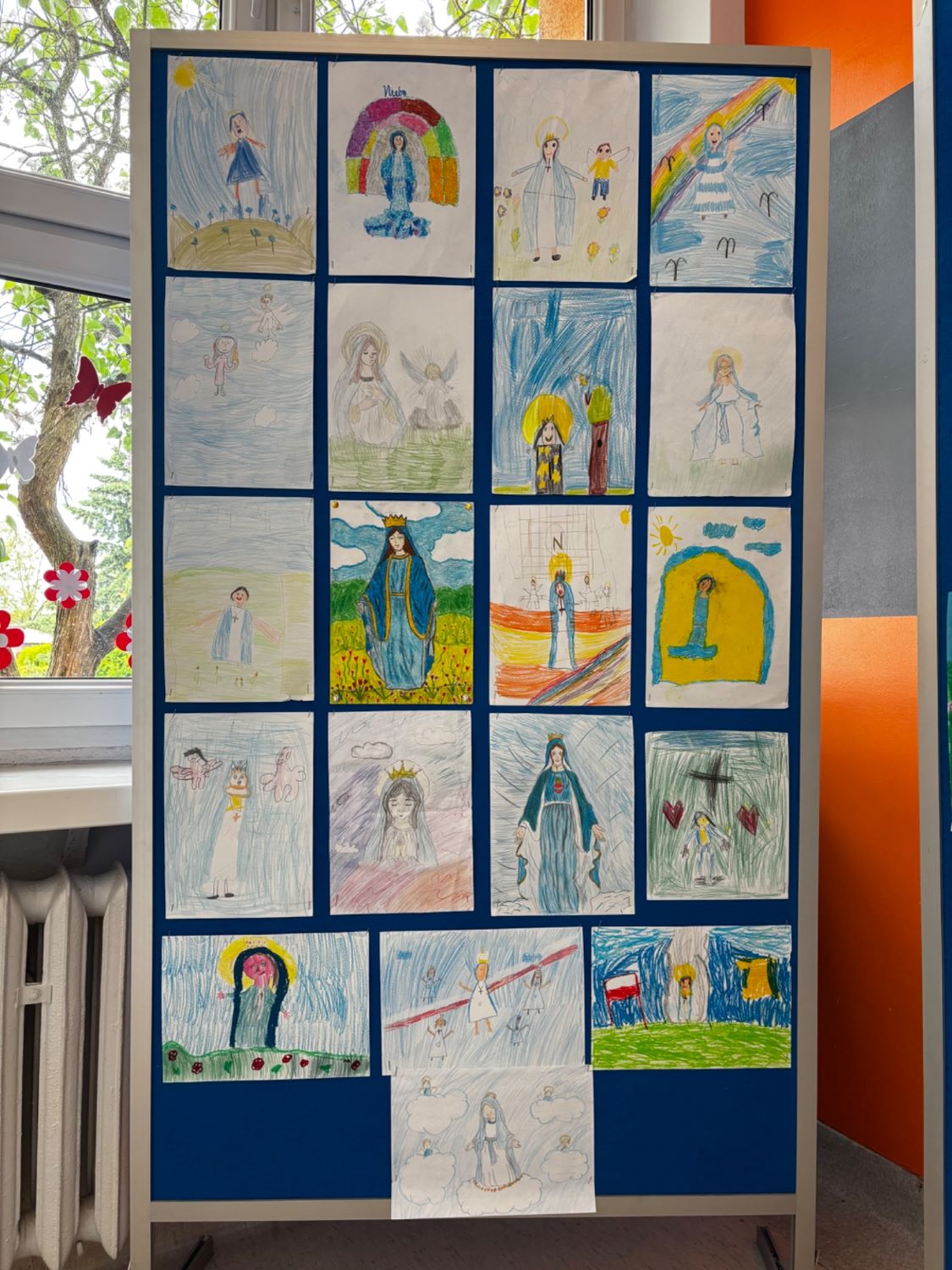 Podczas zajęć katechezy uczniowie naszej szkoły poznają miejsce Matki Boskiej w kulturze chrześcijańskiej. Odmawiając modlitwę różańcową, dają tym samym wyraz swojego zawierzenia i oddania pod jej opiekę. Postać Matki Chrystusa, a jednocześnie Matki Kościoła, stała się inspiracją do stworzenia przepięknych prac plastycznych.