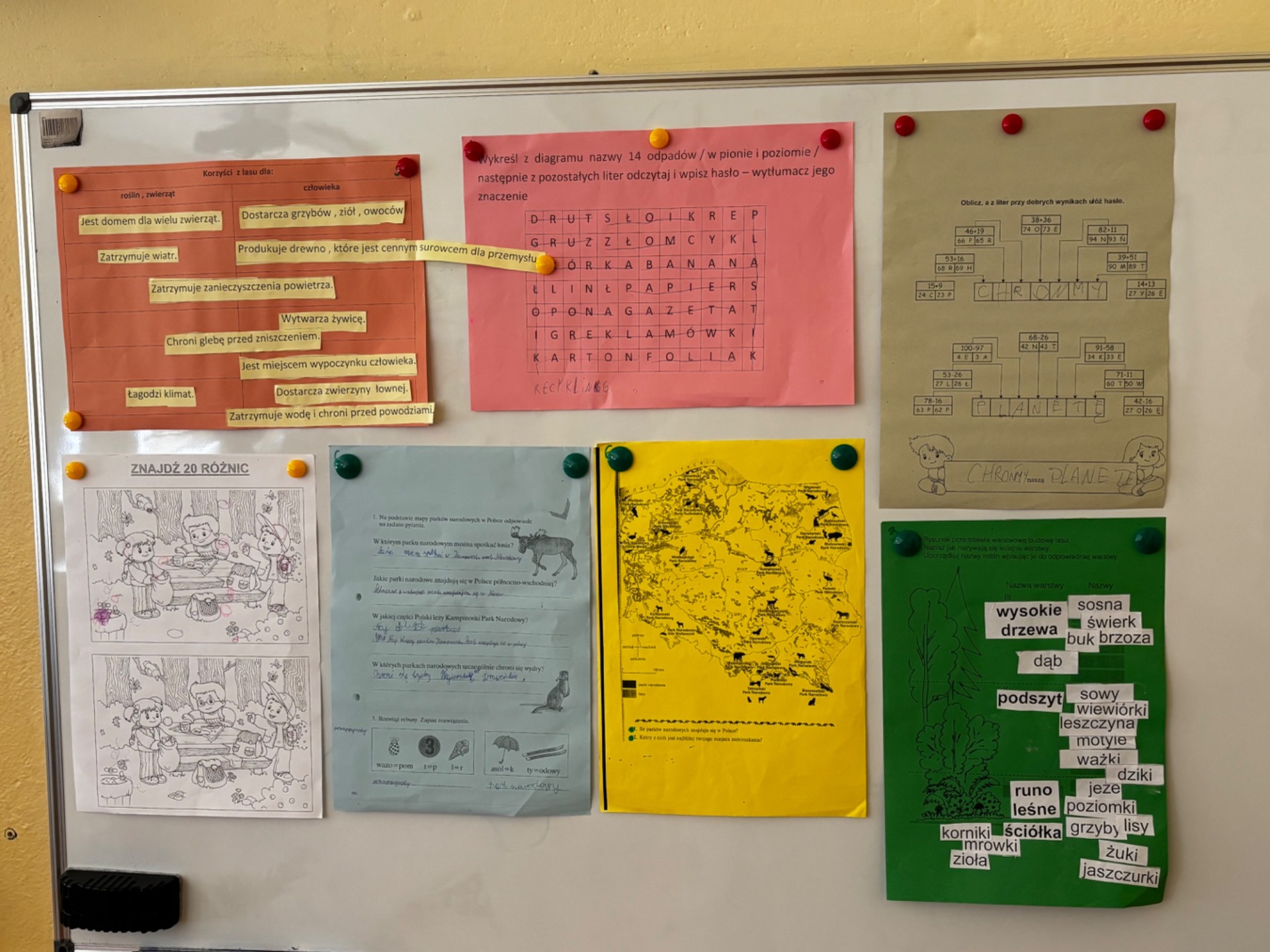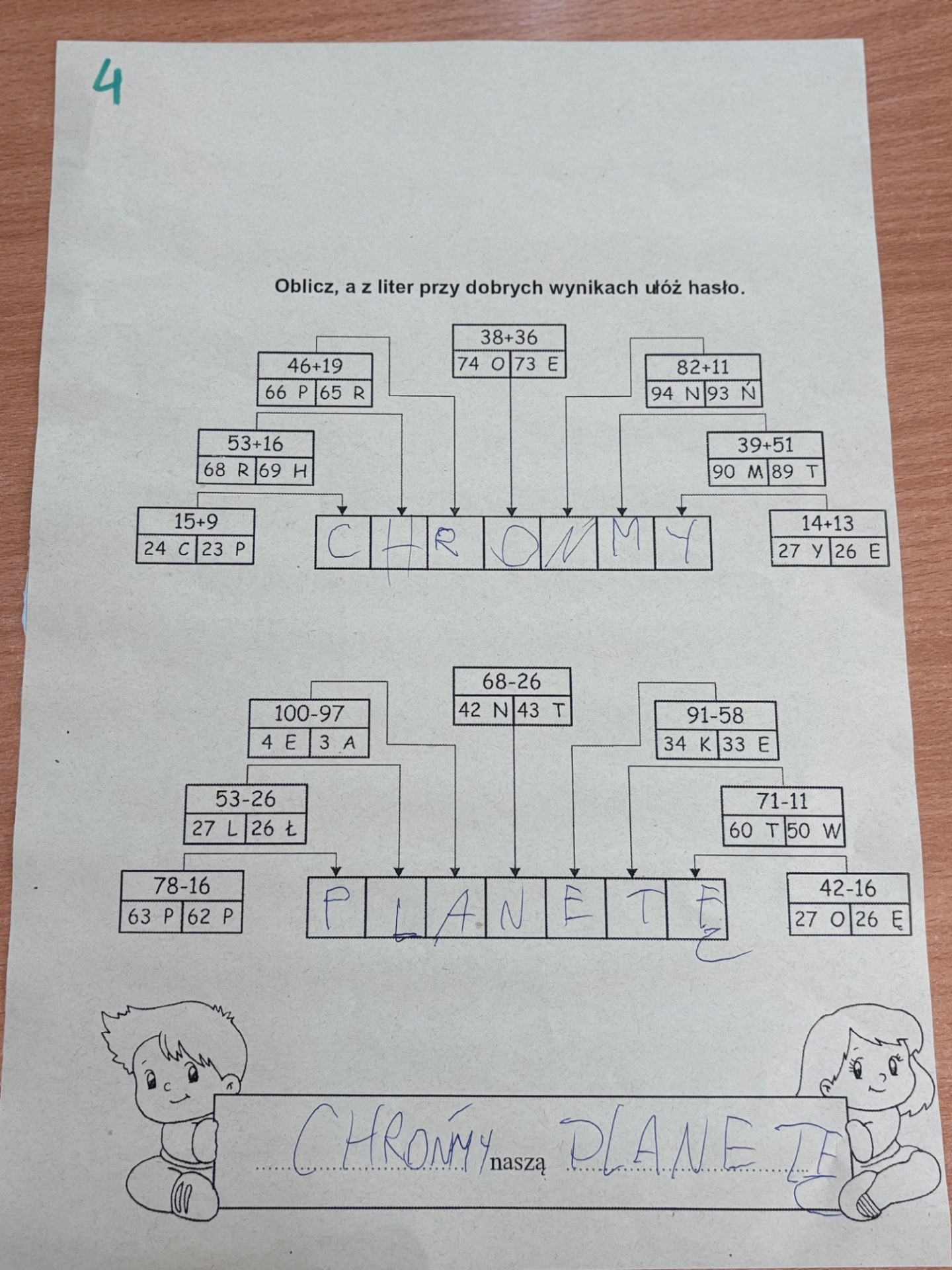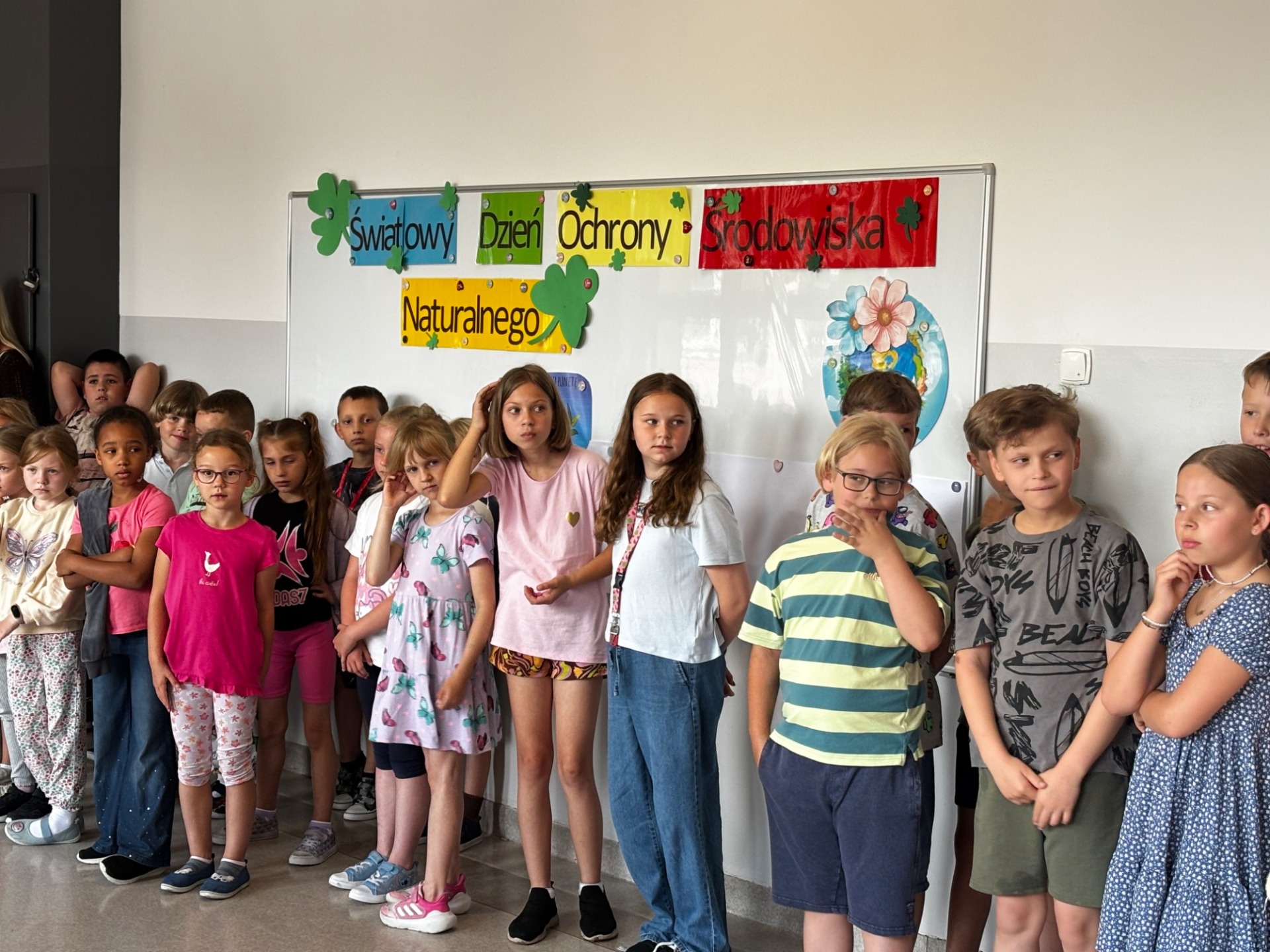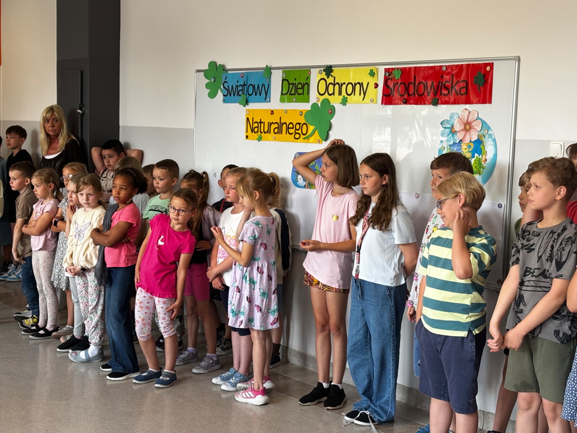 Aby przybliżyć uczniom klas I-III tematykę związaną z ochroną flory i fauny na całym świecie, zamiast tradycyjnego apelu czy przedstawienia, uczniowie otrzymali zadania do wykonania w grupach. I tak rozwiązywali szyfrowanki matematyczne z hasłem, krzyżówki, rebusy, uzupełniali tabele i schematy, a także tworzyli prace plastyczne. Elementem łączącym wszystkich małych ekologów, było odbicie swojej dłoni pod deklaracją „Przyjaciela Przyrody”.