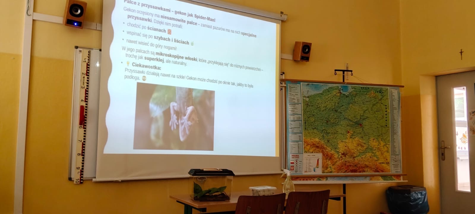 Największą jednak sensację wzbudziła możliwość obejrzenia przez uczniów gekona na żywo, przyniesionego w terrarium - transporterze.