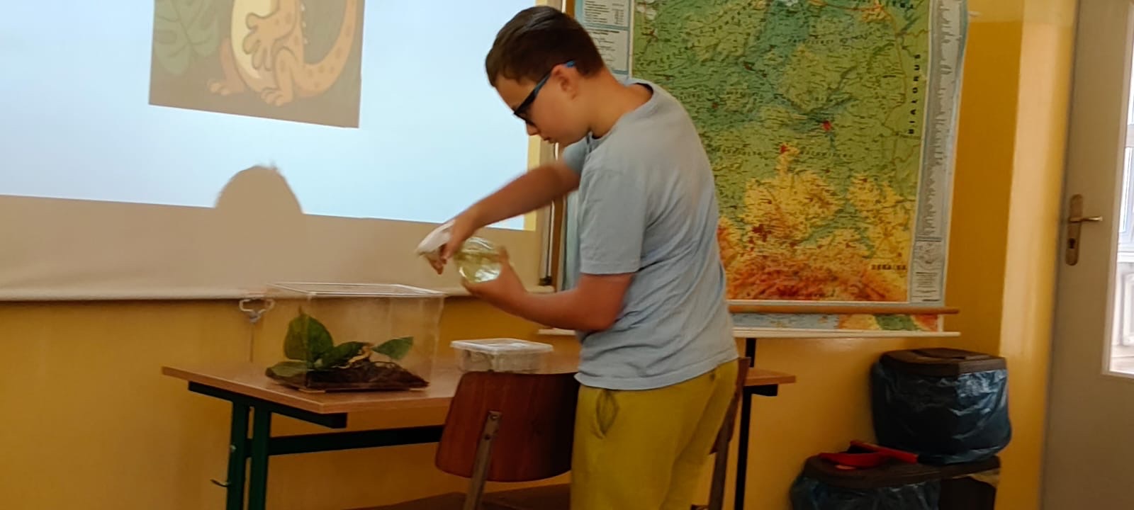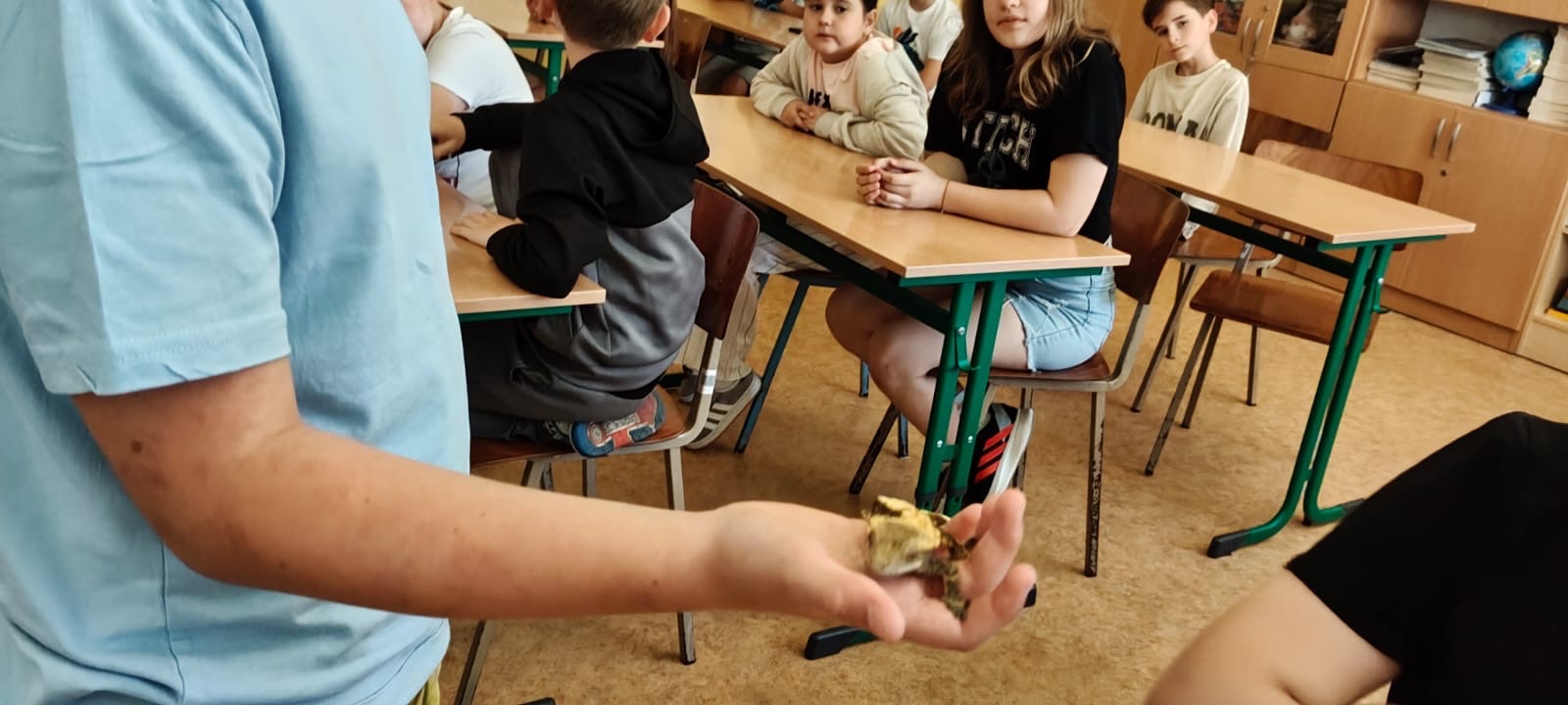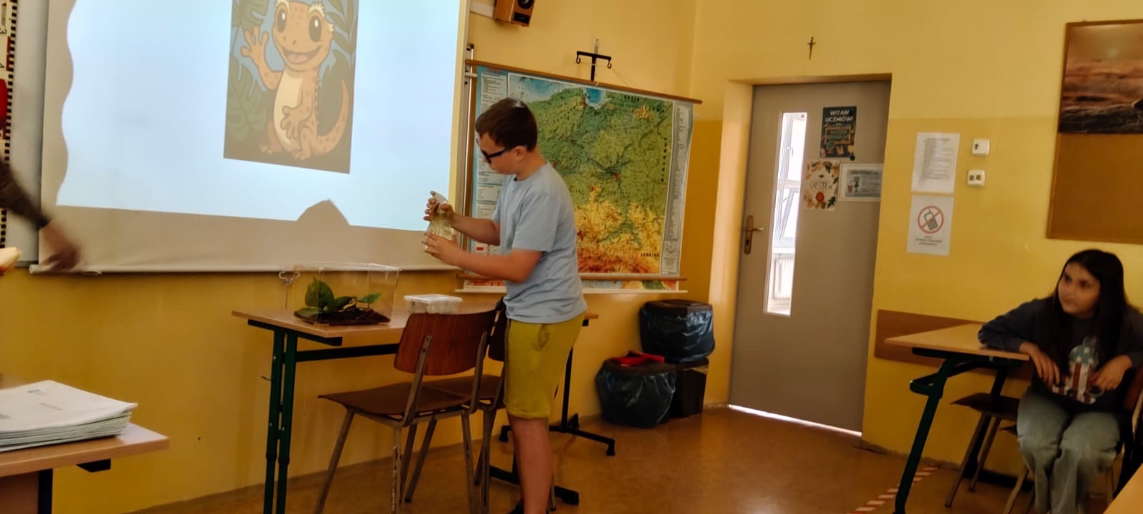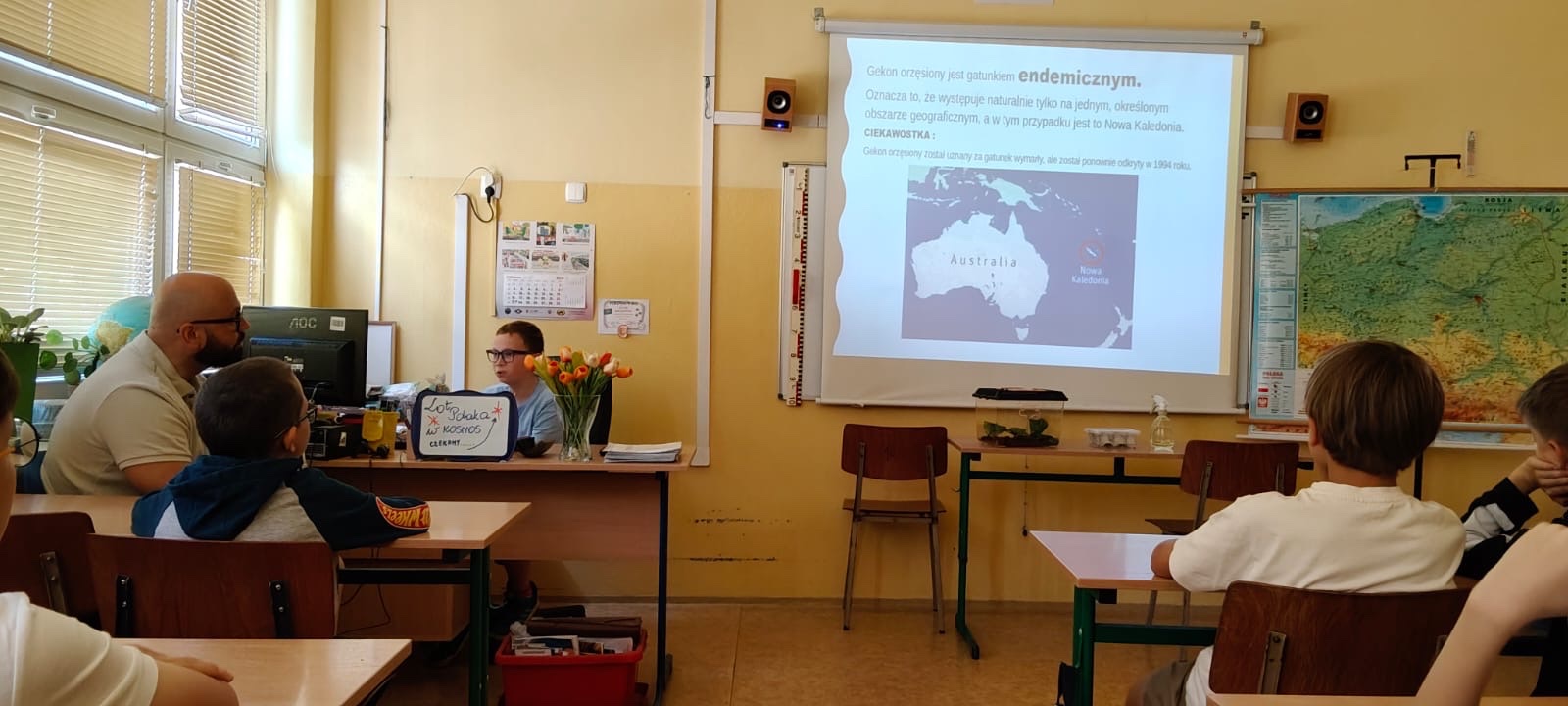 Uczniowie uczestniczyli w niecodziennej lekcji przygotowanej przez panią Agnieszkę Nowak, nauczyciela przyrody i geografii. Gośćmi specjalnymi byli uczeń klasy 4a wraz ze swoim tatą oraz "mały smok" z Nowej Kaledonii. Zaproszeni goście opowiadali o życiu gekona orzęsionego, gatunku endemicznego.