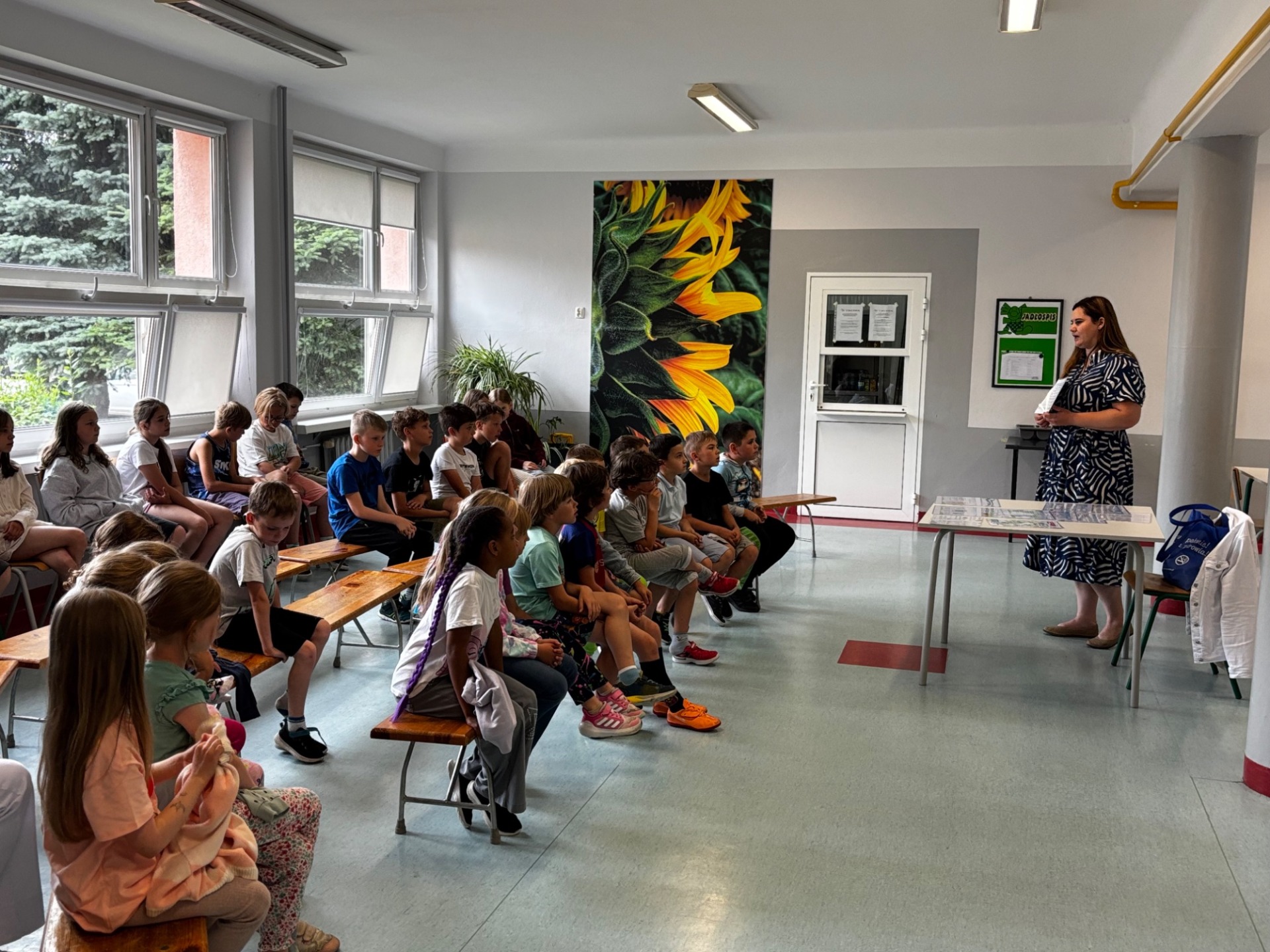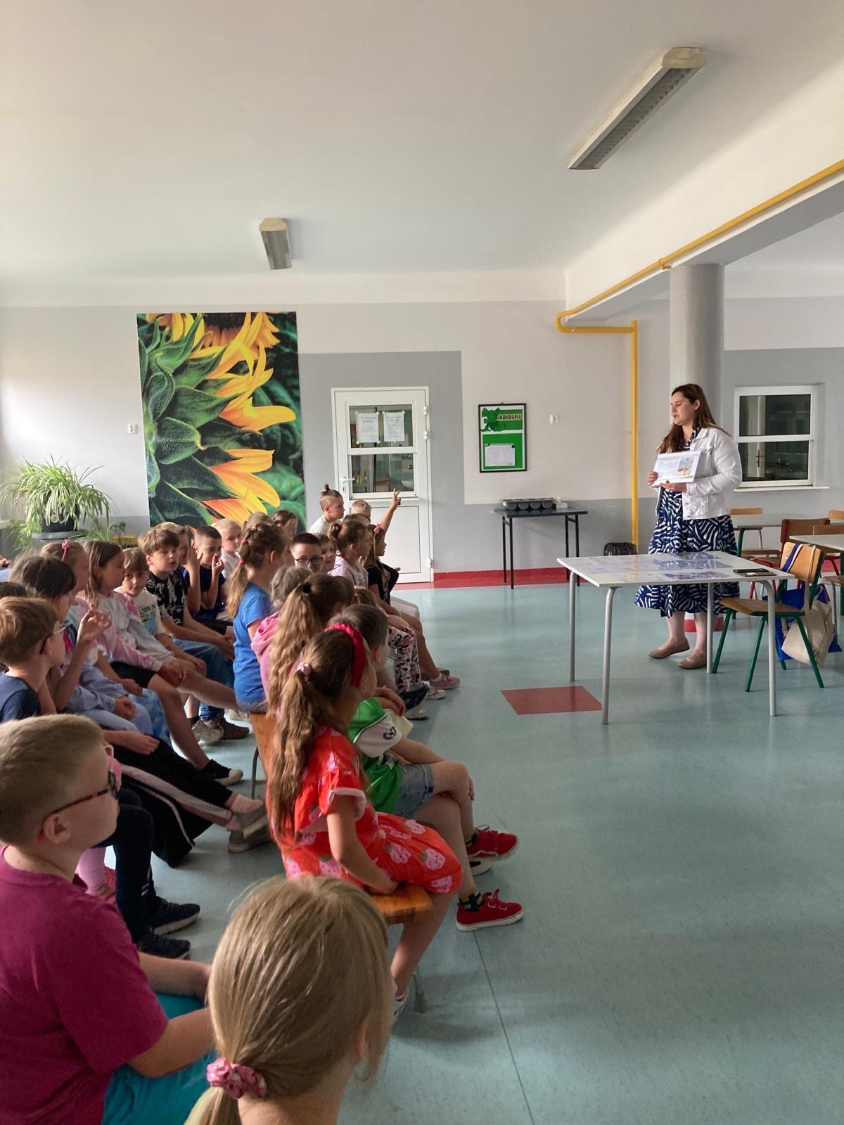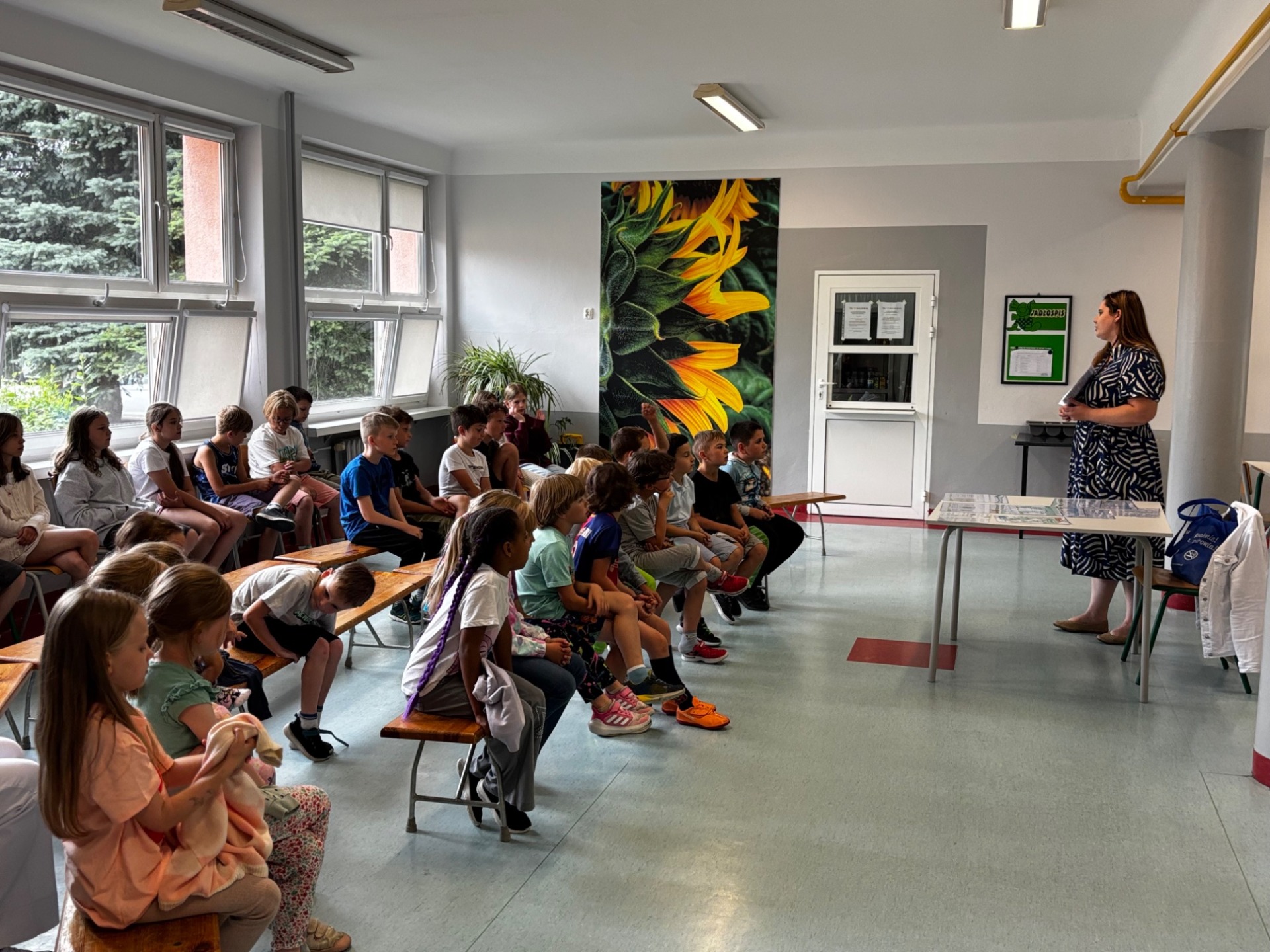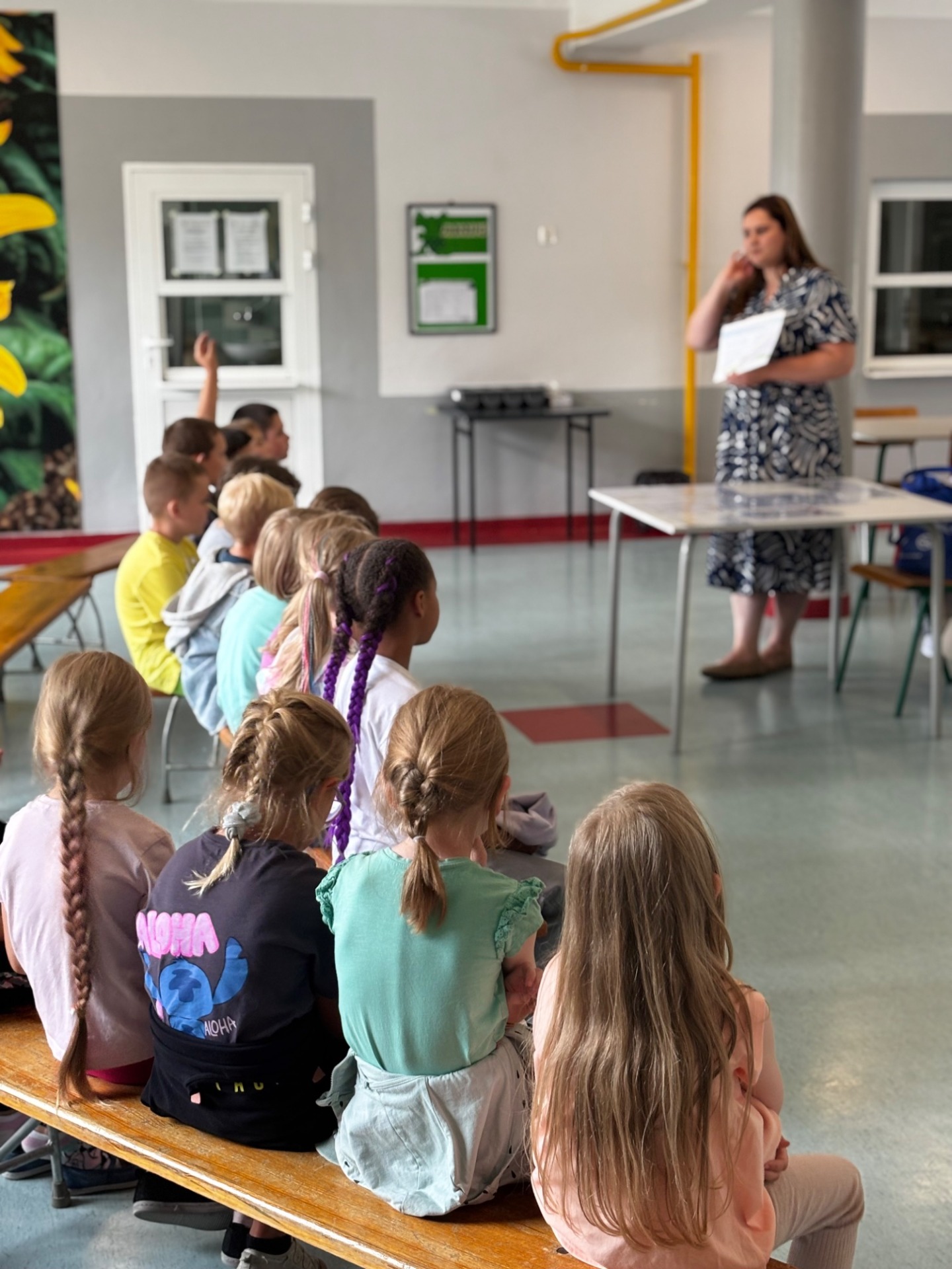 Kolejnym nie mniej ekscytującym działaniem była wizyta przedstawiciela Powiatowej Stacji Sanitarno-Epidemiologicznej w Kaliszu. Uczniowie utrwalili wiedzę dotyczącą zdrowego odżywiania się oraz dbania o nawodnienie organizmu w czasie upałów. Mogli pochwalić się umiejętnościami w zakresie udzielania pierwszej pomocy w przypadku skaleczeń i złamań. Zaproszony gość przypomniał również o szkodliwości używek oraz biernego palenia. Na zakończenie prelekcji przewidziano quiz z nagrodami, którego to nasi wychowankowie okazali się mistrzami.