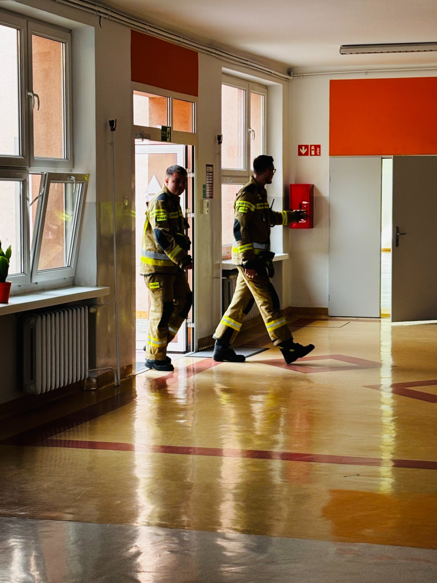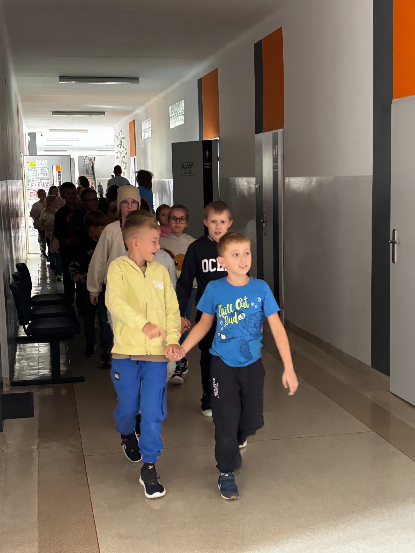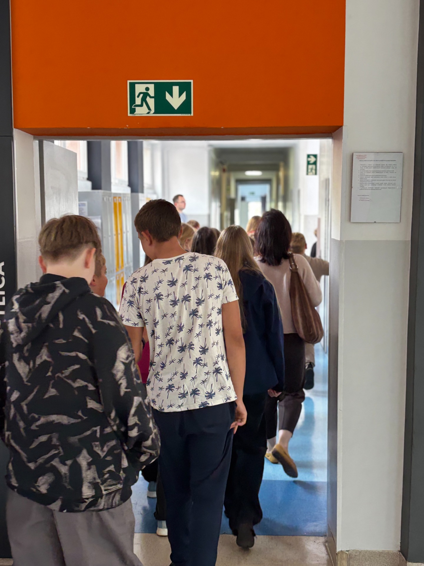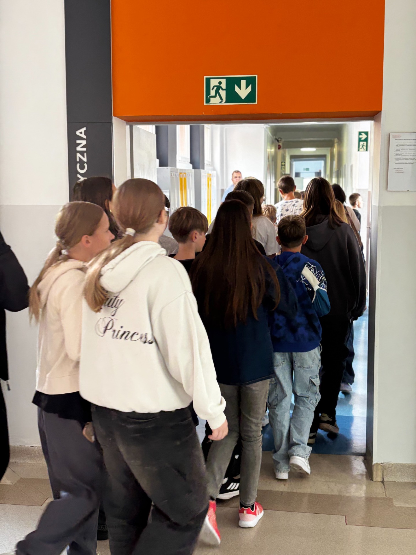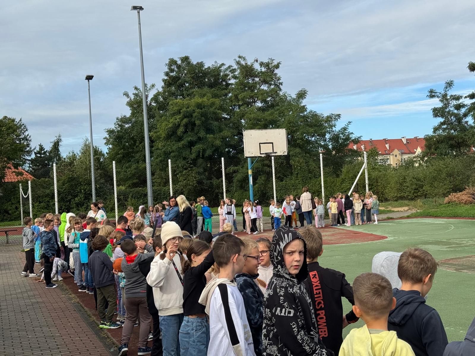 Pierwszy odcinek trasy, czyli wyjście z klasy, pokonany został w ekspresowym tempie. Każdy uczeń pamiętał, że w drodze do drzwi mają być równe szeregi, zero przepychania i krzyku paniki. W tak ważnej misji liczy się każda sekunda i opanowanie! Na korytarzach i schodach panował porządek. Uczniowie w rekordowym czasie dotarli do punktu zbiórki.