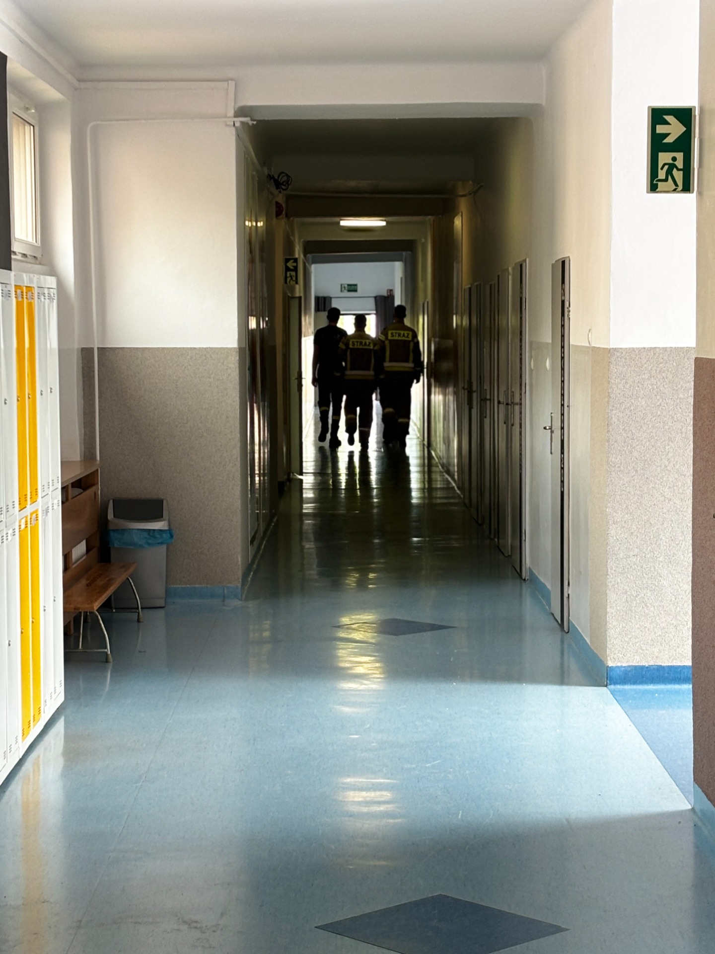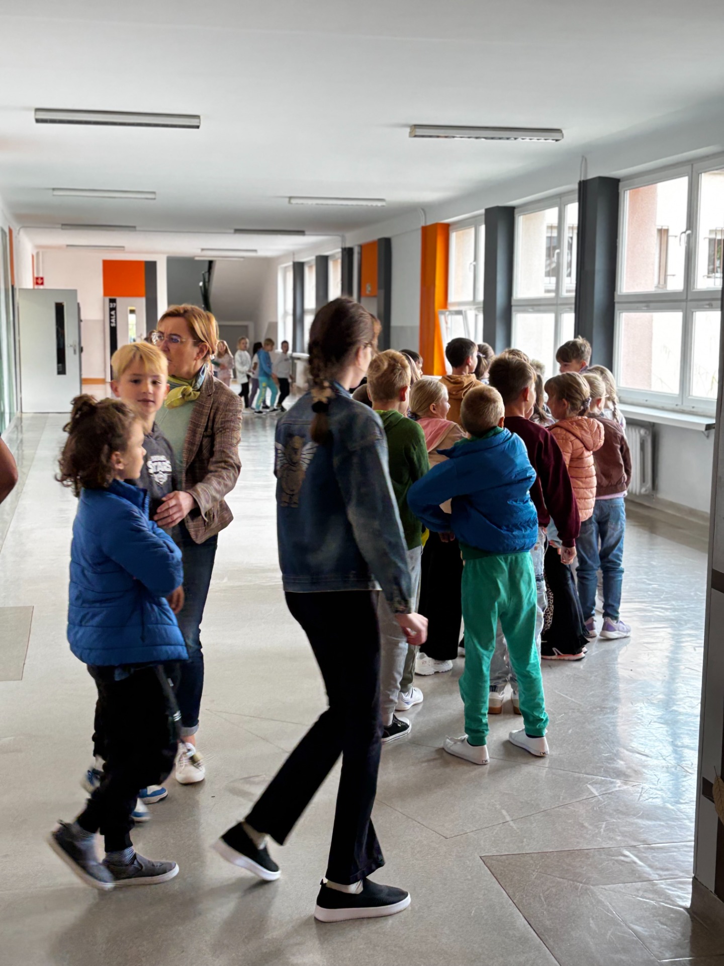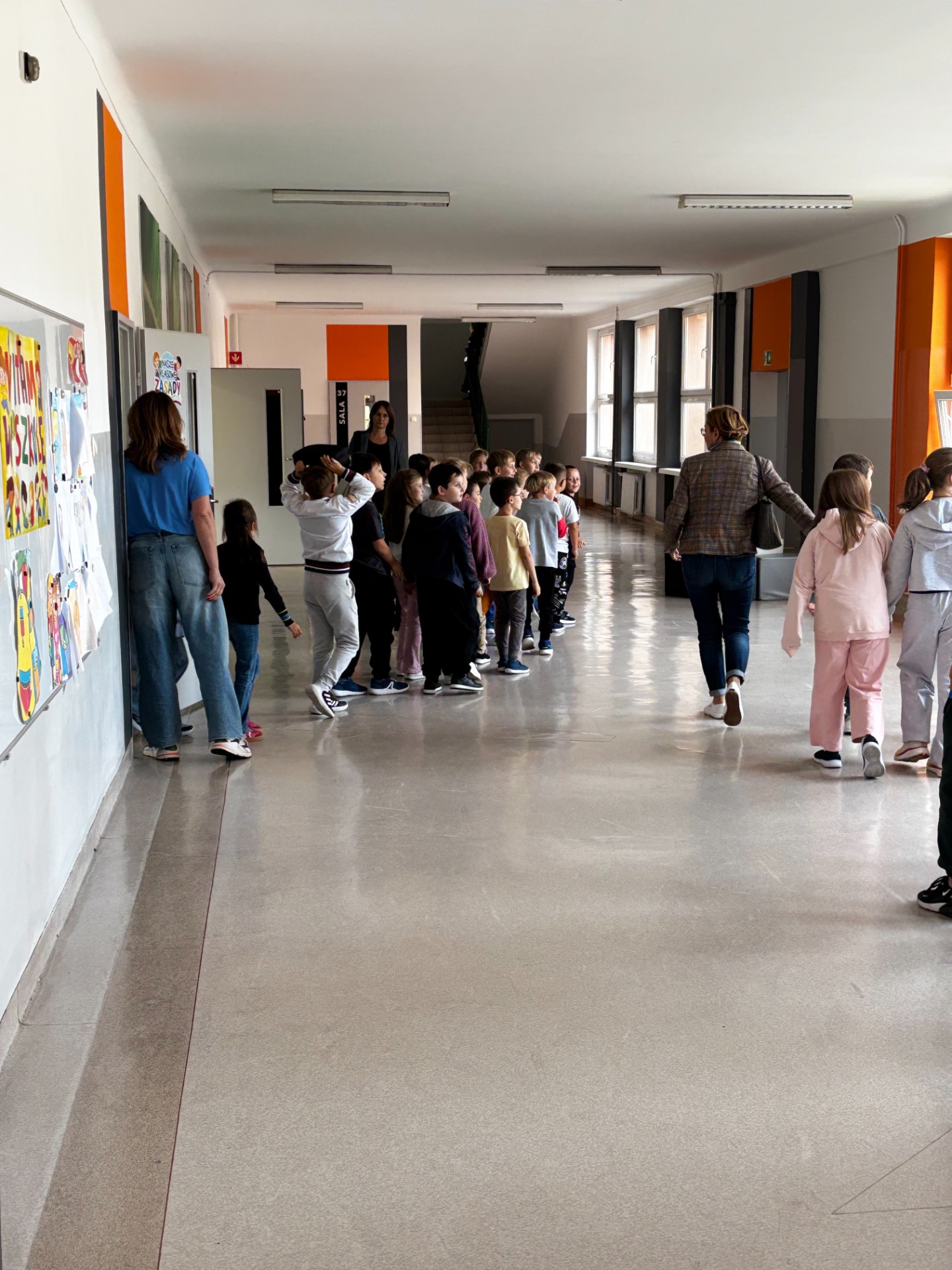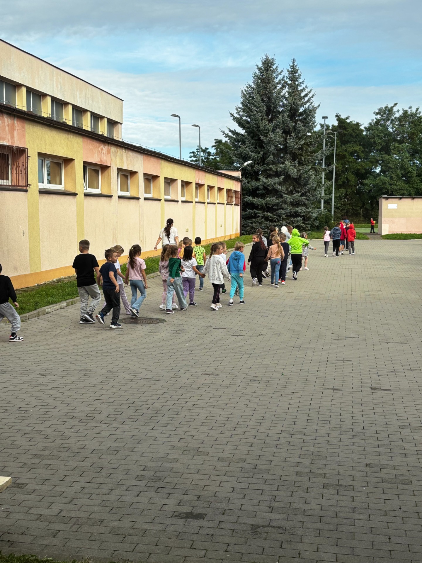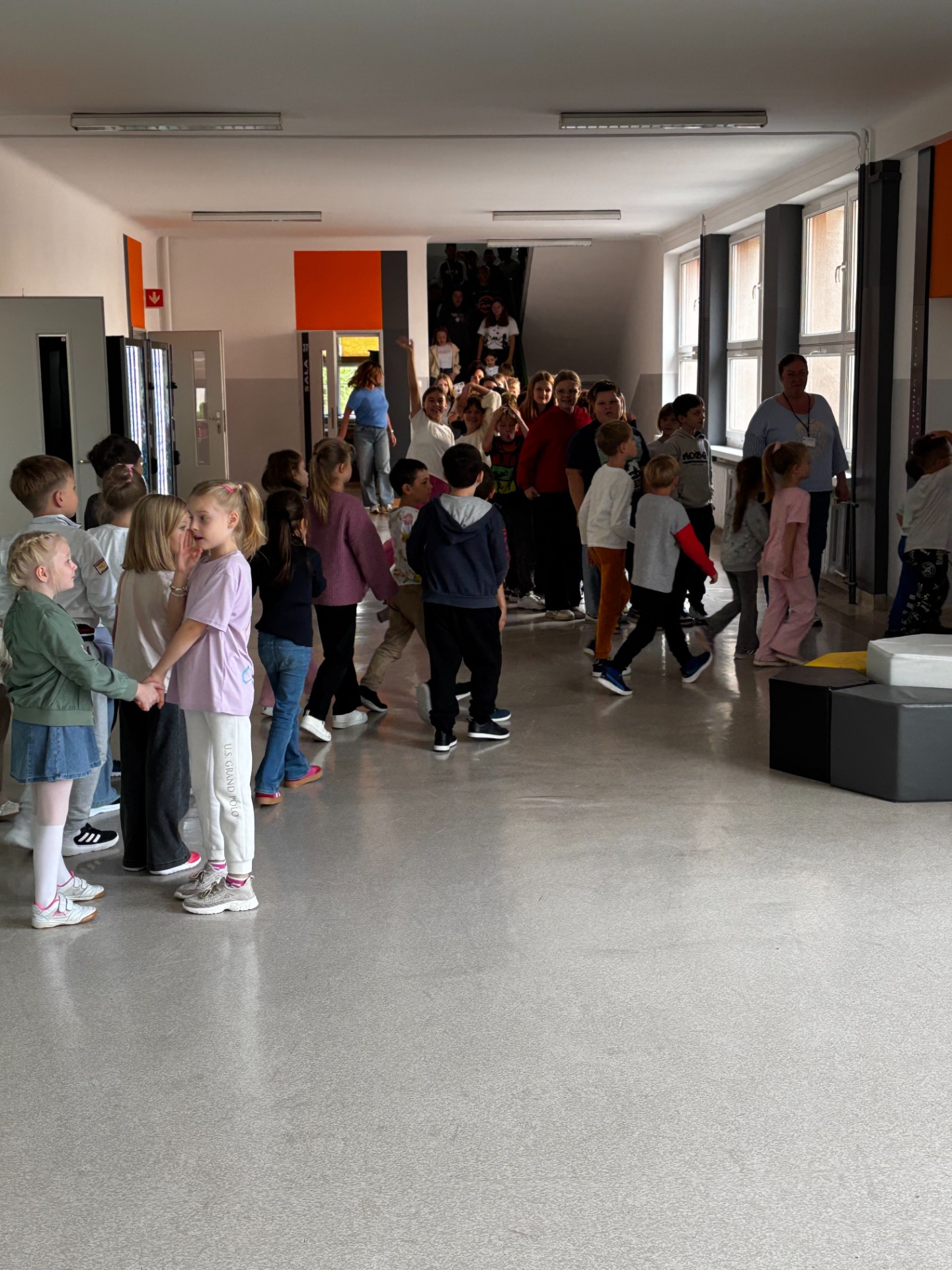 Pierwszy odcinek trasy, czyli wyjście z klasy, pokonany został w ekspresowym tempie. Każdy uczeń pamiętał, że w drodze do drzwi mają być równe szeregi, zero przepychania i krzyku paniki. W tak ważnej misji liczy się każda sekunda i opanowanie! Na korytarzach i schodach panował porządek. Uczniowie w rekordowym czasie dotarli do punktu zbiórki.