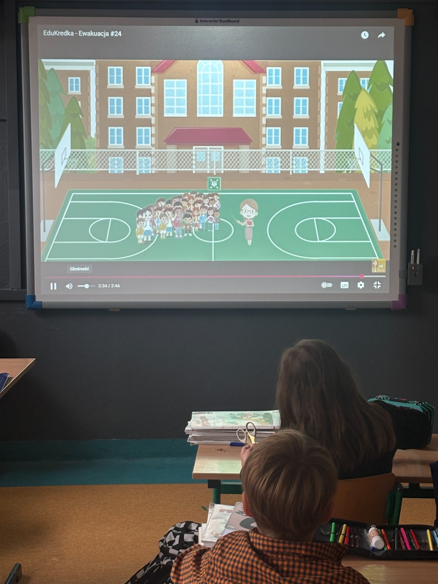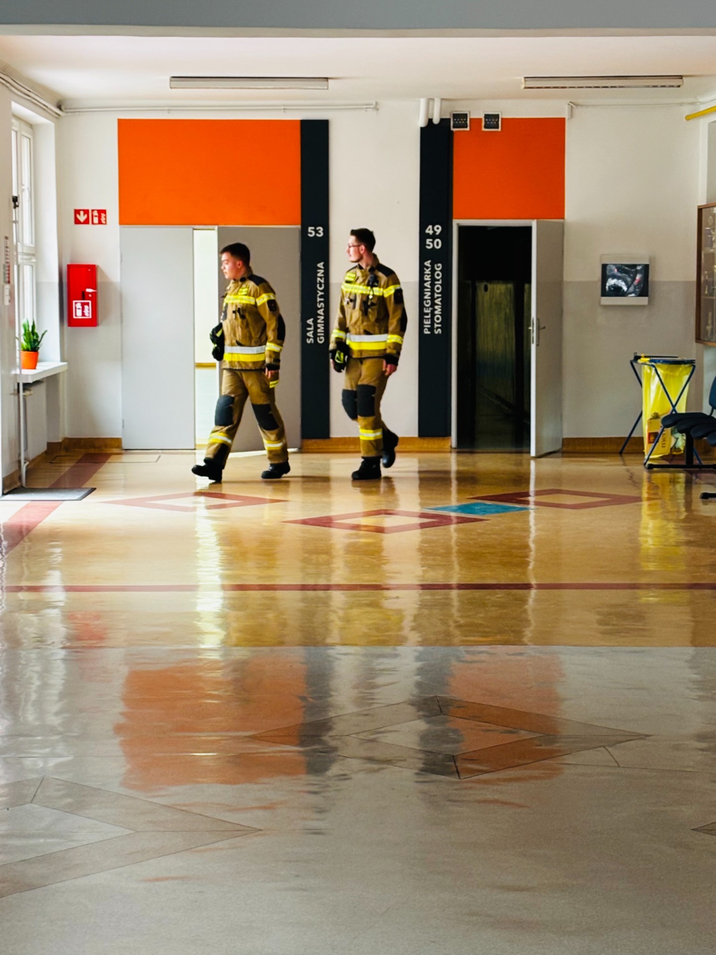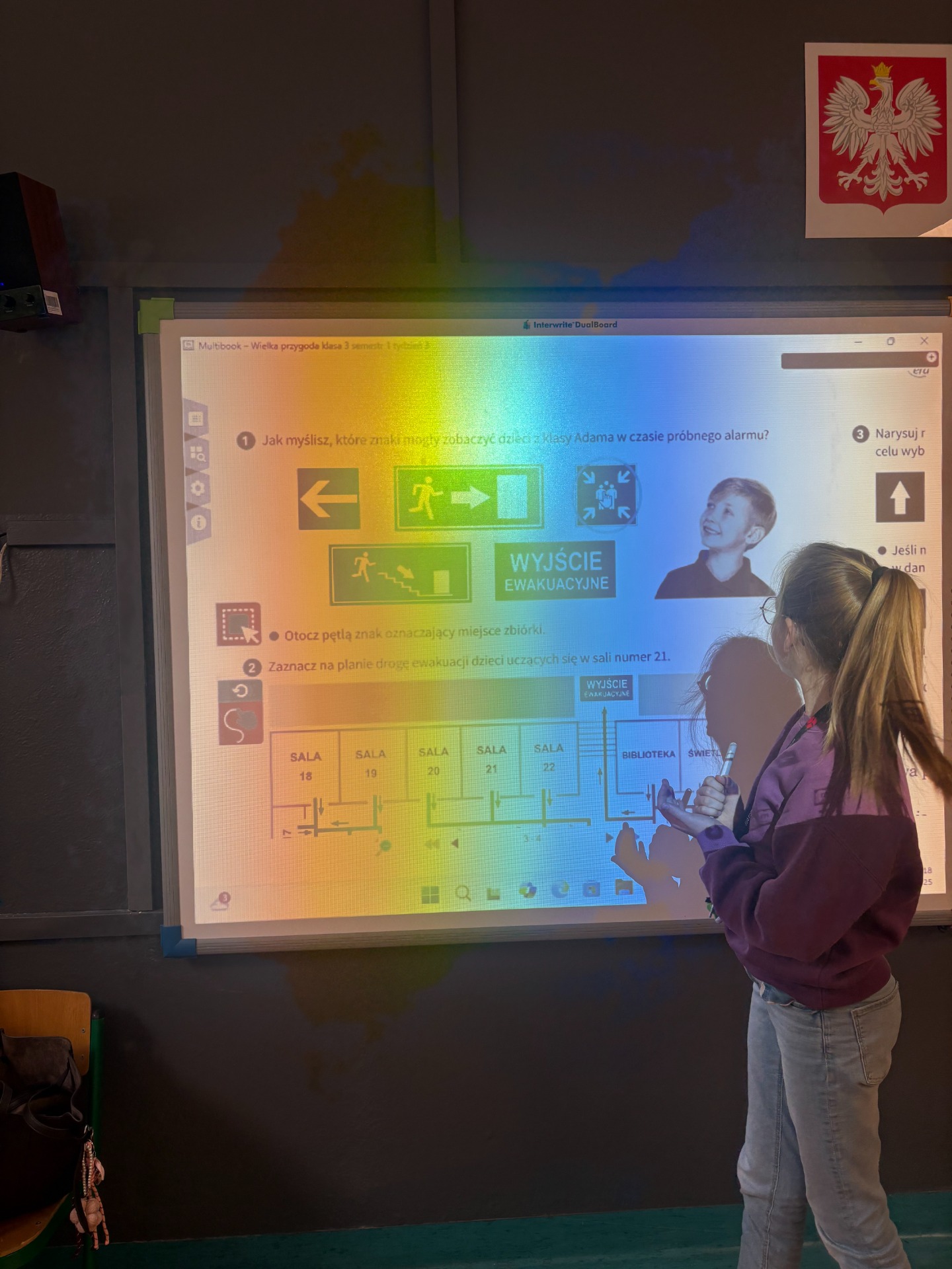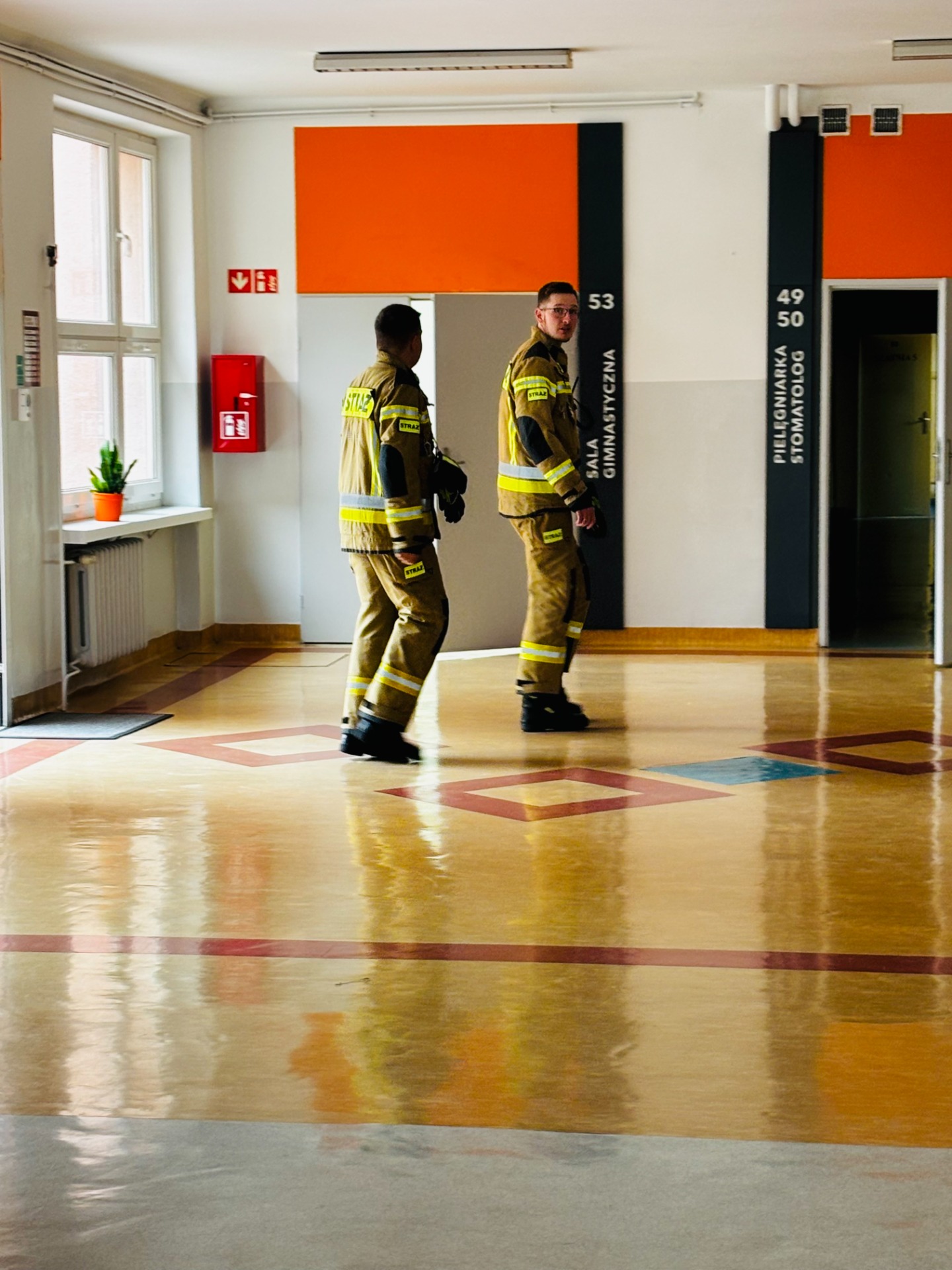 Pierwszy odcinek trasy, czyli wyjście z klasy, pokonany został w ekspresowym tempie. Każdy uczeń pamiętał, że w drodze do drzwi mają być równe szeregi, zero przepychania i krzyku paniki. W tak ważnej misji liczy się każda sekunda i opanowanie! Na korytarzach i schodach panował porządek. Uczniowie w rekordowym czasie dotarli do punktu zbiórki.