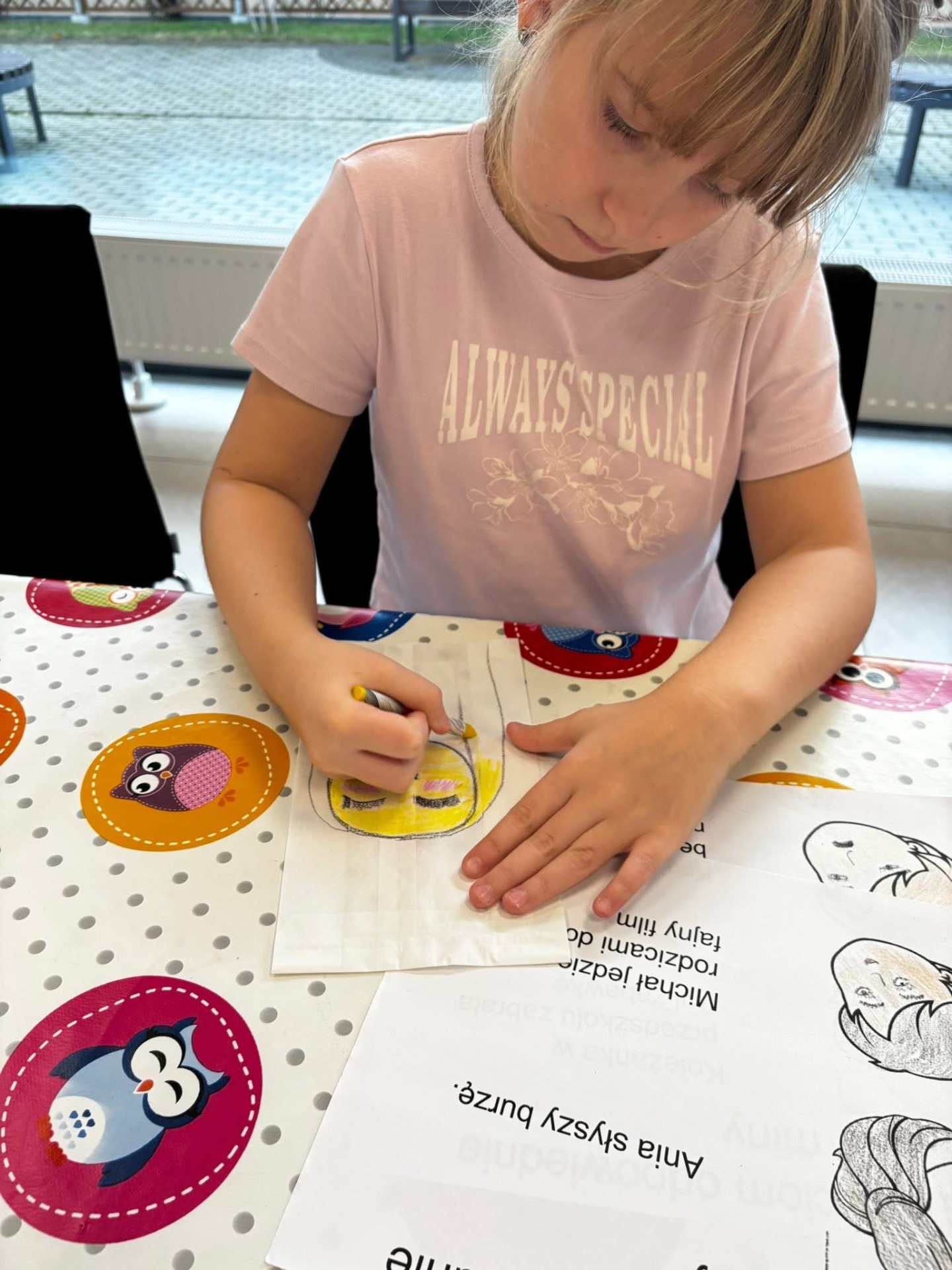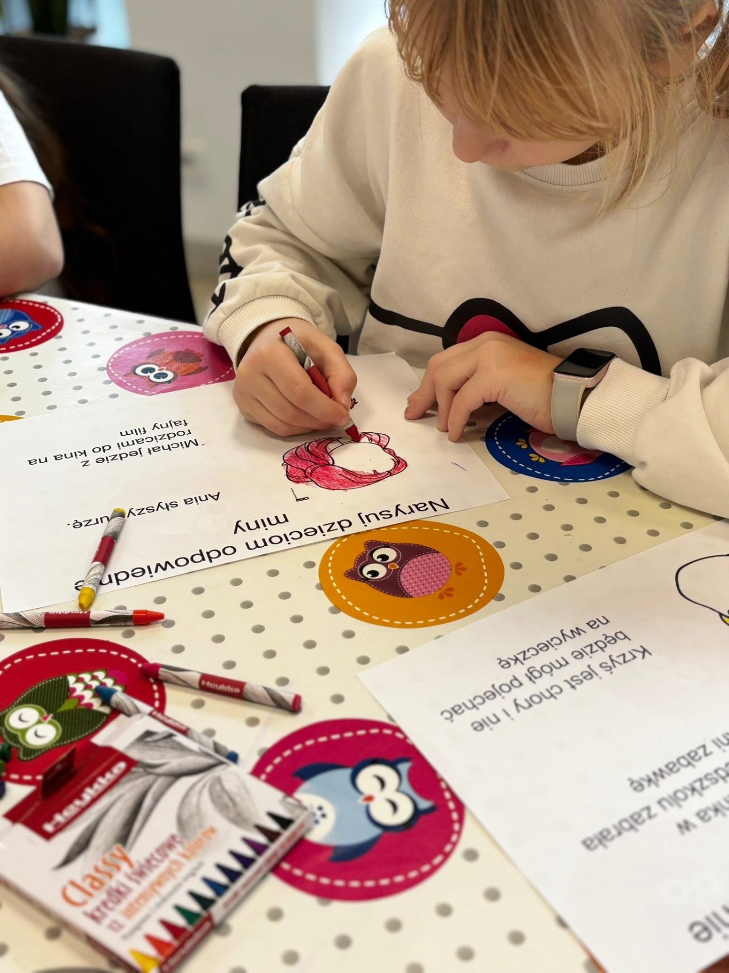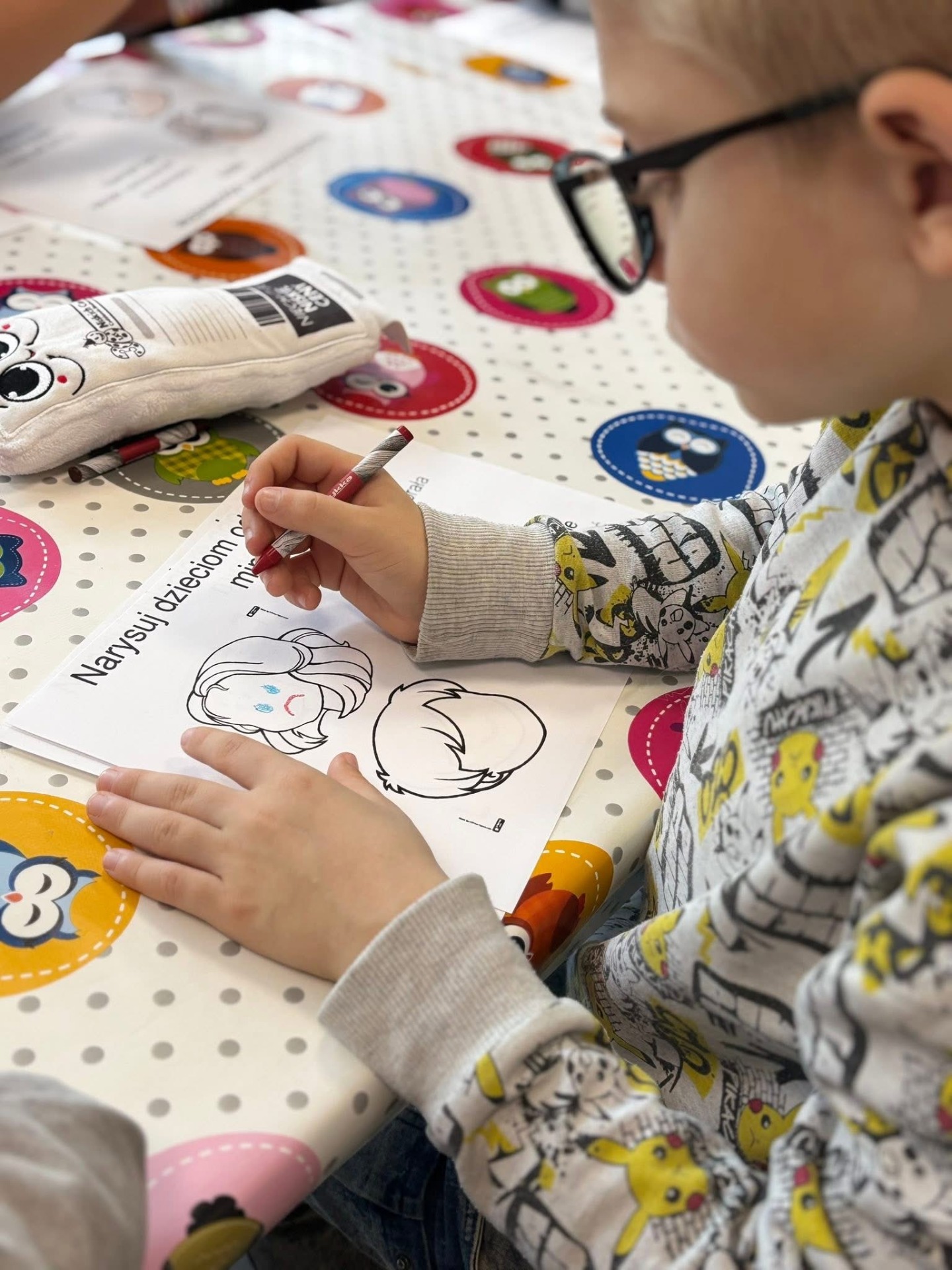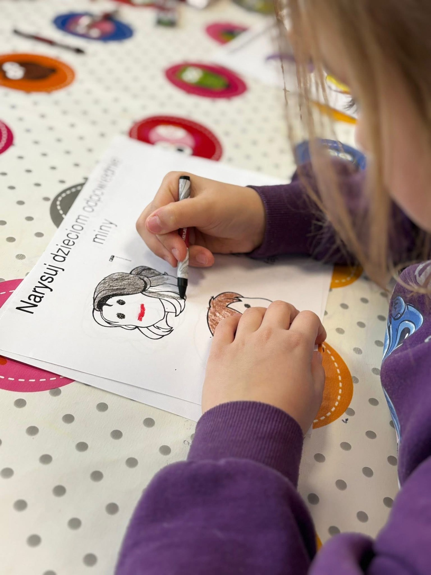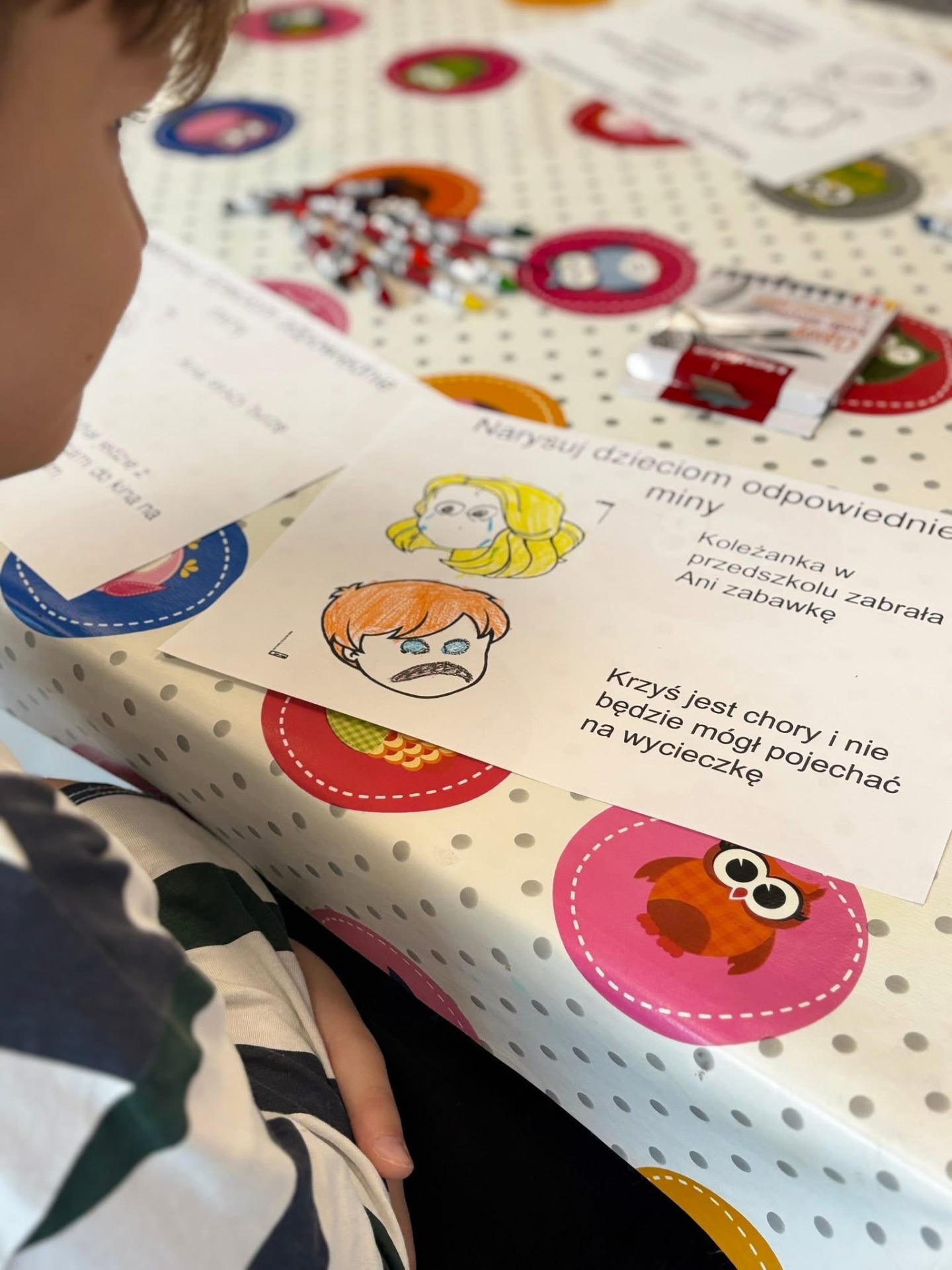 Drugim zadaniem były karty pracy – tutaj działo się! Rysowanie min do poważnych dziecięcych dylematów, np. "Koleżanka w przedszkolu zabrała Ani zabawkę" (płacz na rysunku gwarantowany) i "Michał jedzie z rodzicami do Kina na fajny film" (szeroki uśmiech od ucha to ucha!). Kto by pomyślał, że narysowanie prostej buźki może być tak wymagającym zadaniem! Oczywiście należało też zadbać o wystylizowaną fryzurę Ani i Michała oraz inne modowe gadżety.