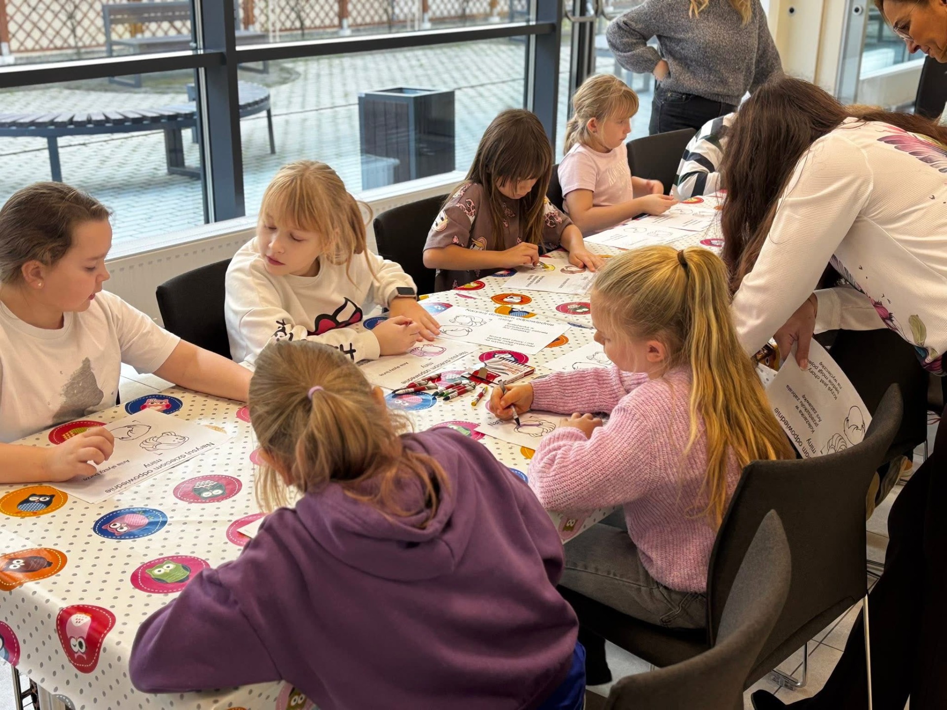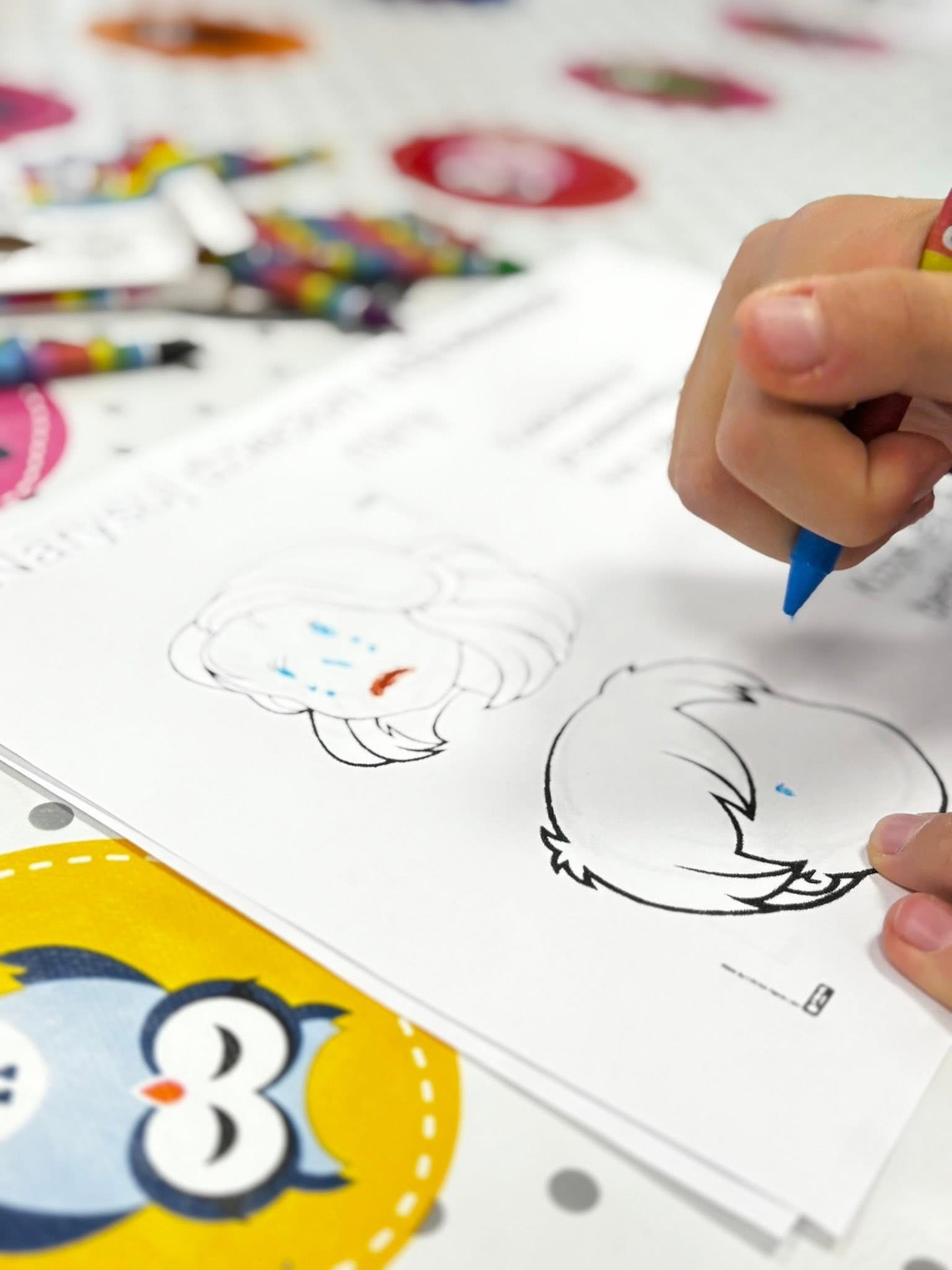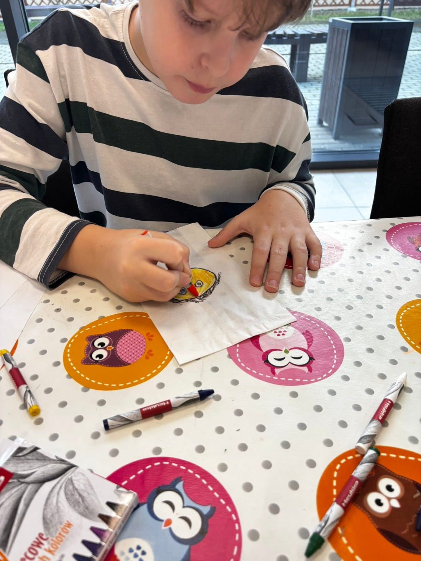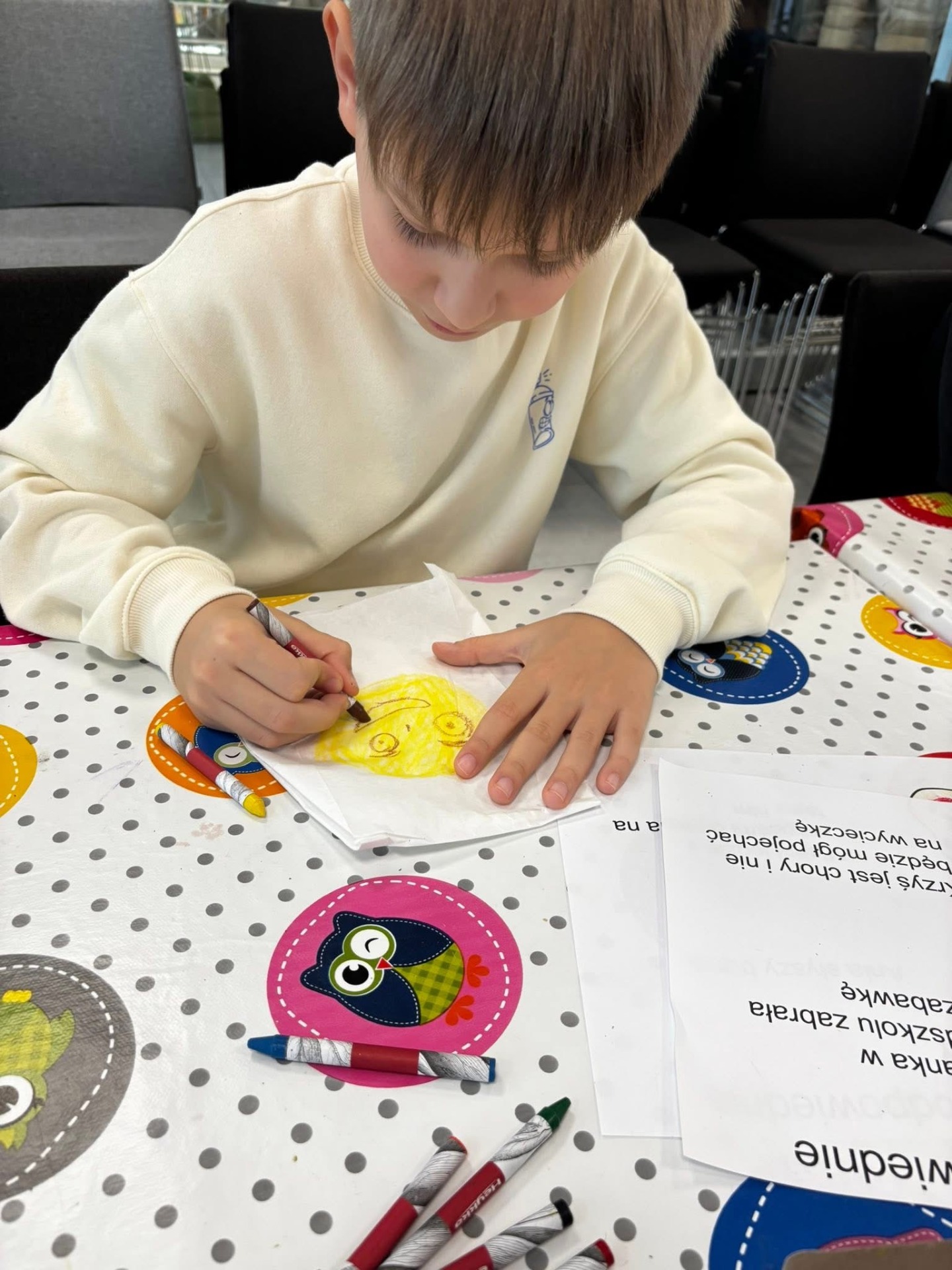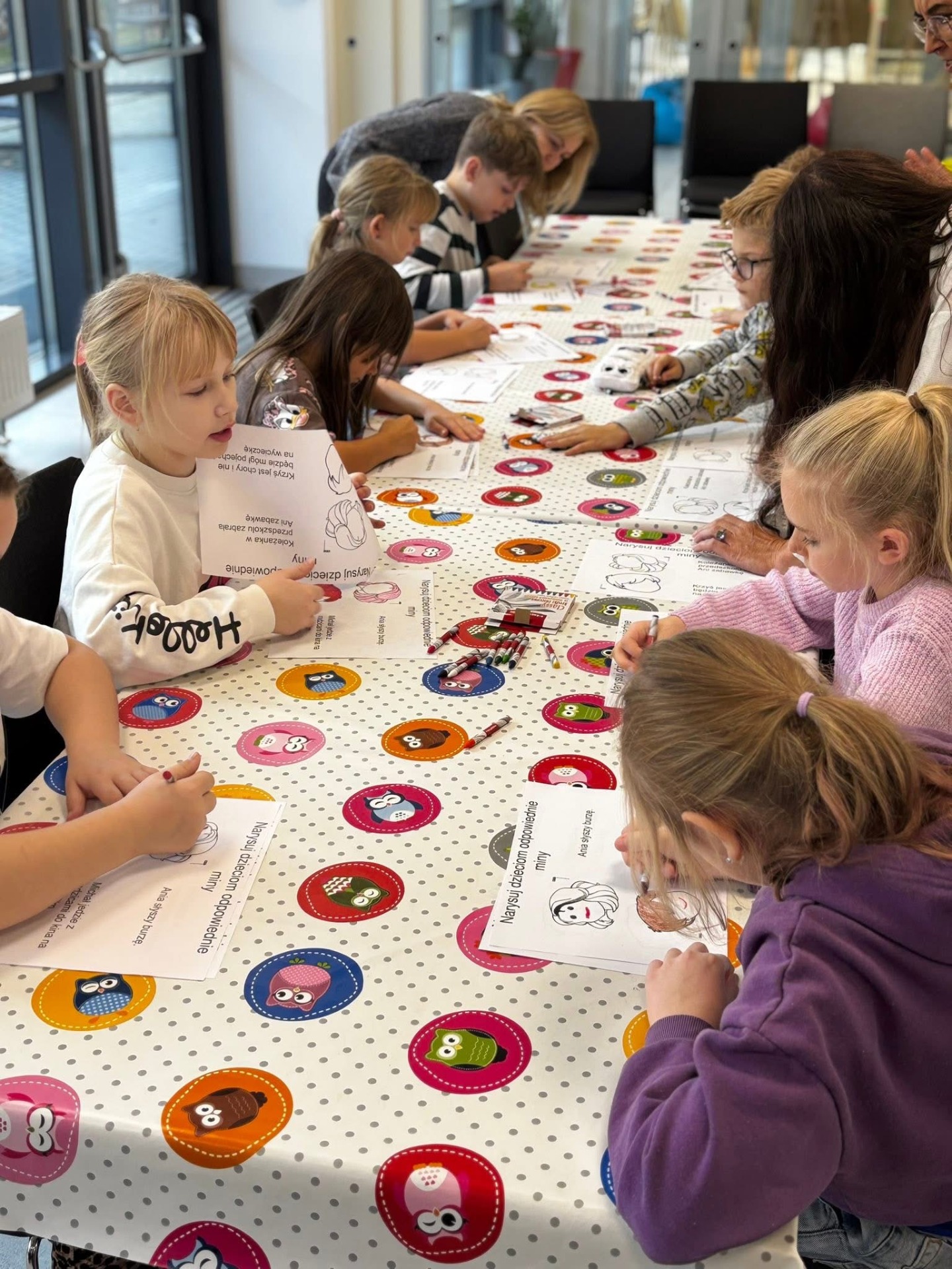 Drugim zadaniem były karty pracy – tutaj działo się! Rysowanie min do poważnych dziecięcych dylematów, np. "Koleżanka w przedszkolu zabrała Ani zabawkę" (płacz na rysunku gwarantowany) i "Michał jedzie z rodzicami do Kina na fajny film" (szeroki uśmiech od ucha to ucha!). Kto by pomyślał, że narysowanie prostej buźki może być tak wymagającym zadaniem! Oczywiście należało też zadbać o wystylizowaną fryzurę Ani i Michała oraz inne modowe gadżety.