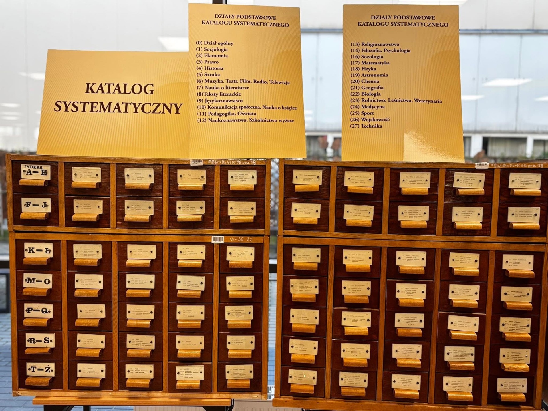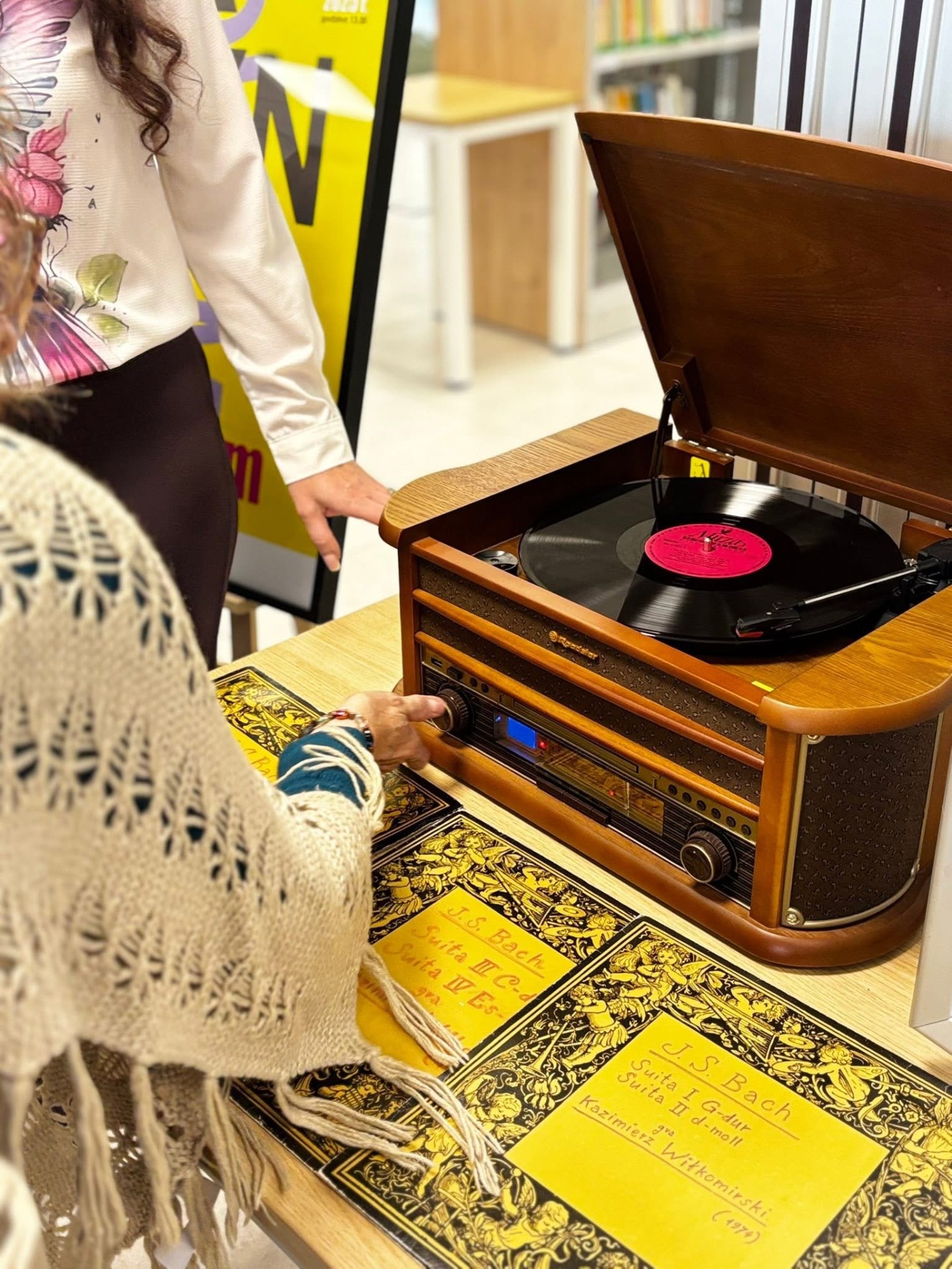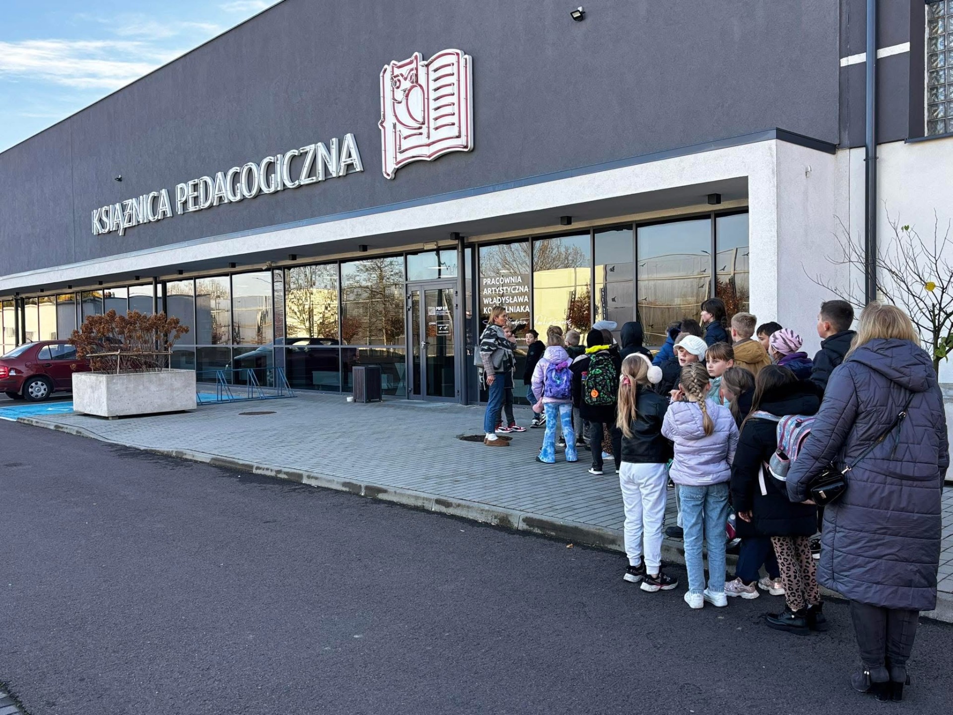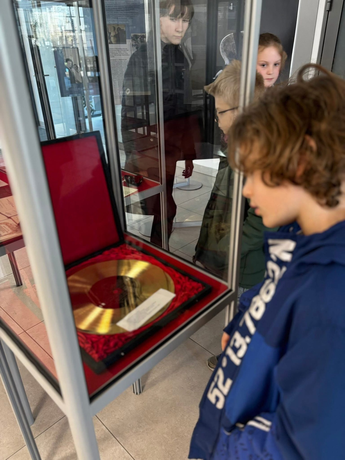 Biblioteka od A do Z, czyli zwiedzanie – ostatni punkt wycieczki - podróż w głąb bibliotecznych tajemnic. Trzecioklasiści podziwiali regały, które zdają się sięgać sufitu, oraz zabytkowy katalog kartkowy– dla dzisiejszych dzieci to chyba eksponat bardziej ekscytujący niż złota płyta na wystawie! Co więcej, odbyliśmy prawdziwą podróż w czasie, bo uczniowie mieli okazję posłuchać muzyki z adaptera, czyli płyty winylowej! Szum, trzaski i magiczny dźwięk – to jest to!