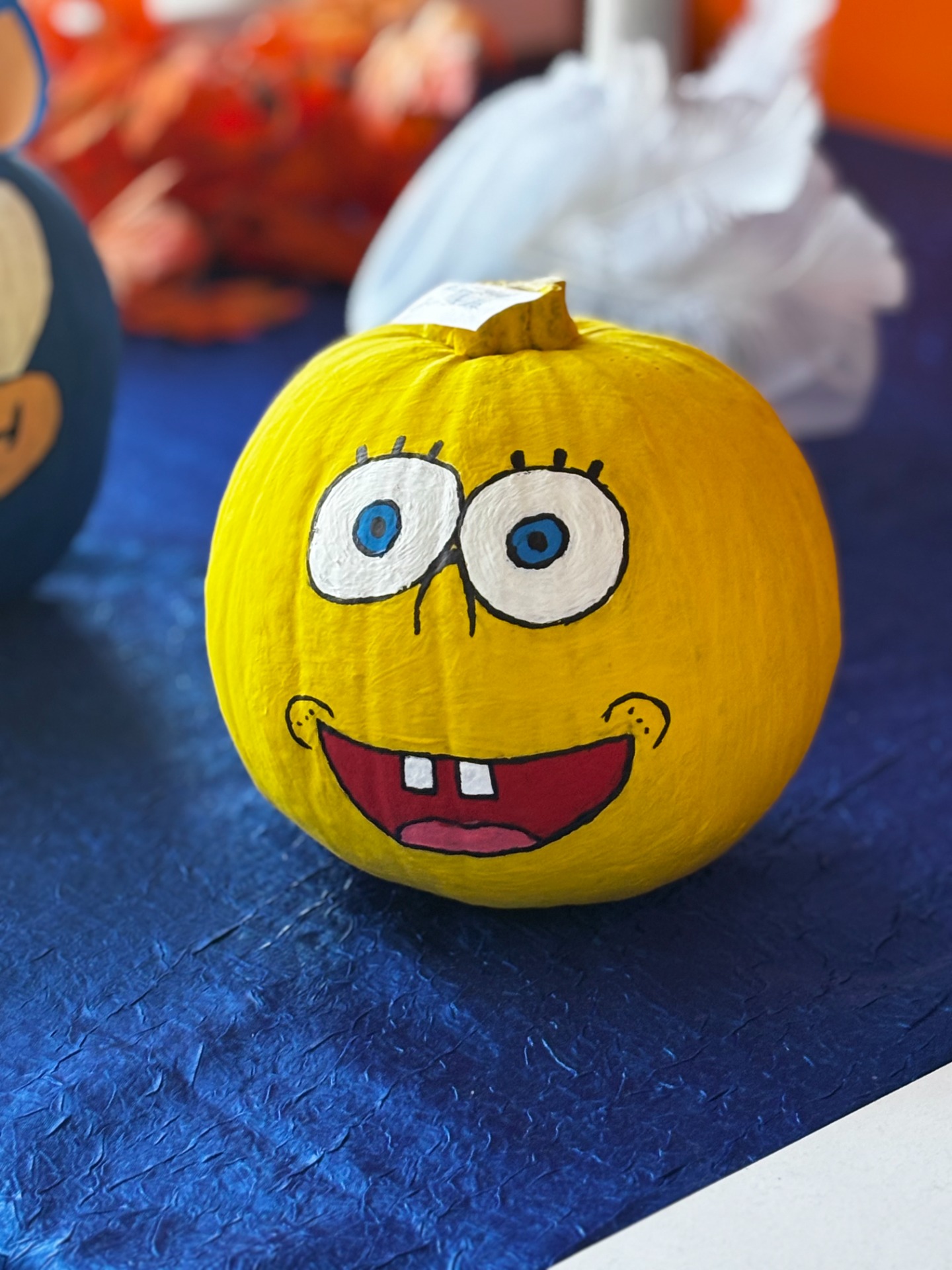 Dyniowy Spongebob (czy raczej "Spongebob Dynia- Kanciastoporty"?), świecący żółcią, gotowy, by smażyć kraboburgery 🤭
