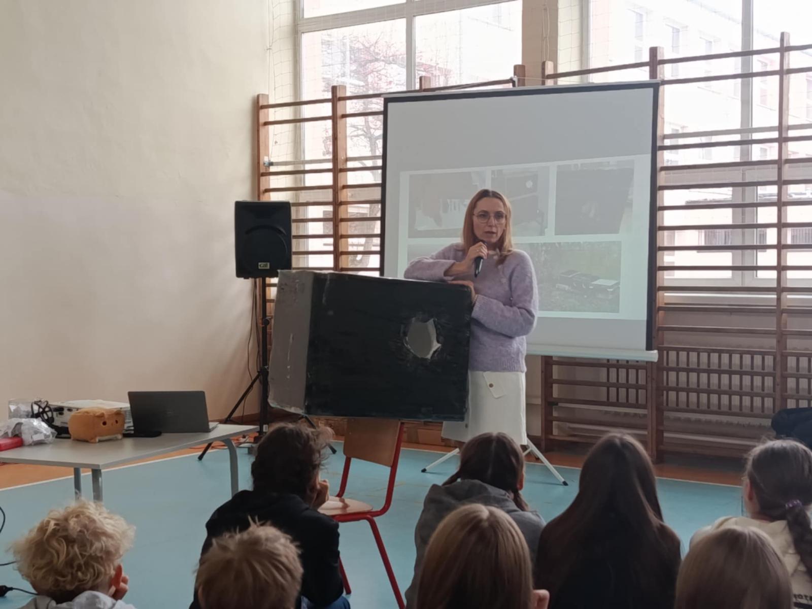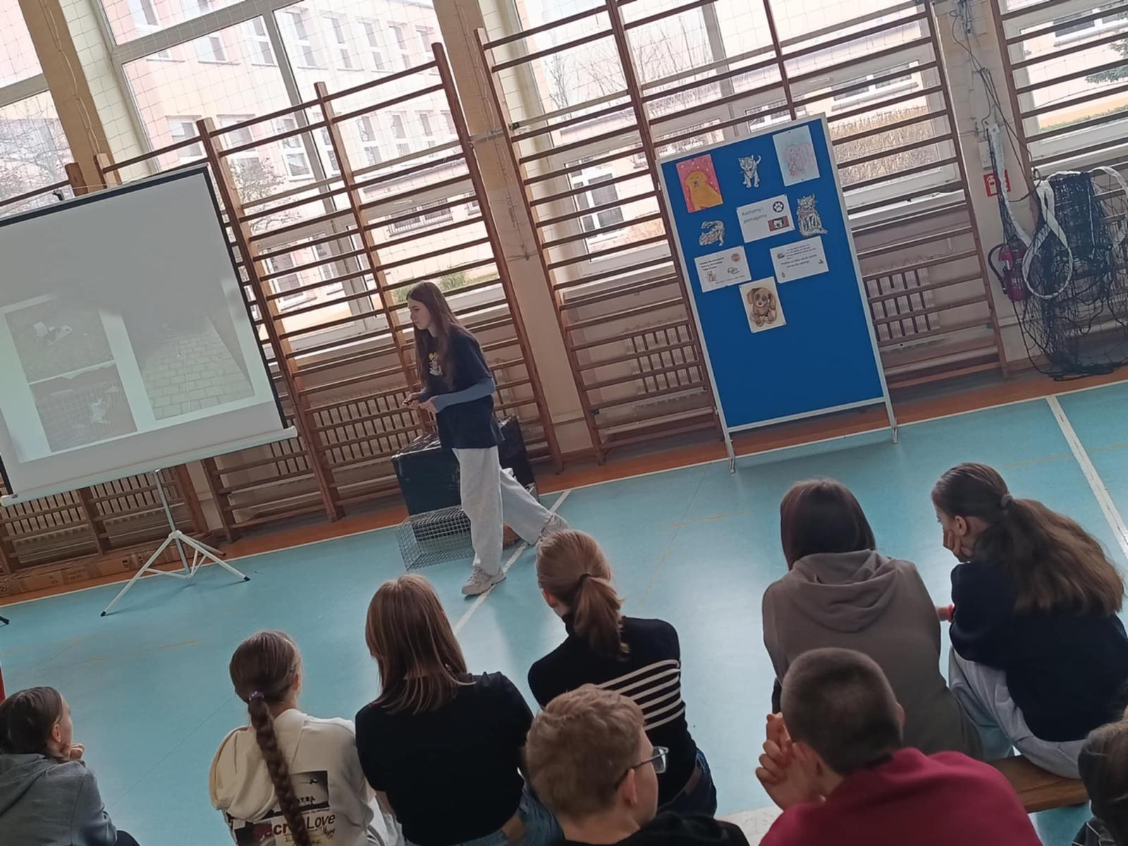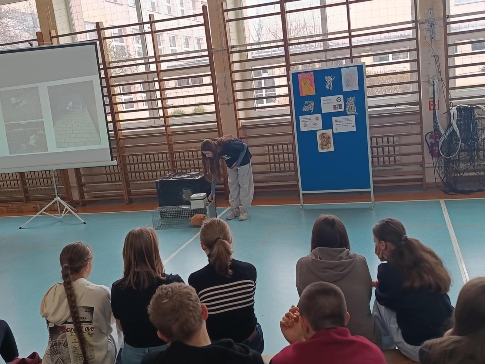 Pani Magdalena mówiła tak barwnie, tak radośnie, tak ciekawie, że uczniowie słuchali jak zaczarowani. A opowiadała o naprawdę ważnych i bardzo potrzebnych rzeczach: o tym, jak mądrze i bezpiecznie pomagać kotom wolno żyjącym, gdzie zgłosić kotka, który potrzebuje pomocy, jak rozpoznać koty wysterylizowane, otóż jak się okazało, te kotki mają swoje małe sekrety, dowiedzieliśmy się czym jest domek dla wolnych kotów i że każdy z nas może taki domek samodzielnie stworzyć,a także jak działa klatka–łapka czyli magiczne urządzenie, które potrafi uratować kocie życie.