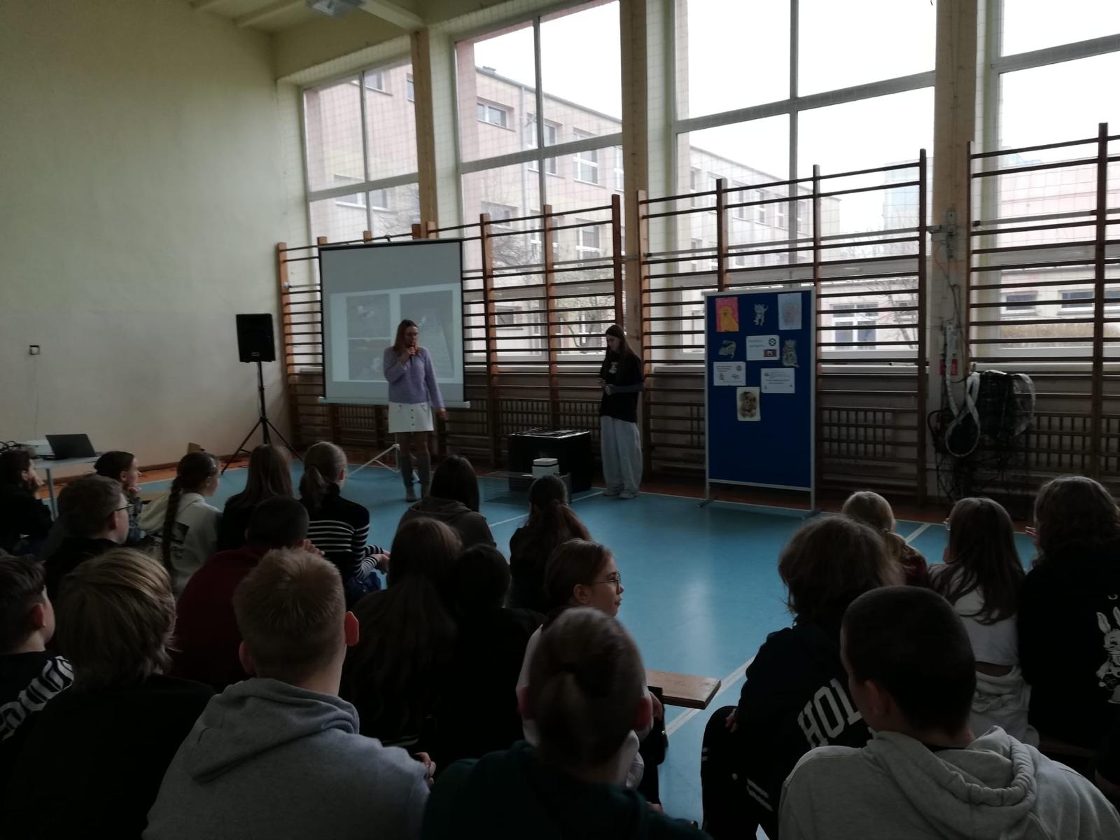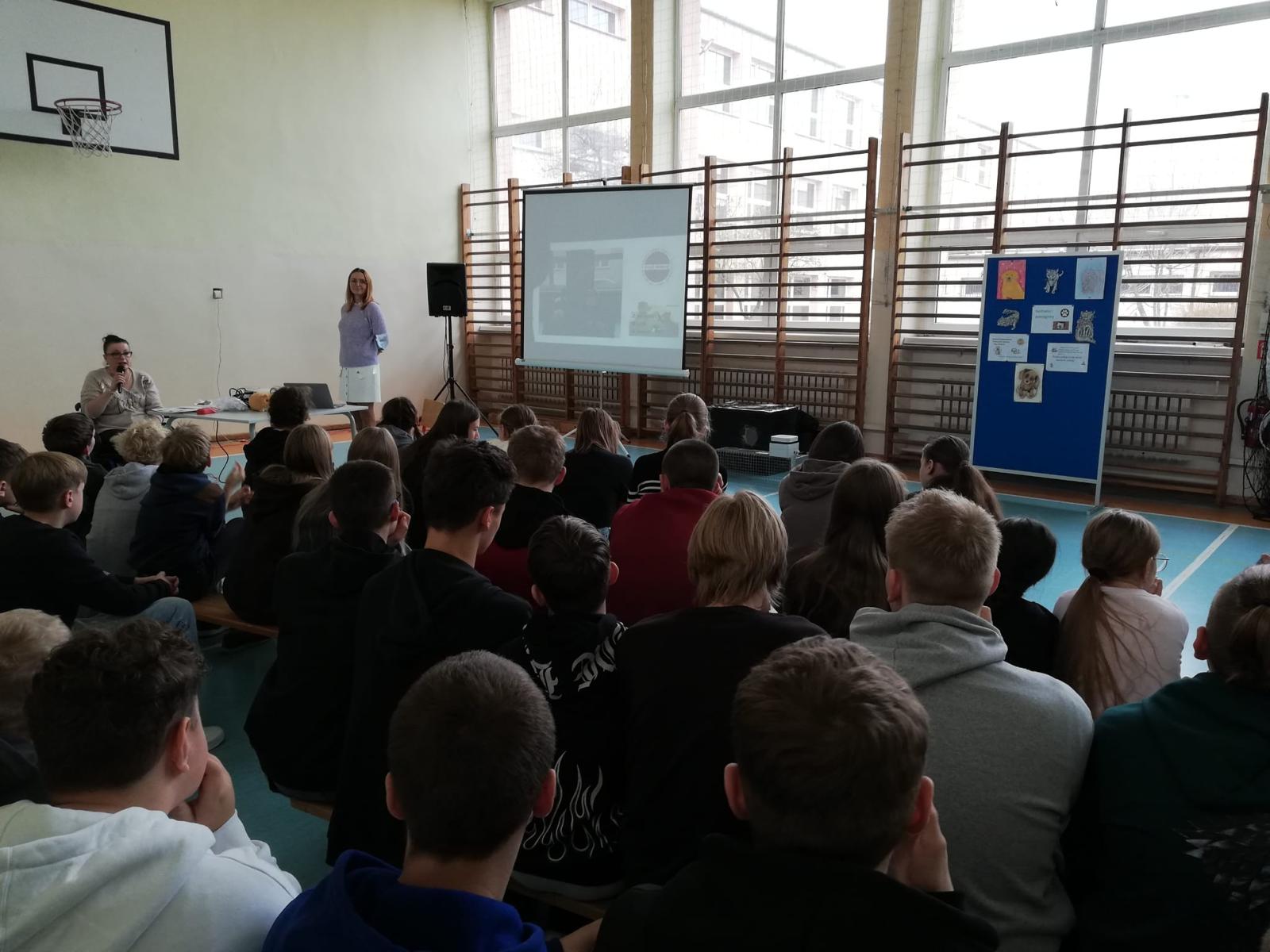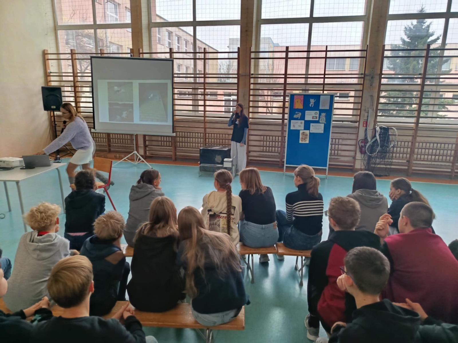 Pani Magdalena mówiła tak barwnie, tak radośnie, tak ciekawie, że uczniowie słuchali jak zaczarowani. A opowiadała o naprawdę ważnych i bardzo potrzebnych rzeczach: o tym, jak mądrze i bezpiecznie pomagać kotom wolno żyjącym, gdzie zgłosić kotka, który potrzebuje pomocy, jak rozpoznać koty wysterylizowane, otóż jak się okazało, te kotki mają swoje małe sekrety, dowiedzieliśmy się czym jest domek dla wolnych kotów i że każdy z nas może taki domek samodzielnie stworzyć,a także jak działa klatka–łapka czyli magiczne urządzenie, które potrafi uratować kocie życie.
