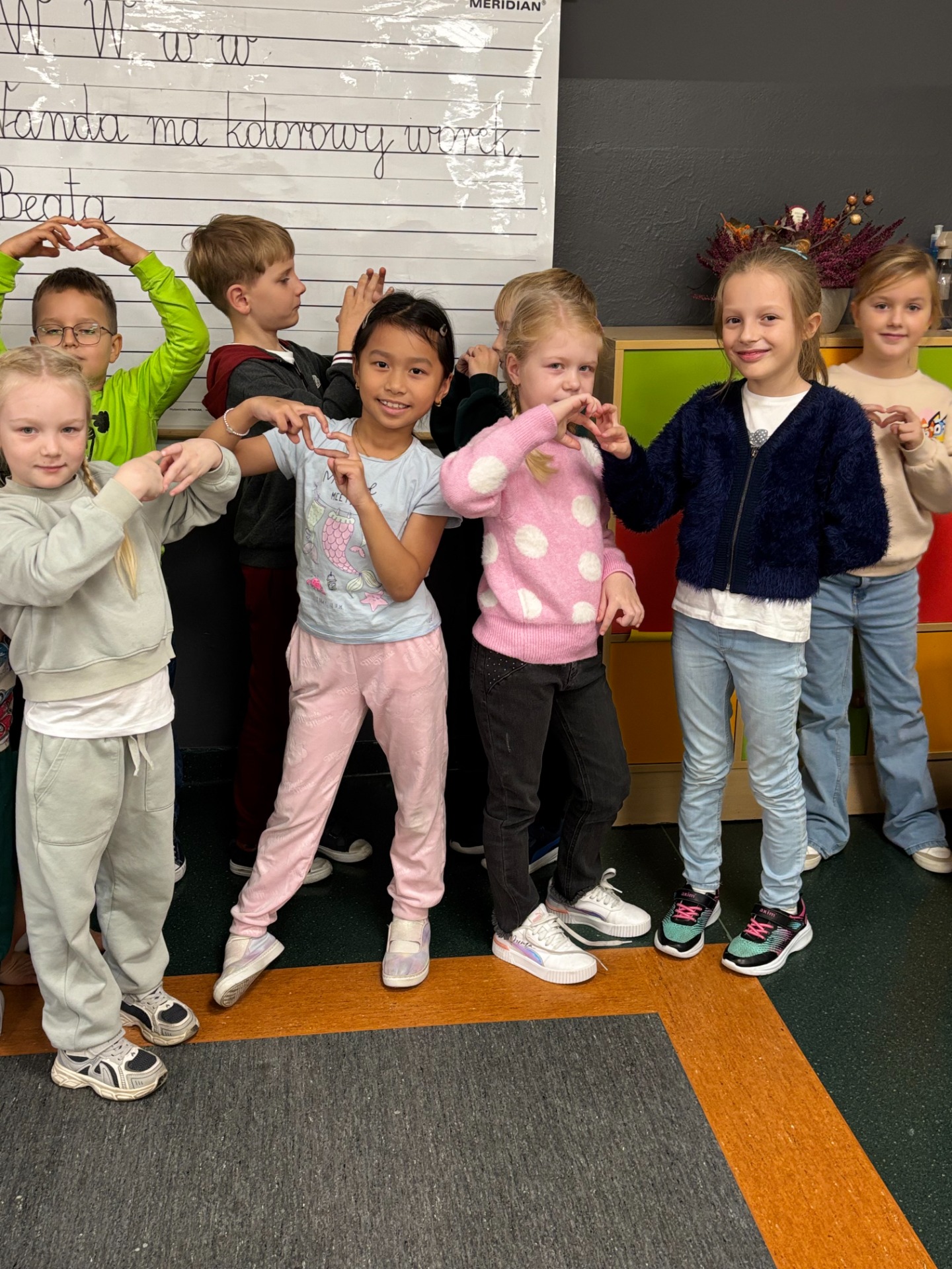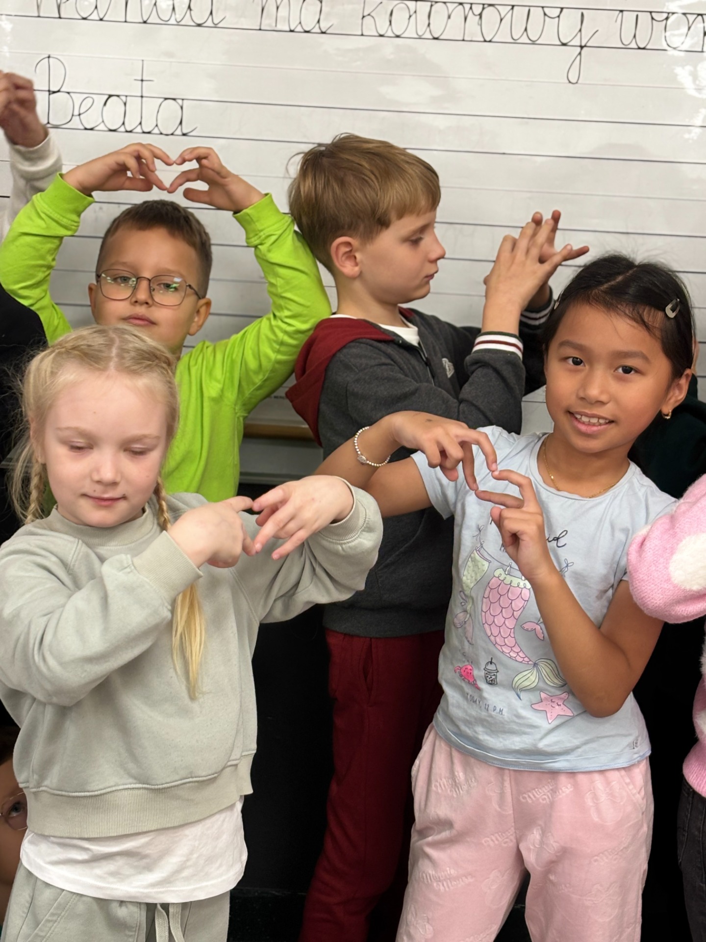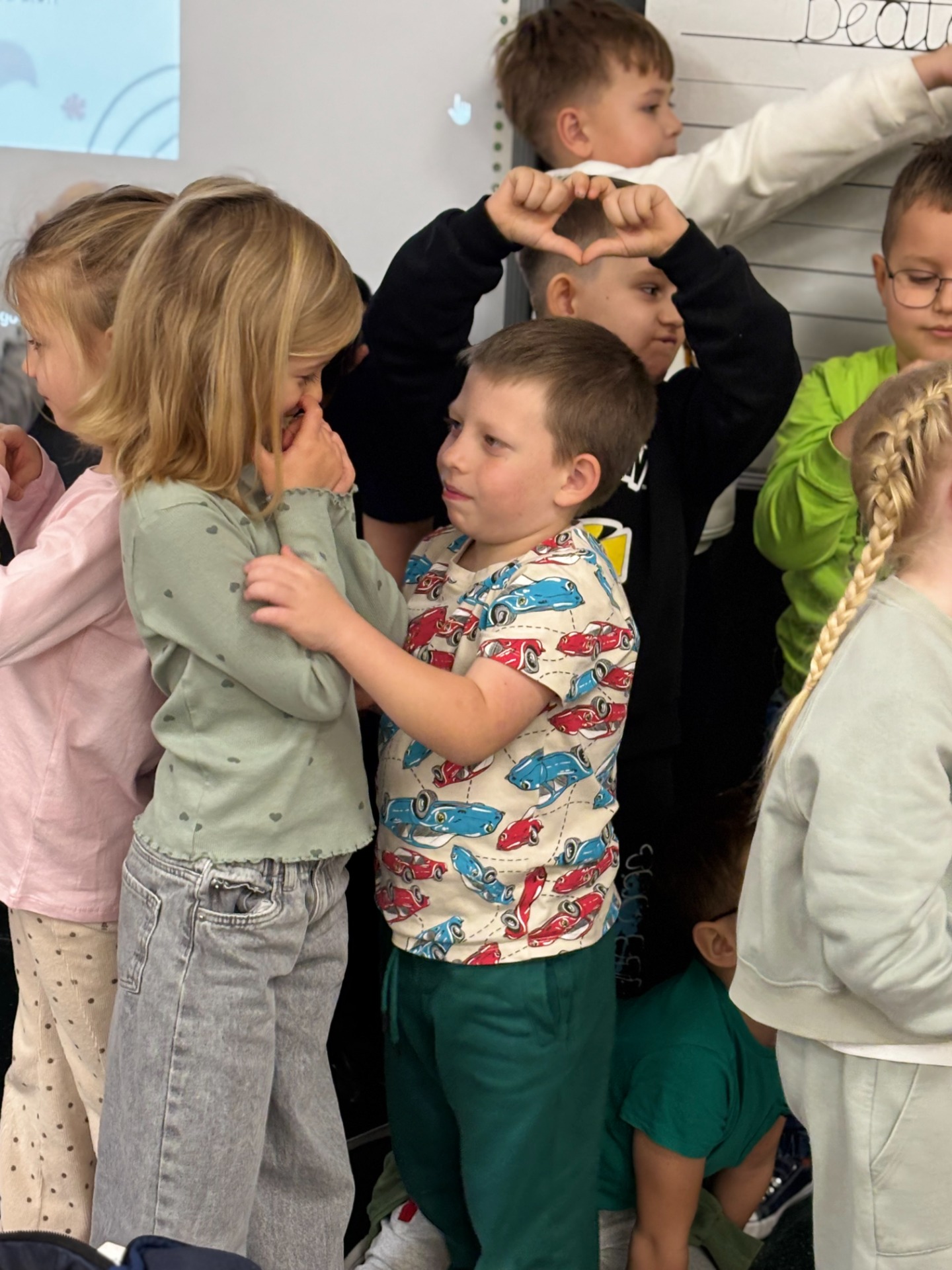 Ale prawdziwym klejnotem, który rozświetlił całą chwilę, okazało się czułe wyznanie w języku migowym! Uczniowie przekazywali sobie gest "KOCHAM CIĘ", udowadniając, że życzliwość nie potrzebuje słów, aby mówić głośno i wyraźnie!