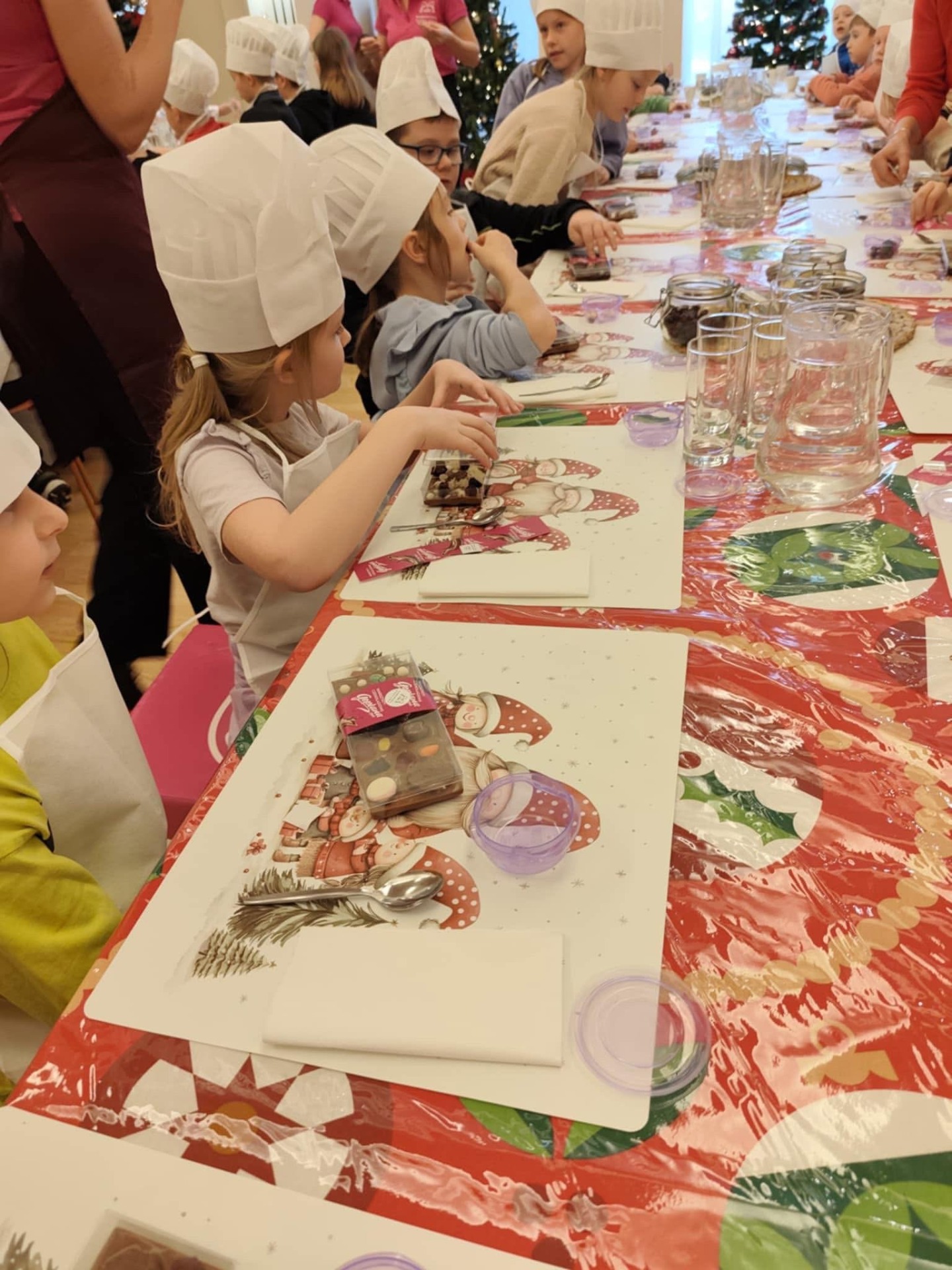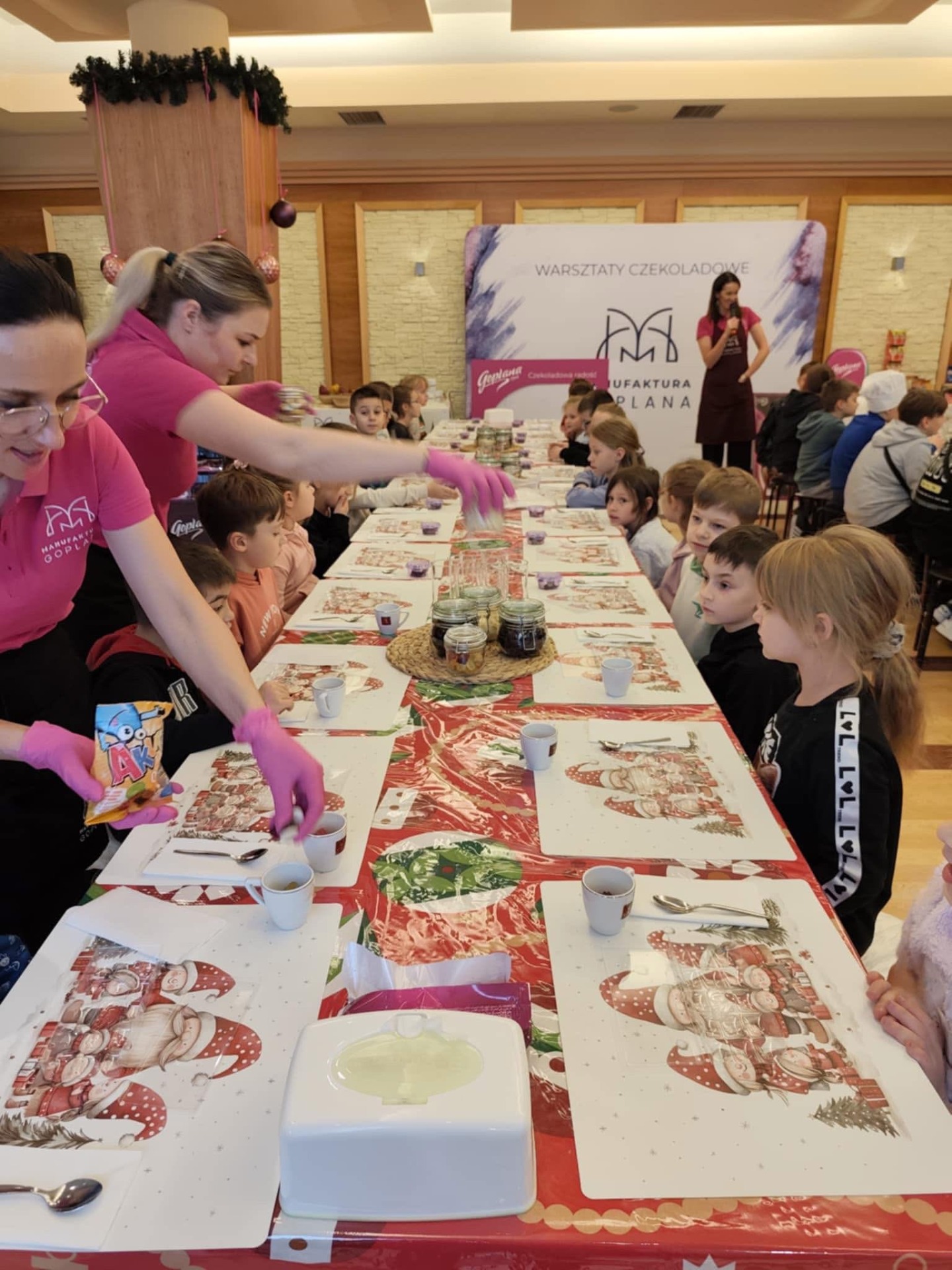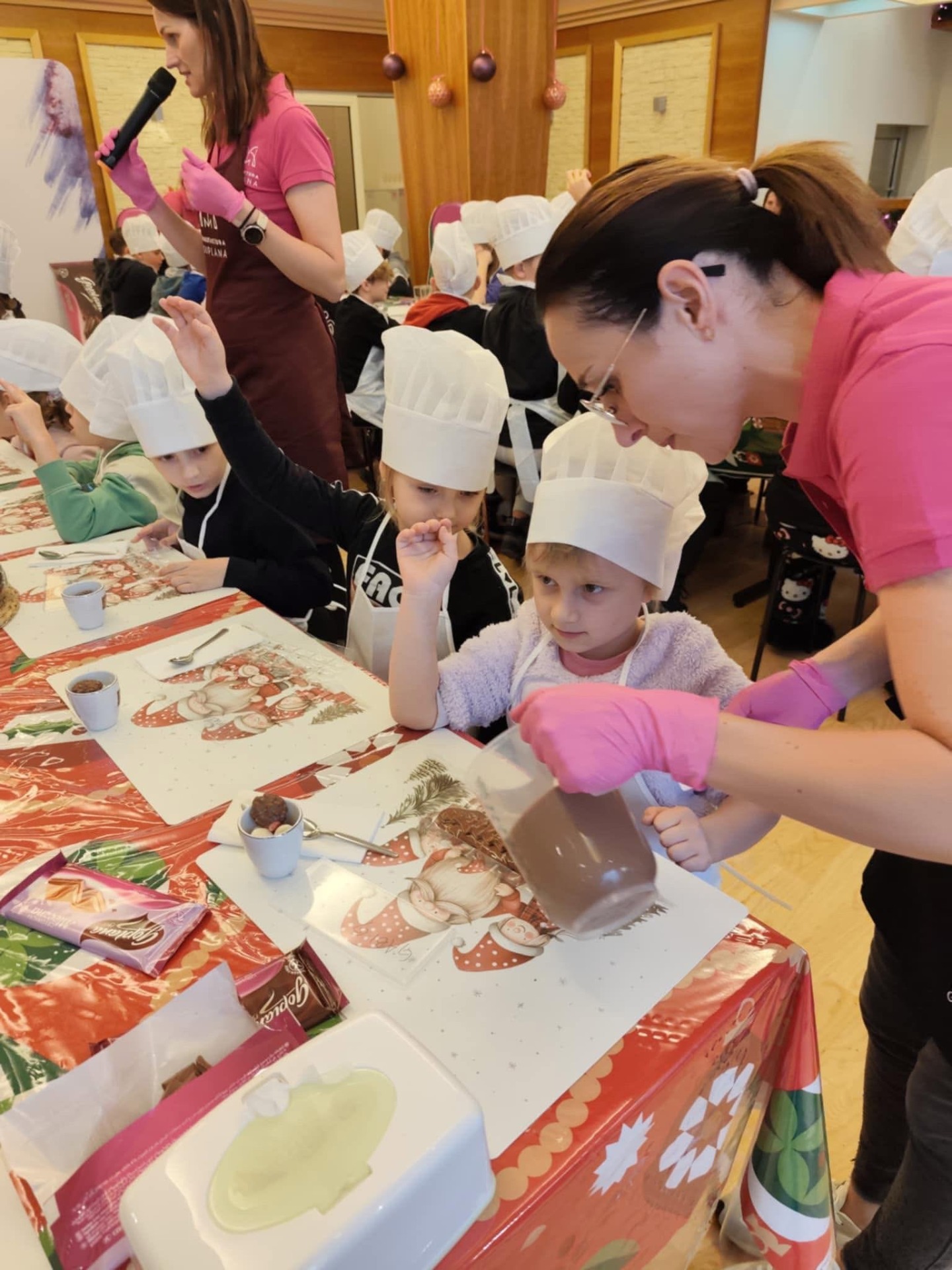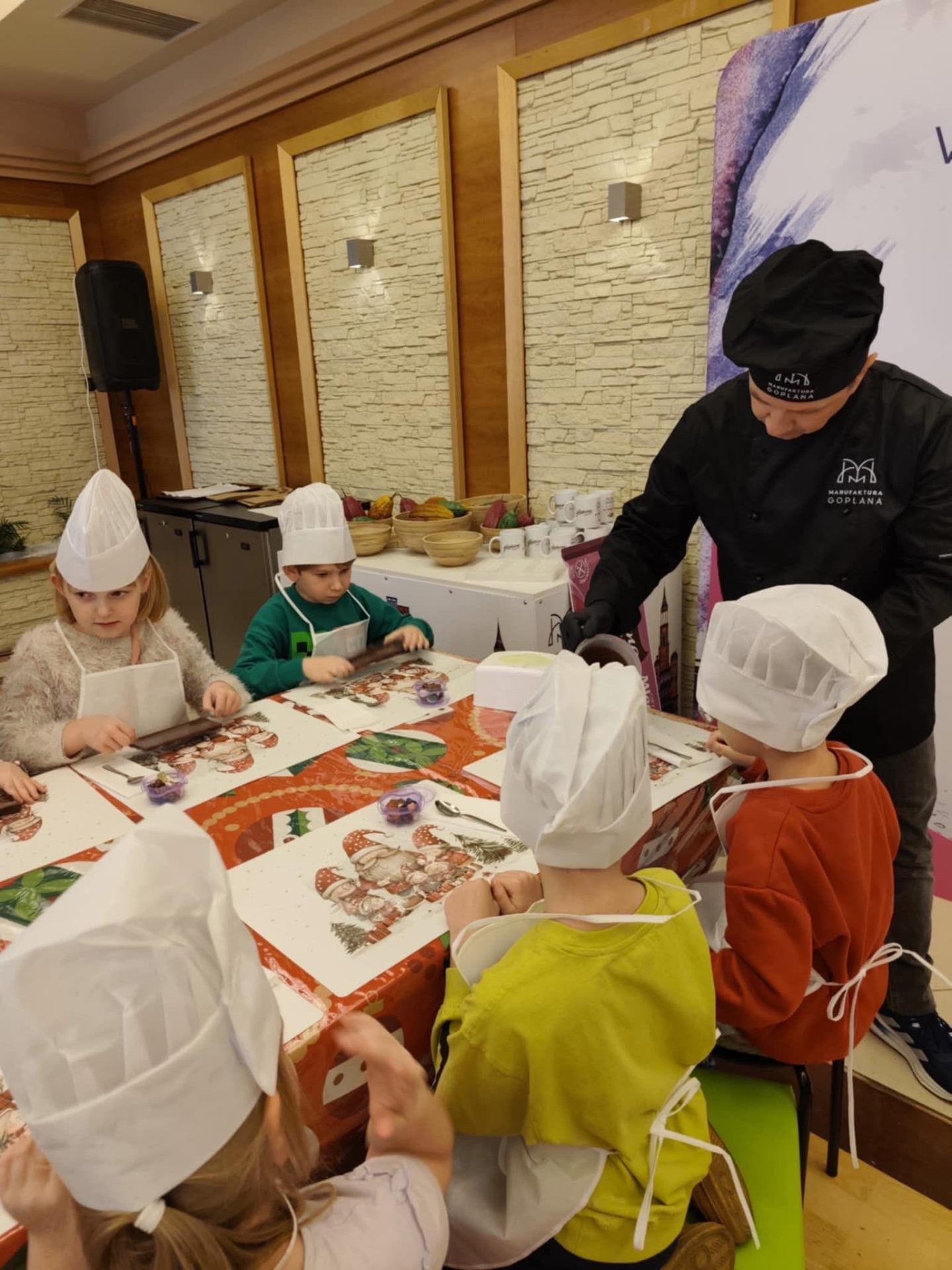 Uczniowie wcielili się w małych mistrzów cukiernictwa i mogli własnoręcznie stworzyć swoje niepowtarzalne czekoladki z pysznej czekolady Goplana. Najwięcej frajdy sprawiała dekoracja, bo na stołach kusiły bakalie, żelki oraz chrupiące ciasteczka, dzięki którym każde dzieło nabierało wyjątkowego charakteru.