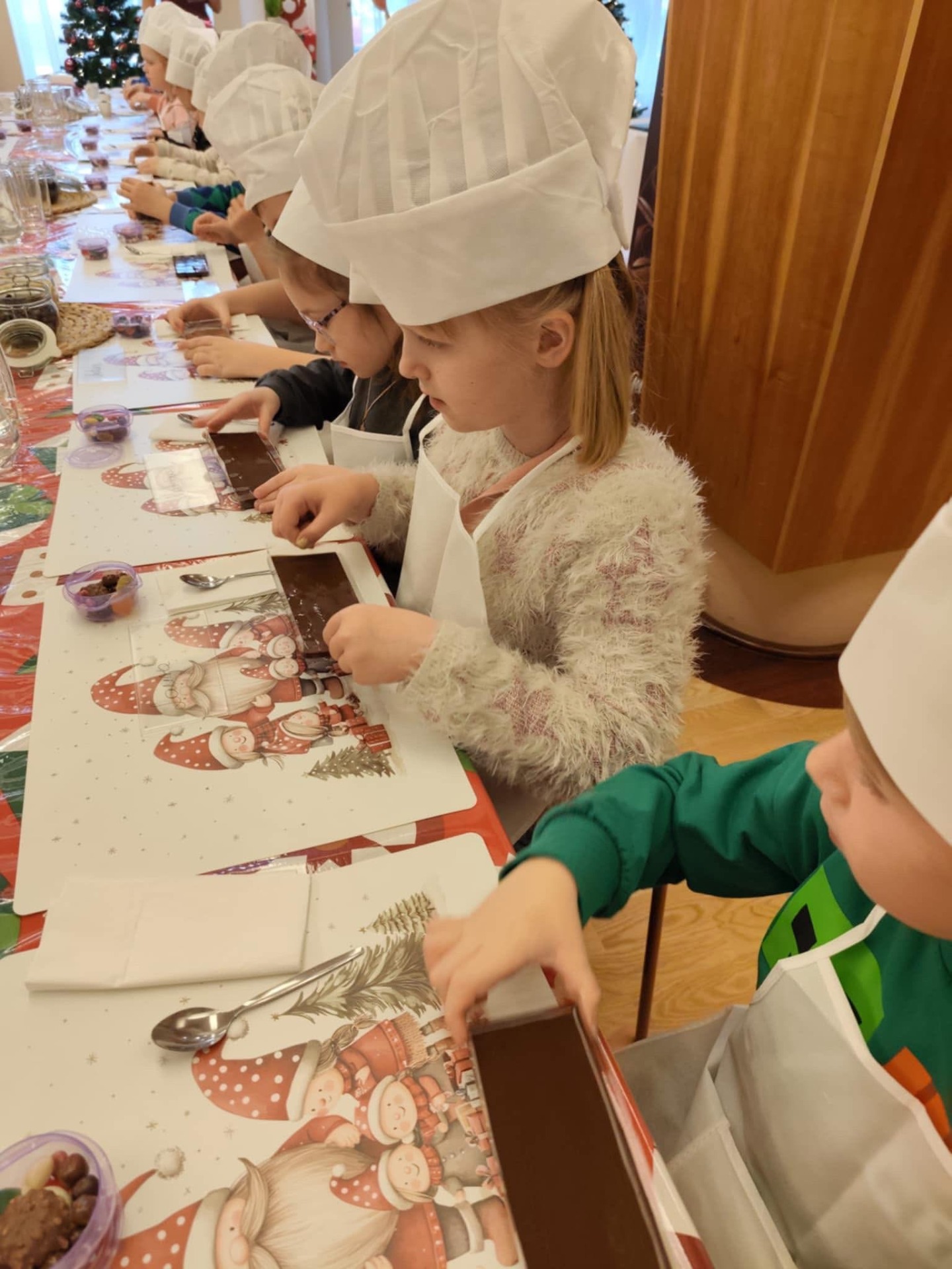 Zanim dzieci zanurzyły się w słodkim świecie twórczości, obejrzały interesujący film o historii czekolady, od kakaowego ziarna aż po gotową tabliczkę. Było ciekawie, edukacyjnie i bardzo inspirująco.