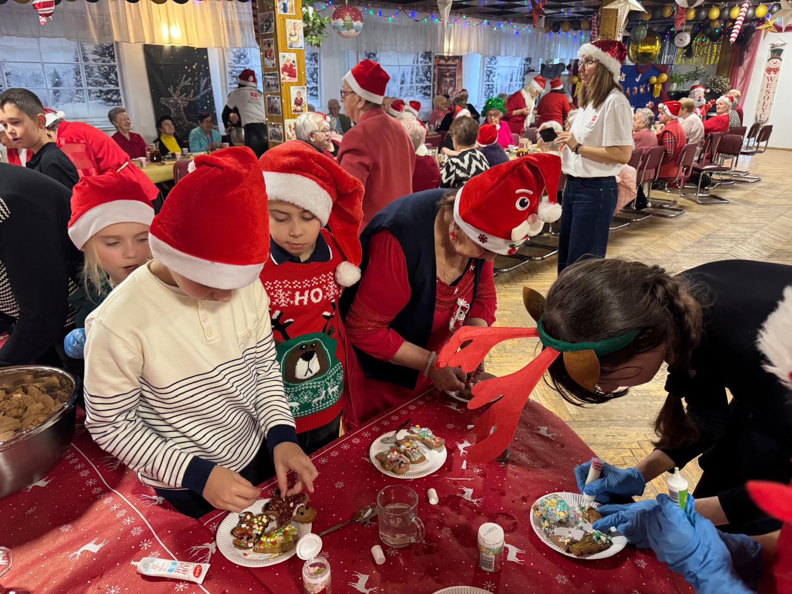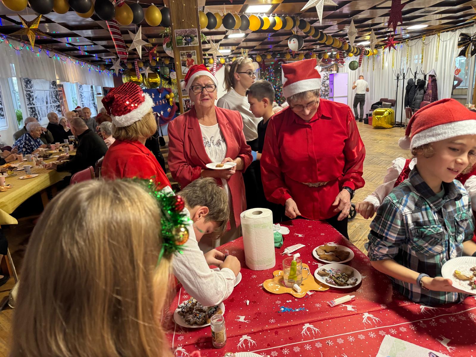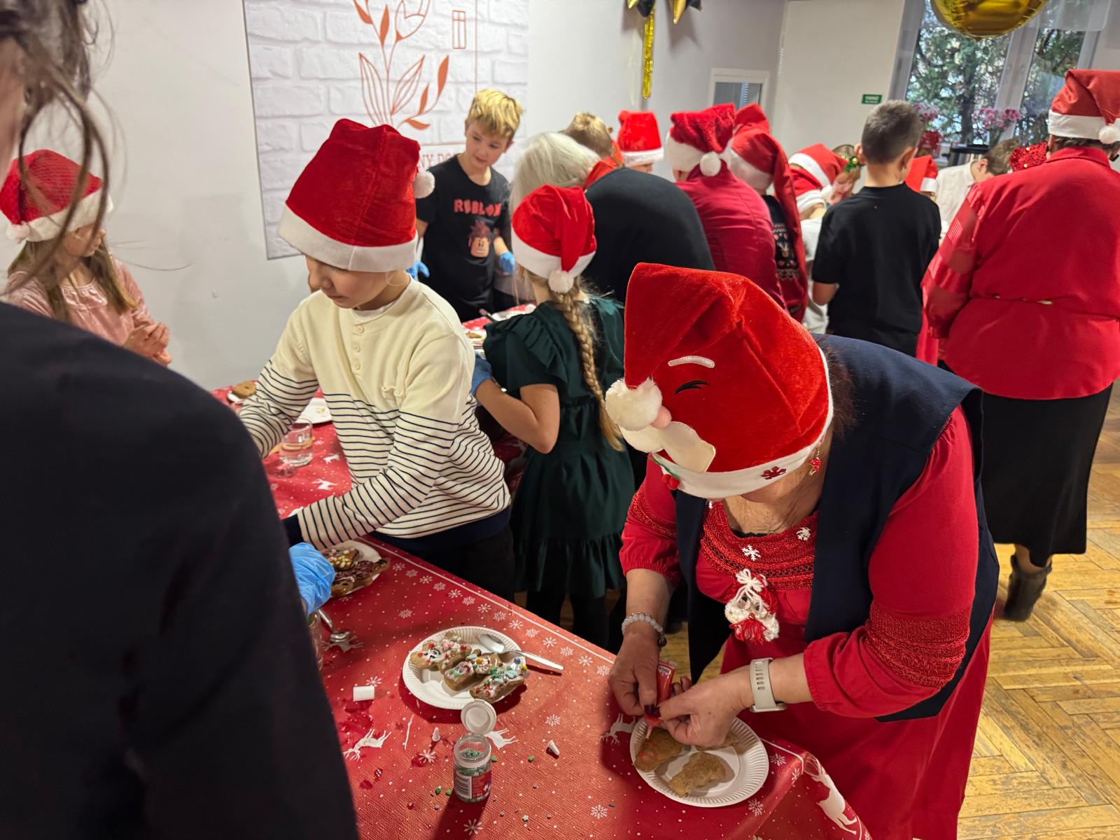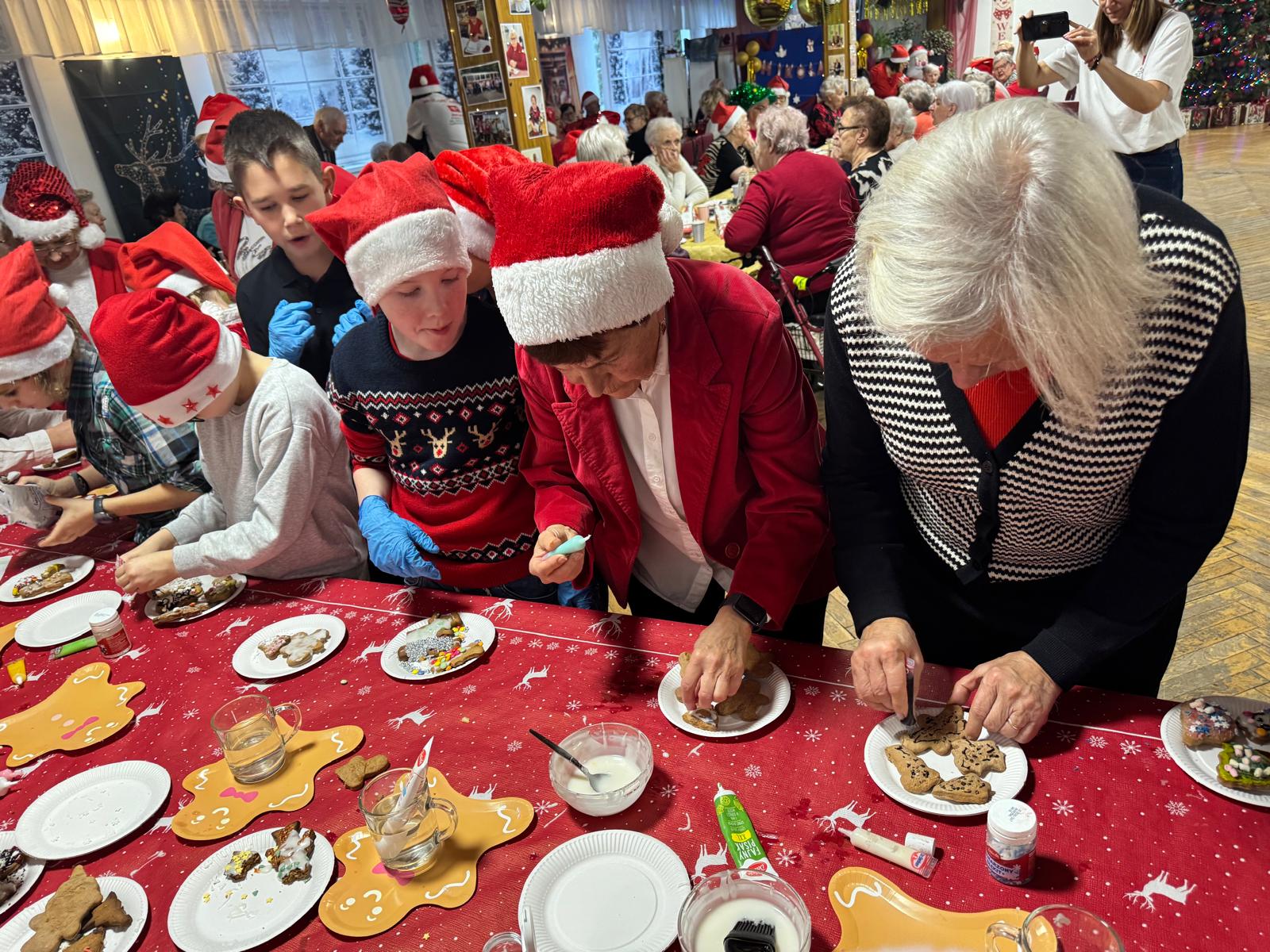 Jednym z najpiękniejszych momentów wydarzenia było wspólne dekorowanie pierniczków. Pachnące korzennymi przyprawami ciasteczka, wcześniej przygotowane przez uczestników projektu, zamieniały się w małe dzieła sztuki dzięki kreatywności dzieci i doświadczeniu seniorów. Wspólna praca przy słodkich wypiekach stawała się okazją do dzielenia się świątecznymi wspomnieniami,jak przy rodzinnym, zimowym stole.