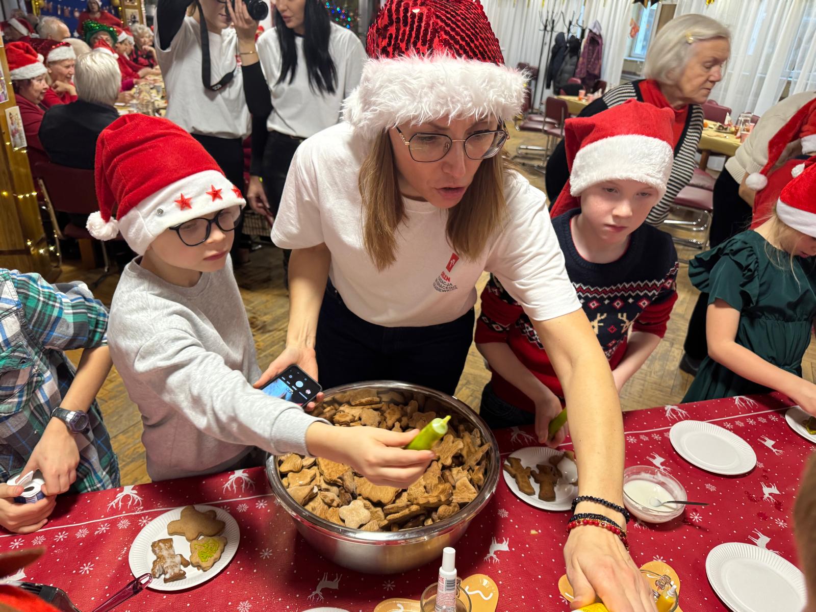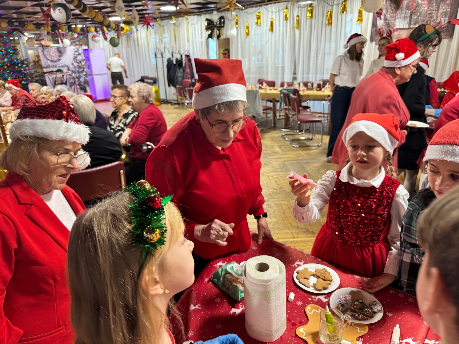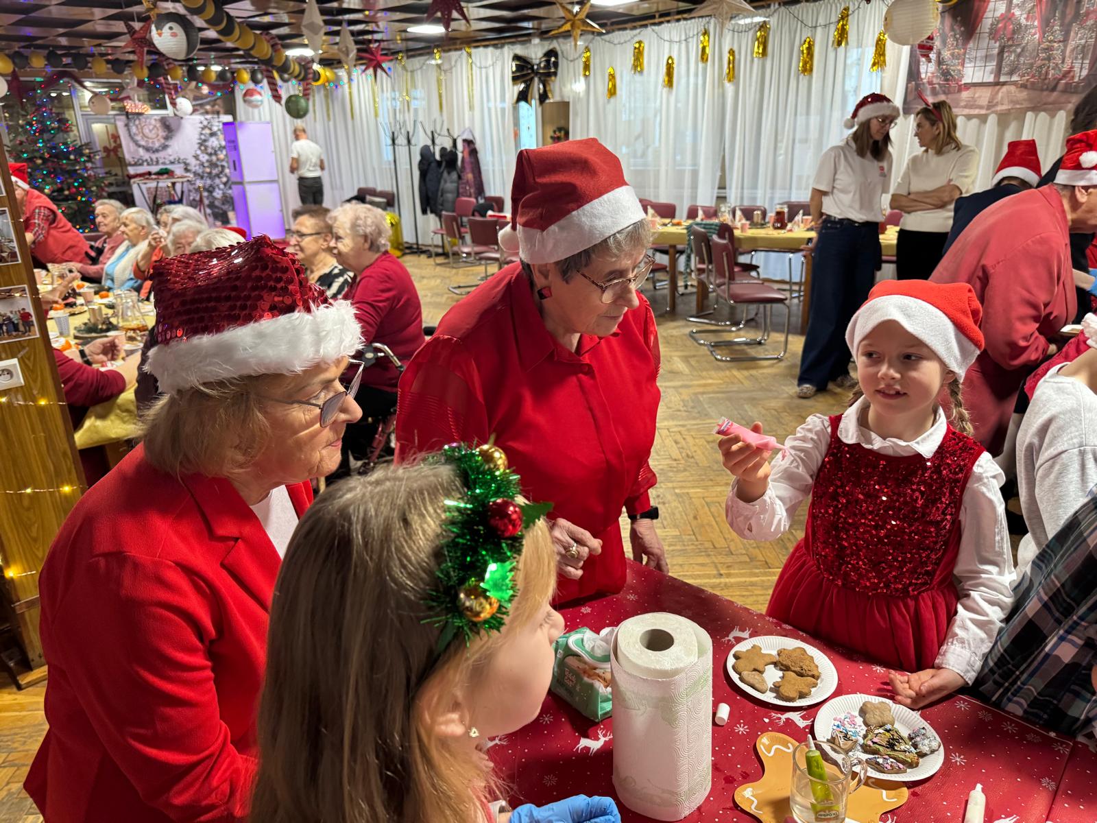 Jednym z najpiękniejszych momentów wydarzenia było wspólne dekorowanie pierniczków. Pachnące korzennymi przyprawami ciasteczka, wcześniej przygotowane przez uczestników projektu, zamieniały się w małe dzieła sztuki dzięki kreatywności dzieci i doświadczeniu seniorów. Wspólna praca przy słodkich wypiekach stawała się okazją do dzielenia się świątecznymi wspomnieniami,jak przy rodzinnym, zimowym stole.