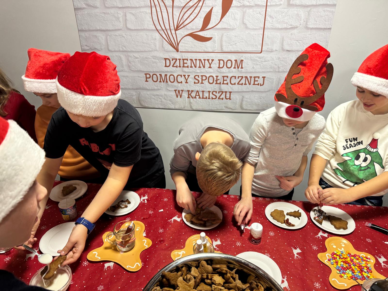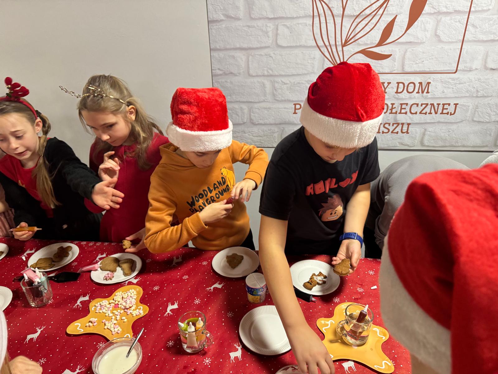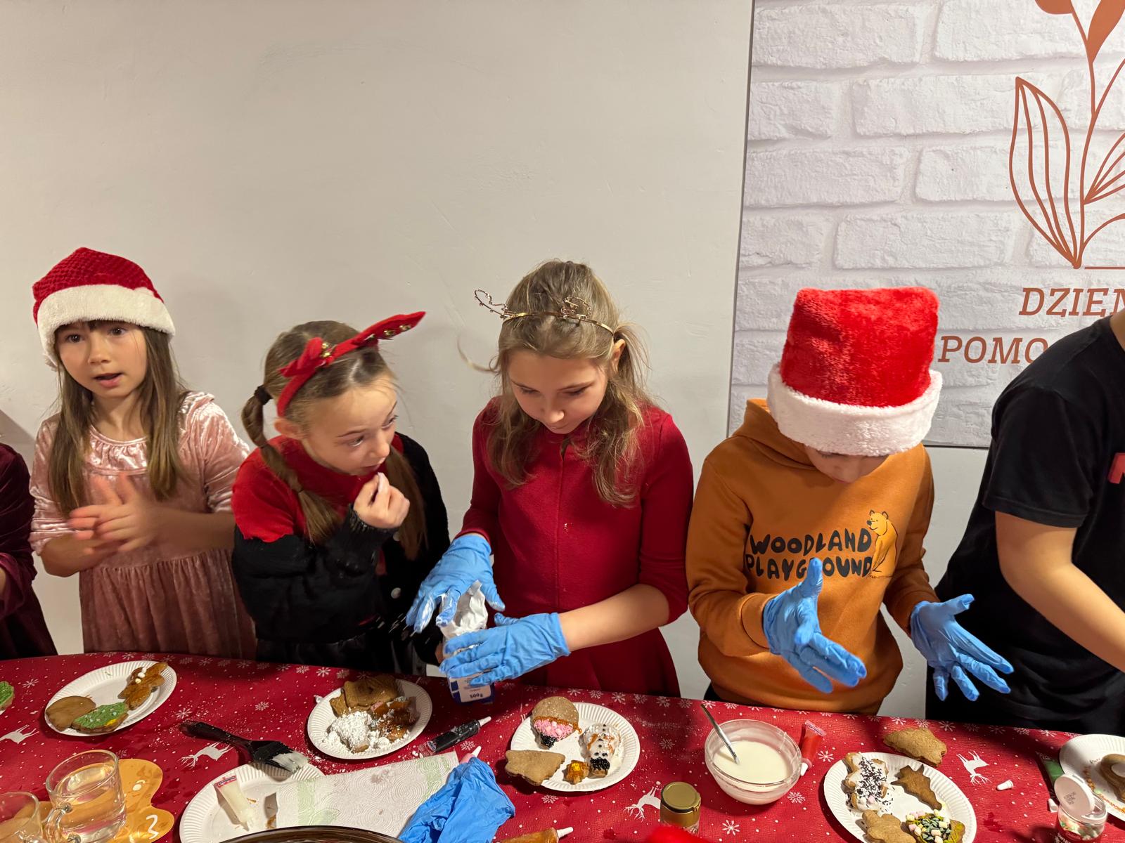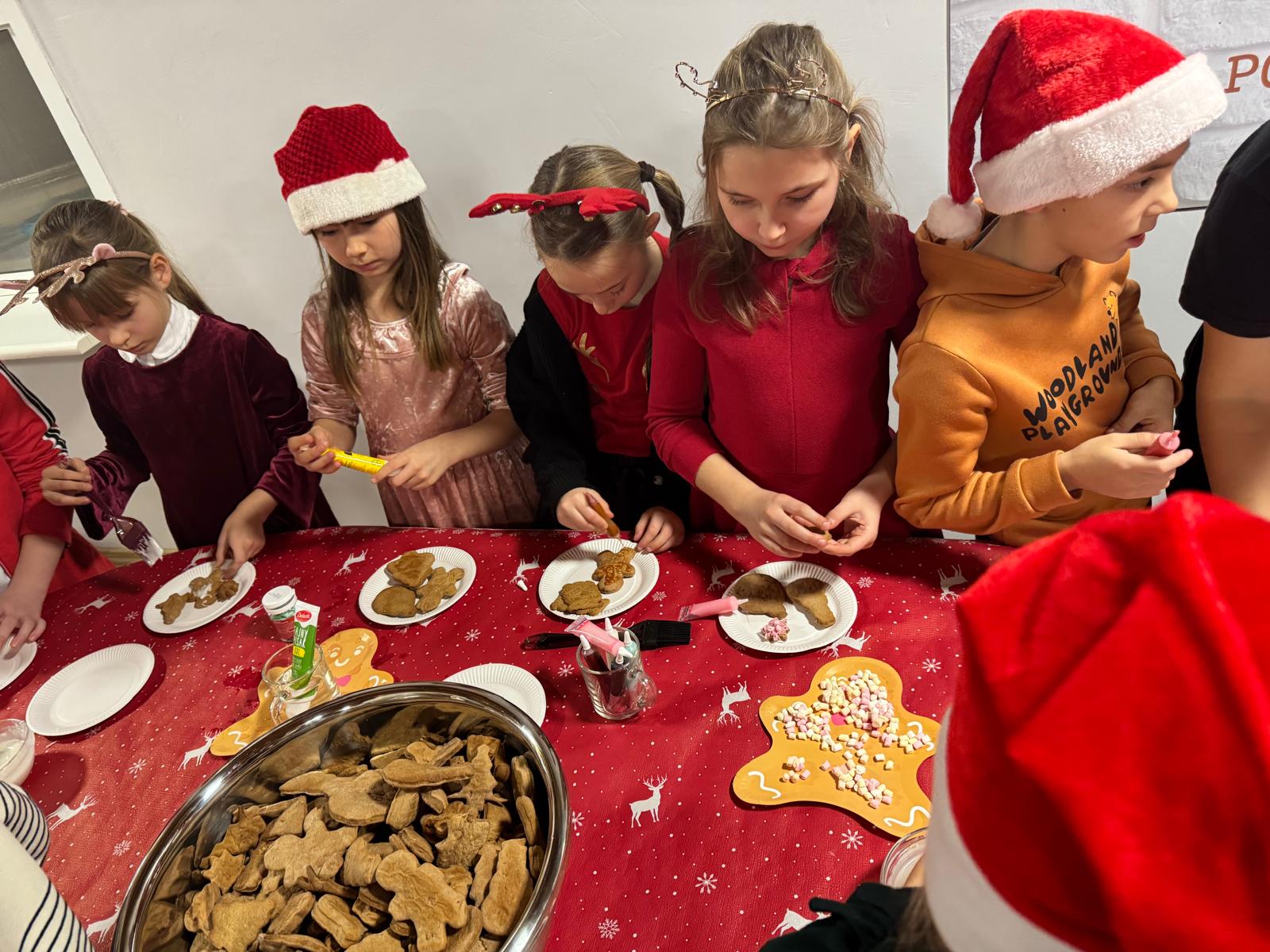 Jednym z najpiękniejszych momentów wydarzenia było wspólne dekorowanie pierniczków. Pachnące korzennymi przyprawami ciasteczka, wcześniej przygotowane przez uczestników projektu, zamieniały się w małe dzieła sztuki dzięki kreatywności dzieci i doświadczeniu seniorów. Wspólna praca przy słodkich wypiekach stawała się okazją do dzielenia się świątecznymi wspomnieniami,jak przy rodzinnym, zimowym stole.
