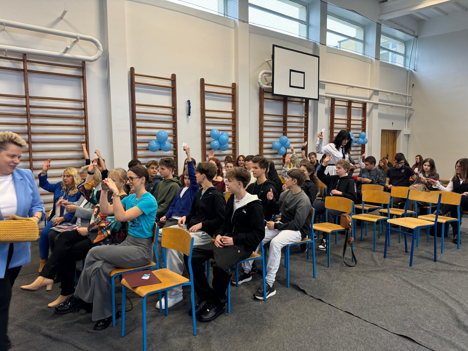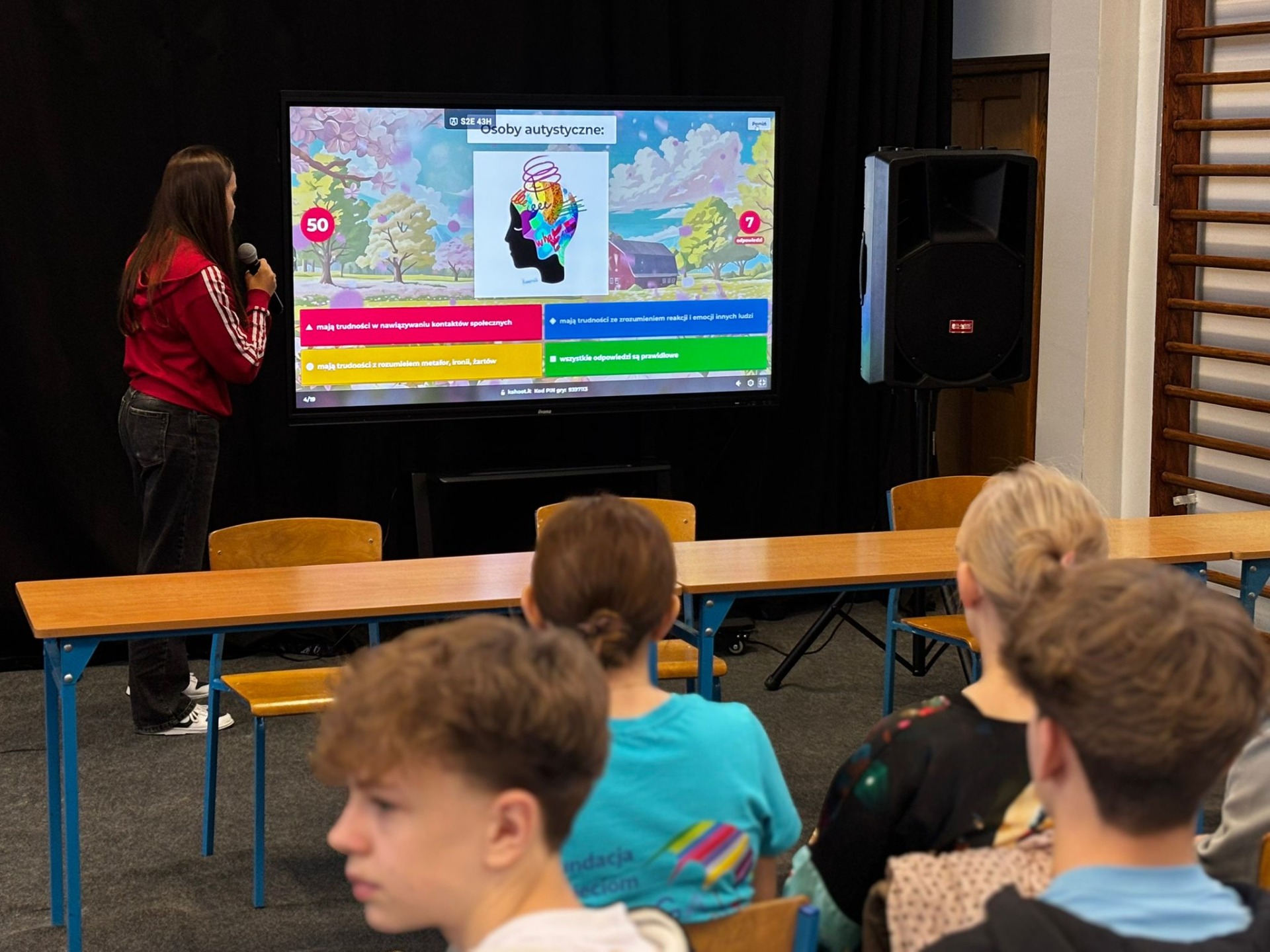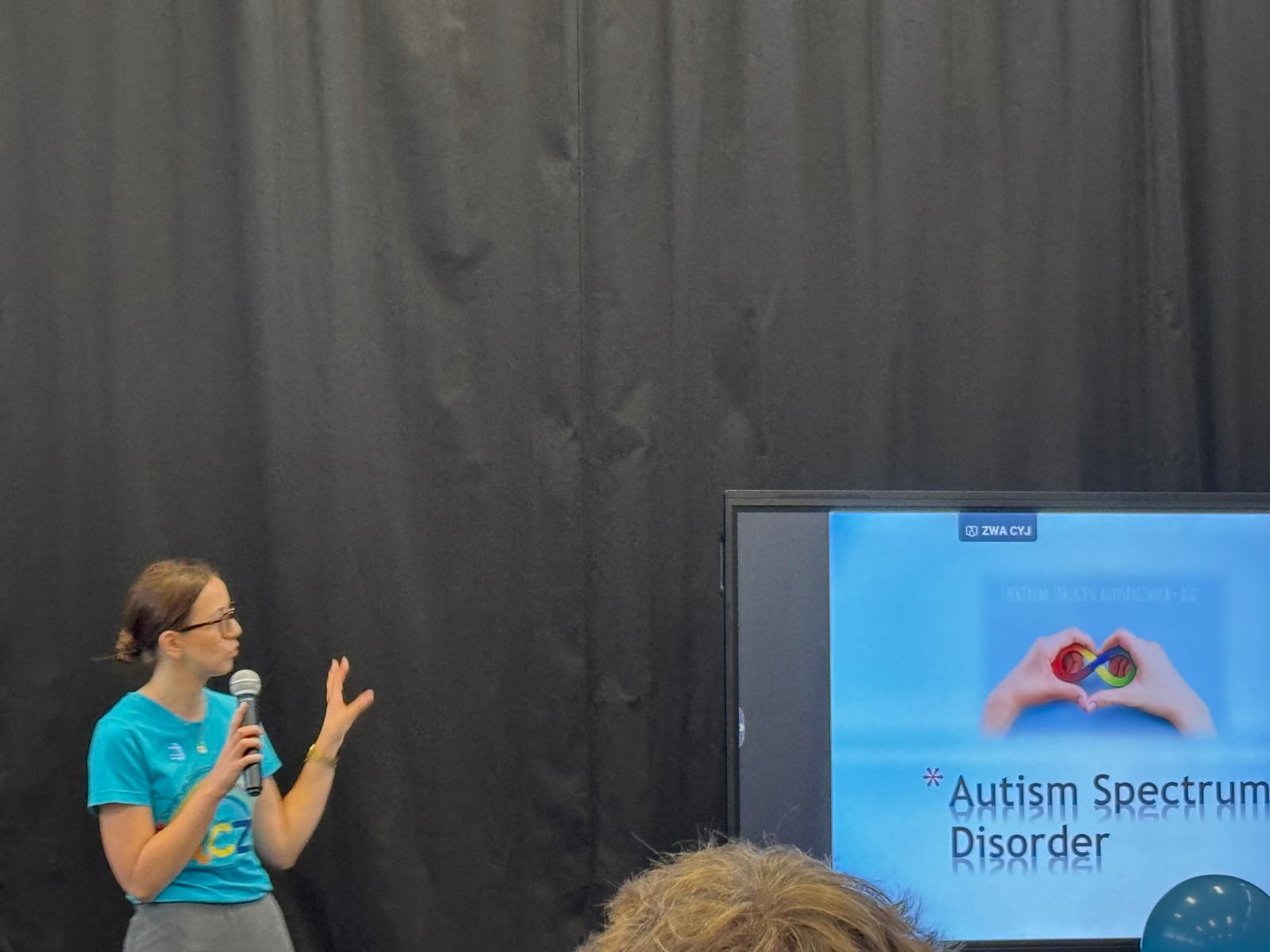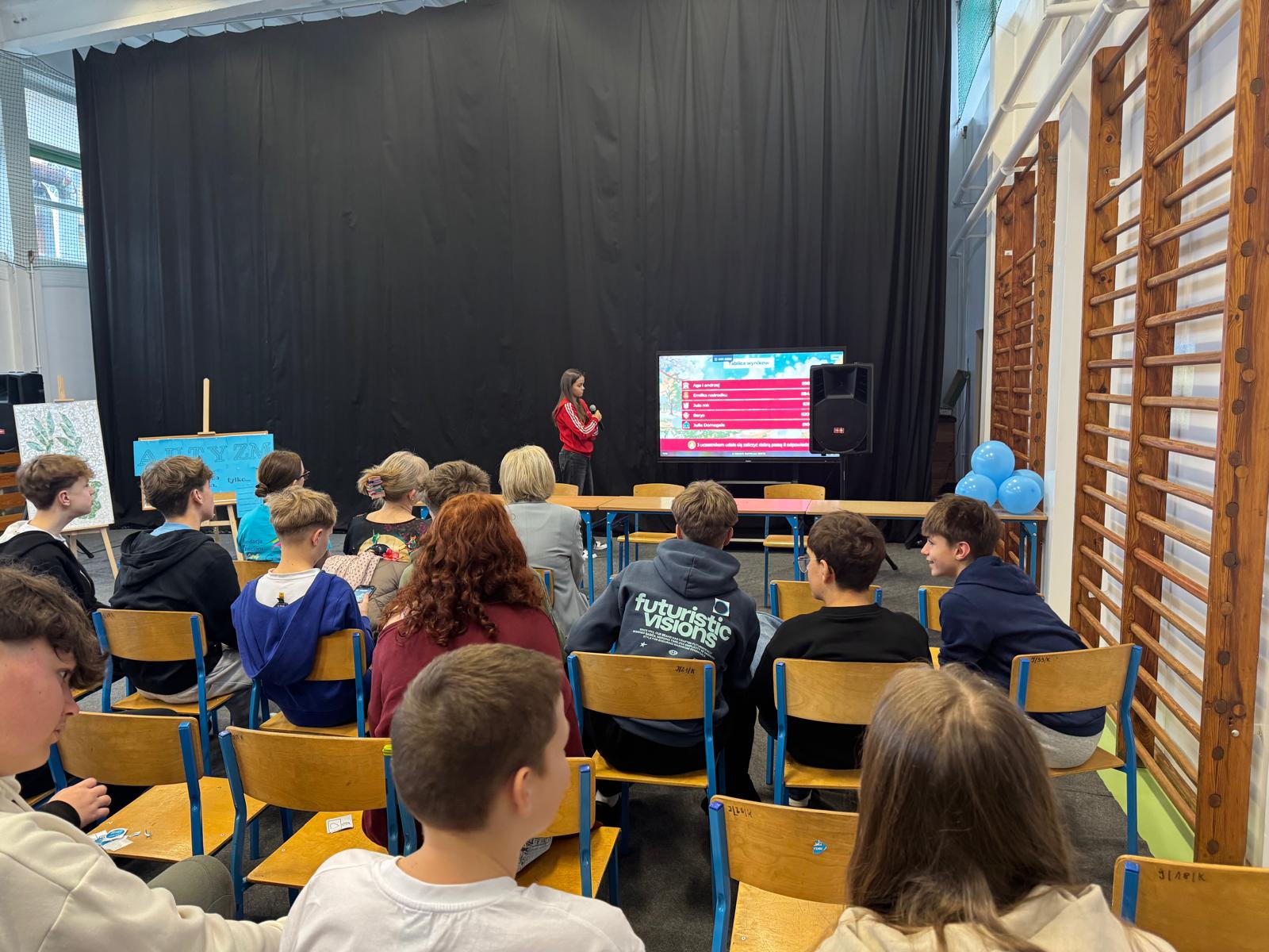 Nasi uczniowie aktywnie włączyli się w przebieg spotkania, przeprowadzając wśród uczestników quiz Kahoot, w którym można było odpowiedzieć na pytania związane z autyzmem.