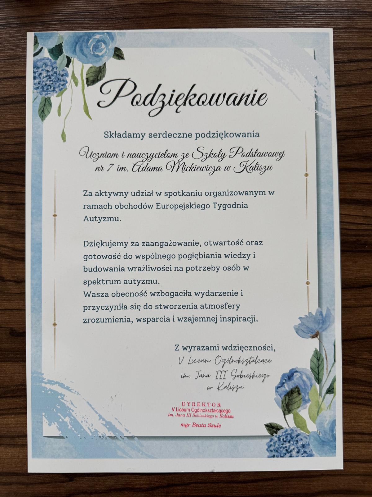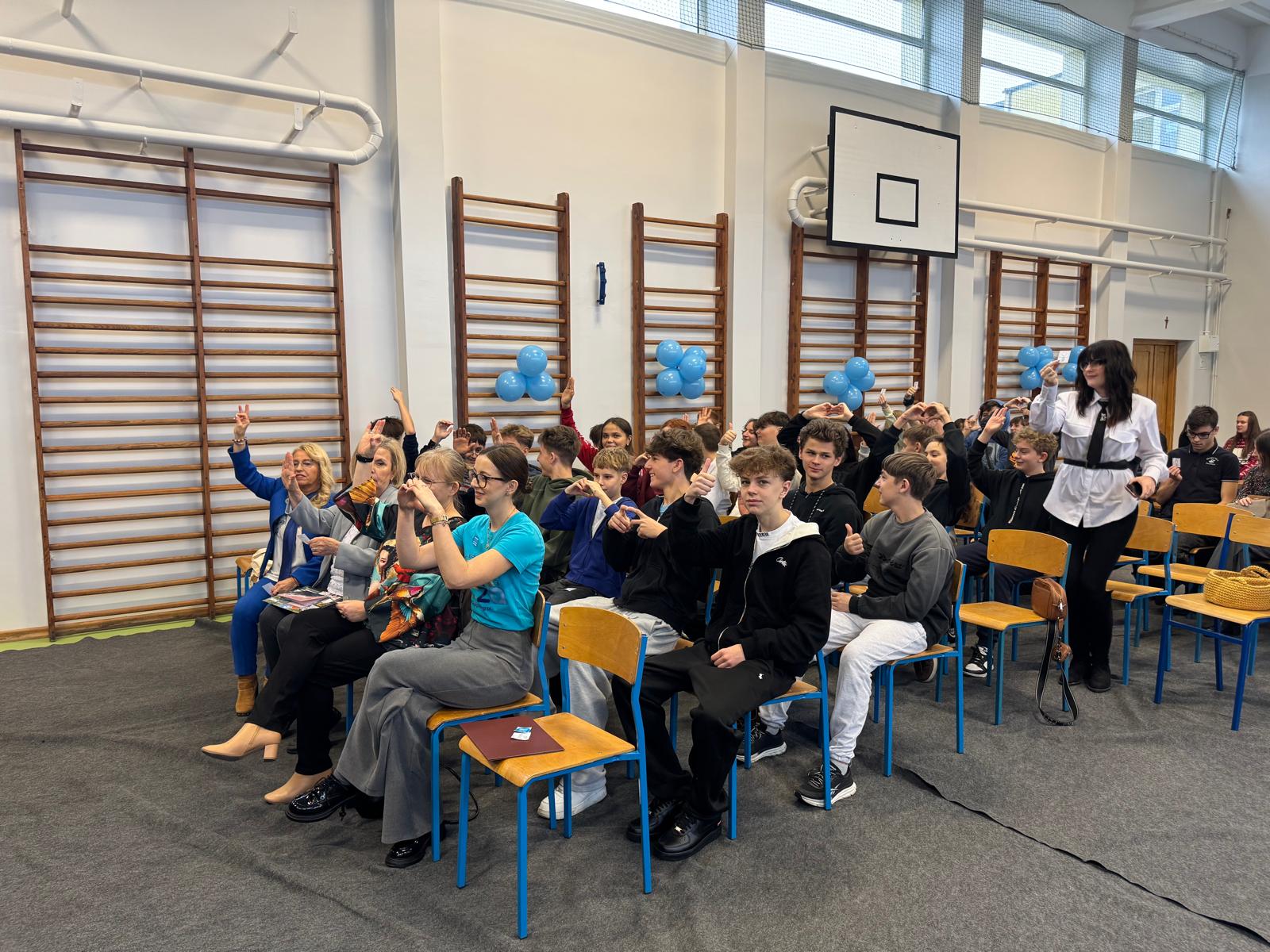 W ramach współpracy z V Liceum Ogólnokształcącym im. Jana III Sobieskiego w Kaliszu przedstawiciele klas siódmych i ósmych naszej szkoły wzięli udział w Europejskim Tygodniu Autyzmu, który odbył się pod hasłem „Cisza, Gesty i Zrozumienie”.